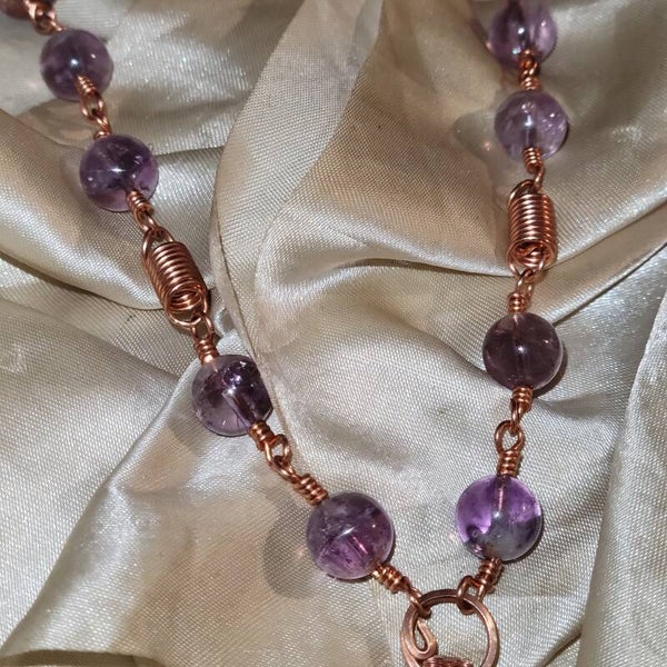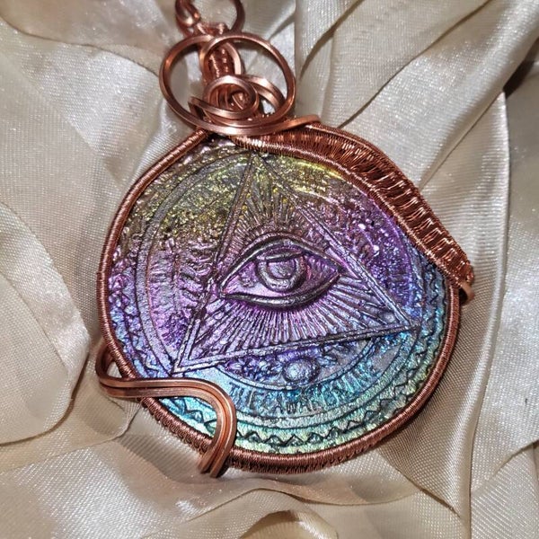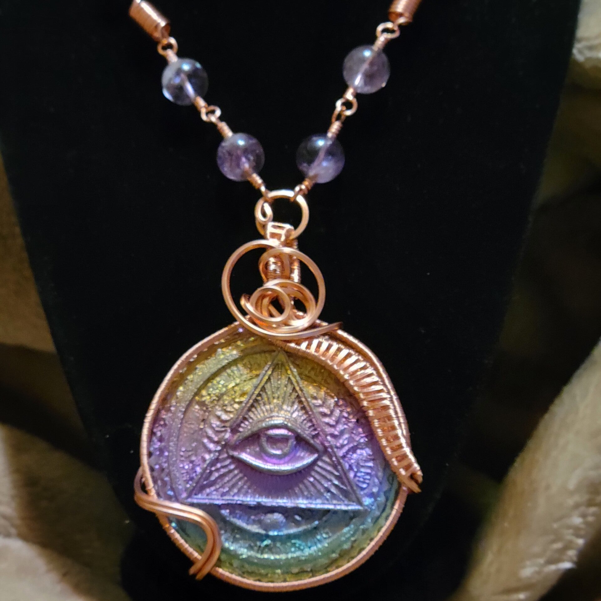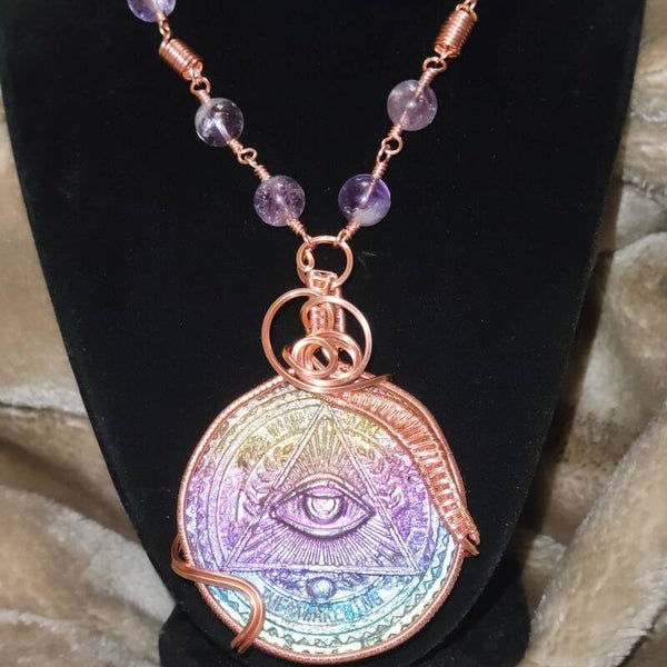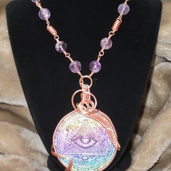 Copper wrapped Bismuth All Seeing Eye adorn with high quality Amethyst beads