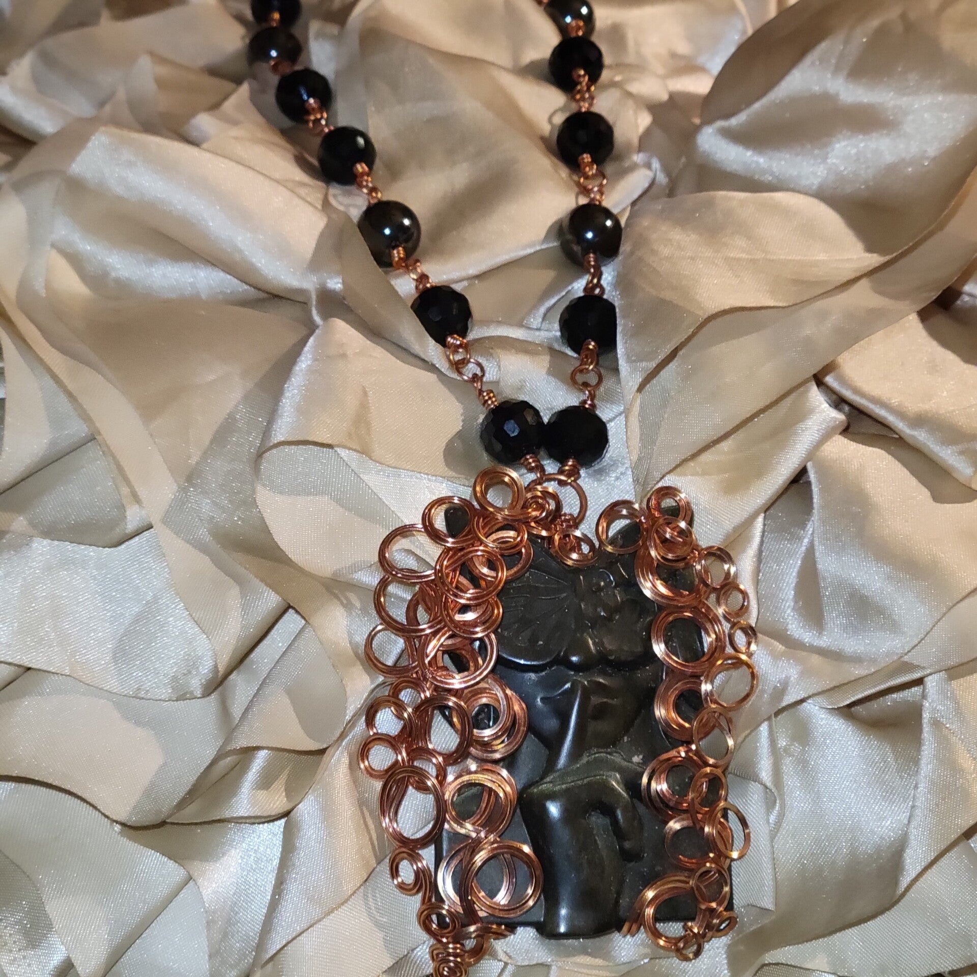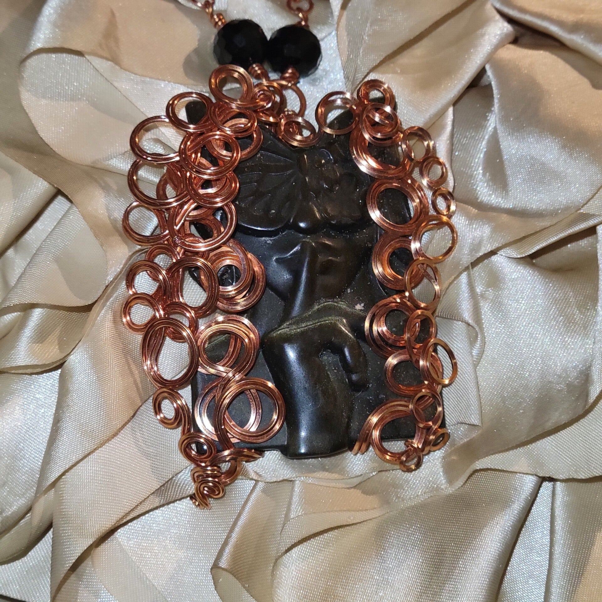 Golden Sheen Obsidian silent goddess pendant, adorn with Obsidian and Hematite beads