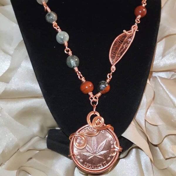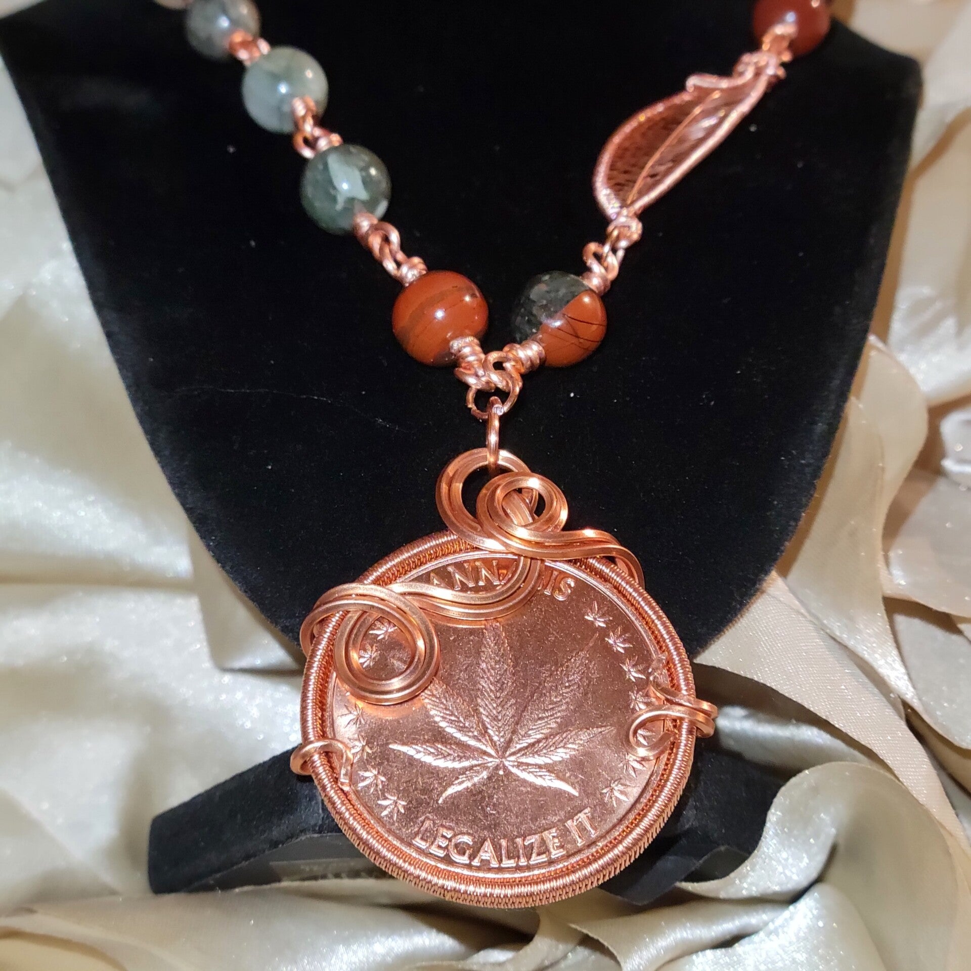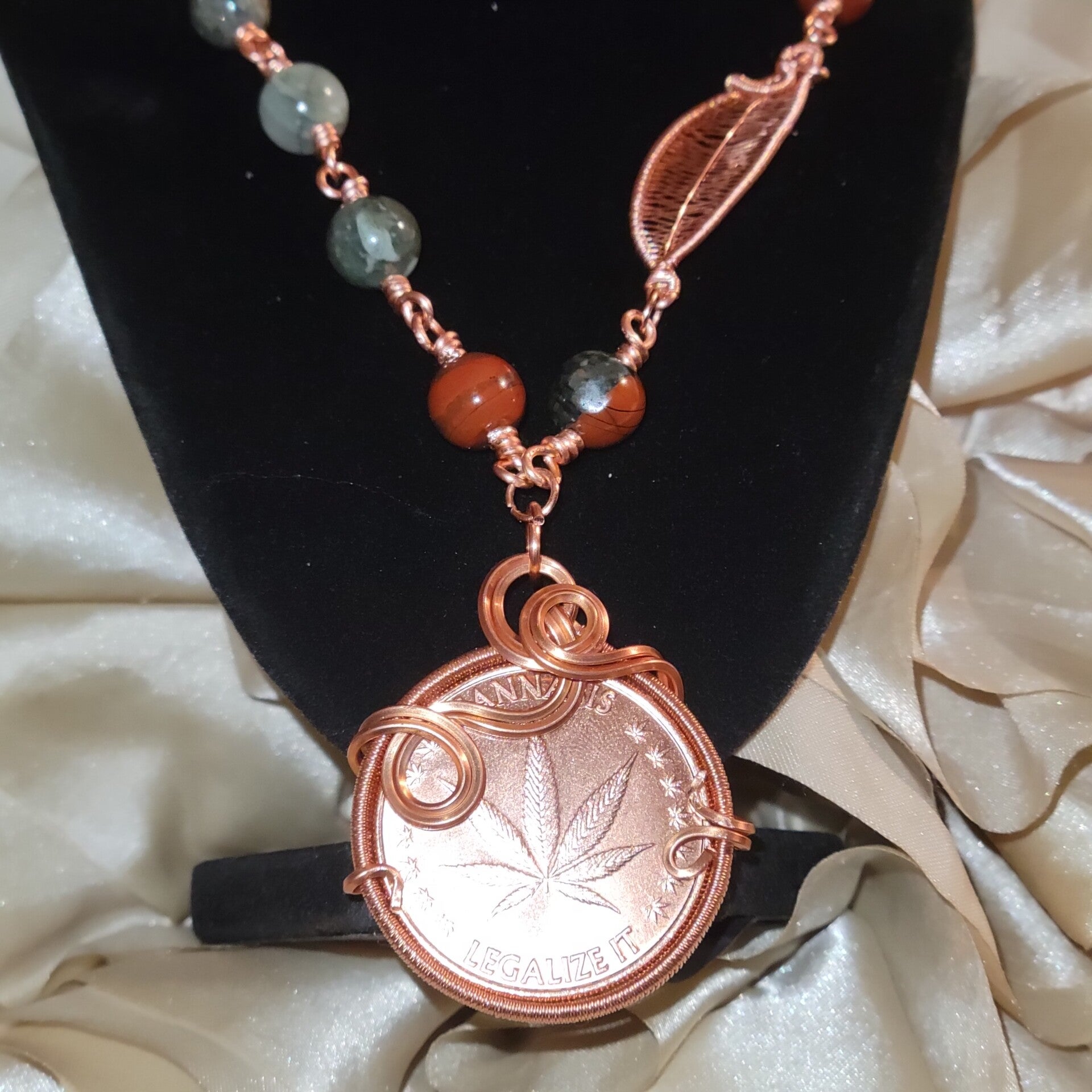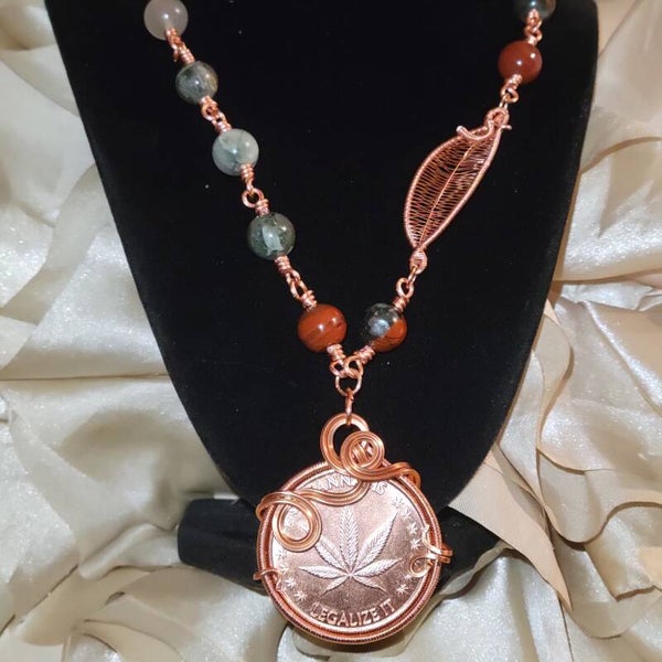 Copper coin adorn with bloodstone beads