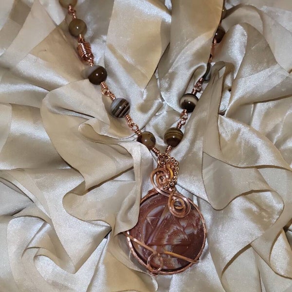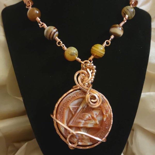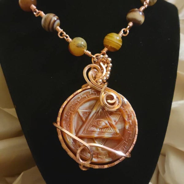 Copper wrapped Carnelian All Seeing Eye, adorn with Sardonyx beads