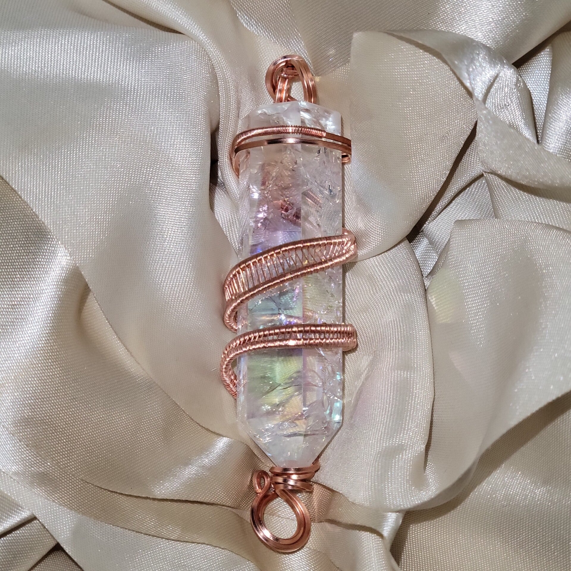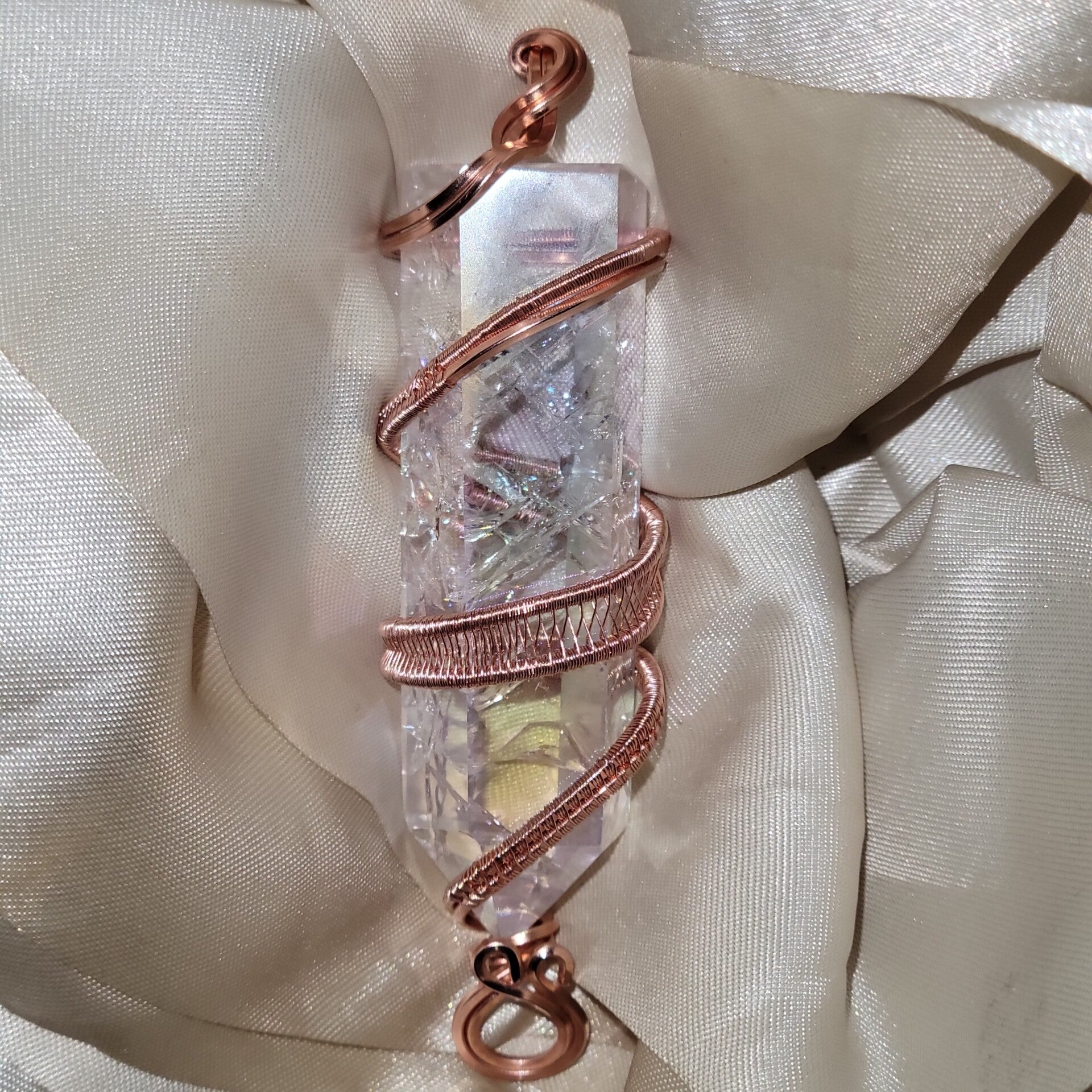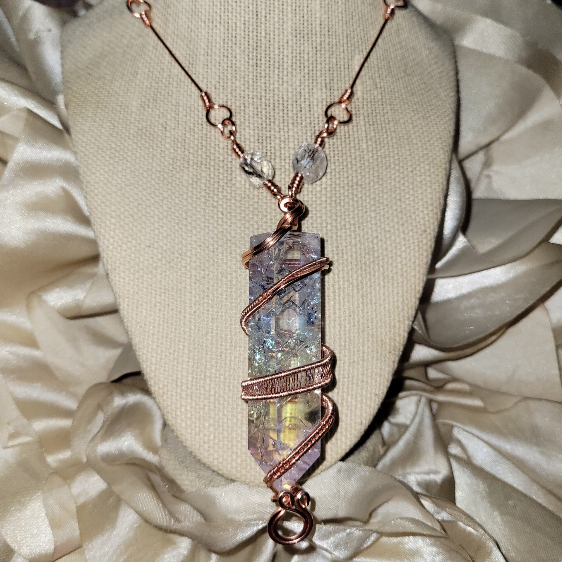 Copper wrapped Aura Quartz Tower adorn with crackle Quartz beads