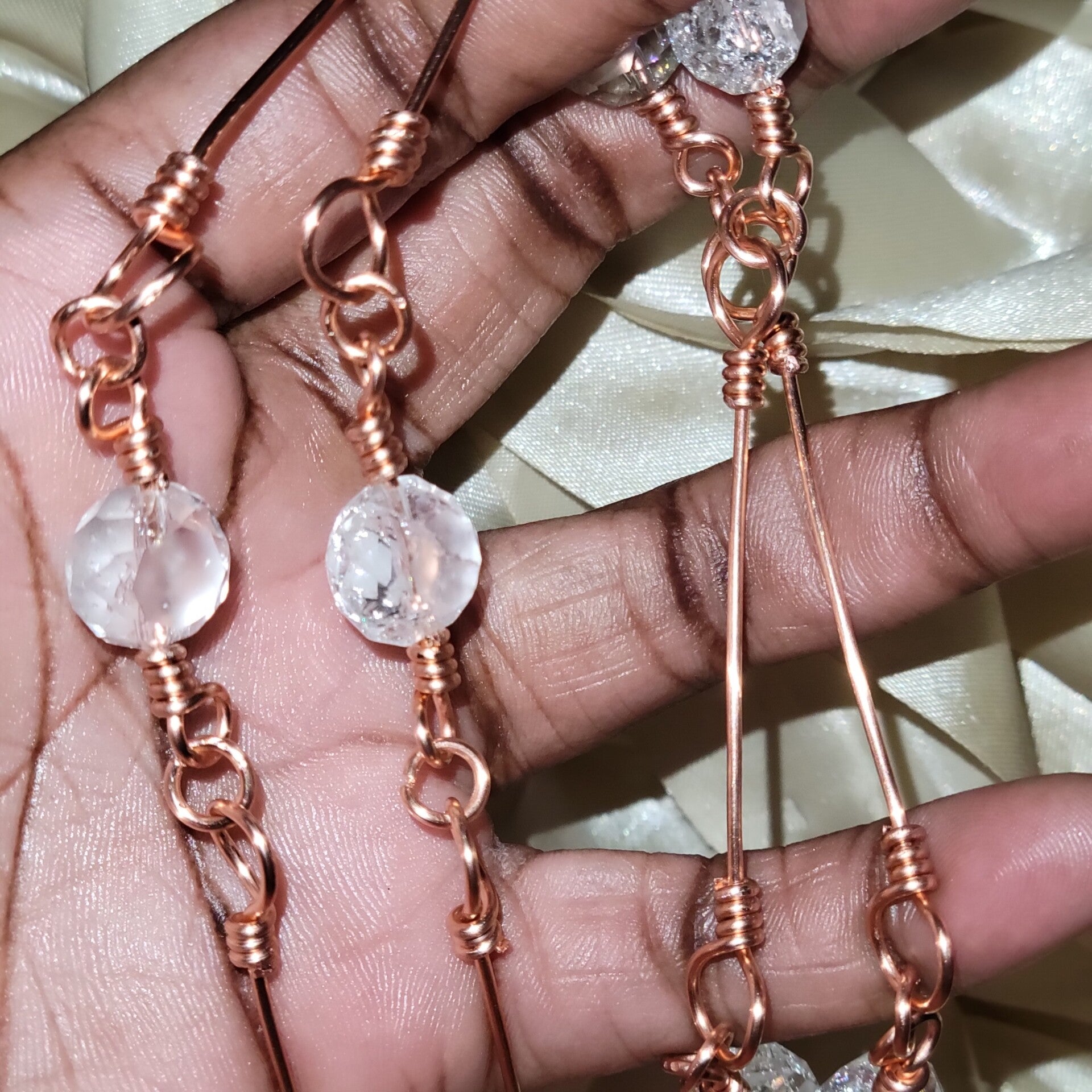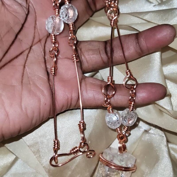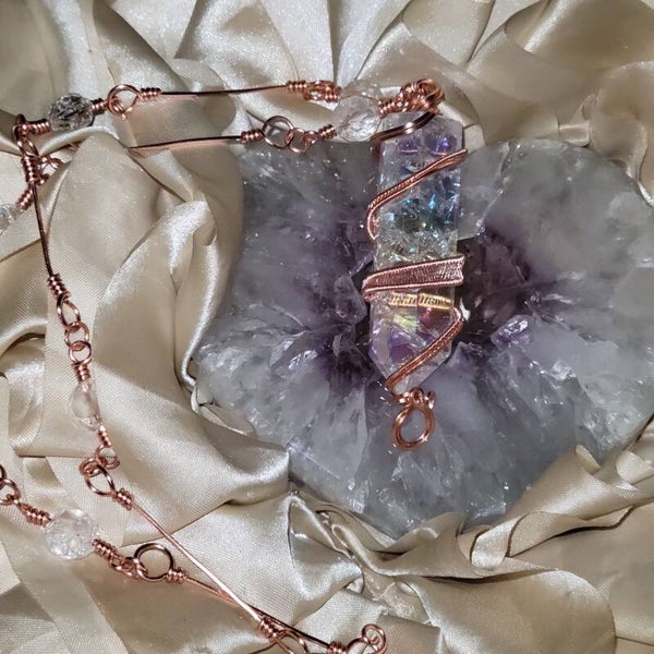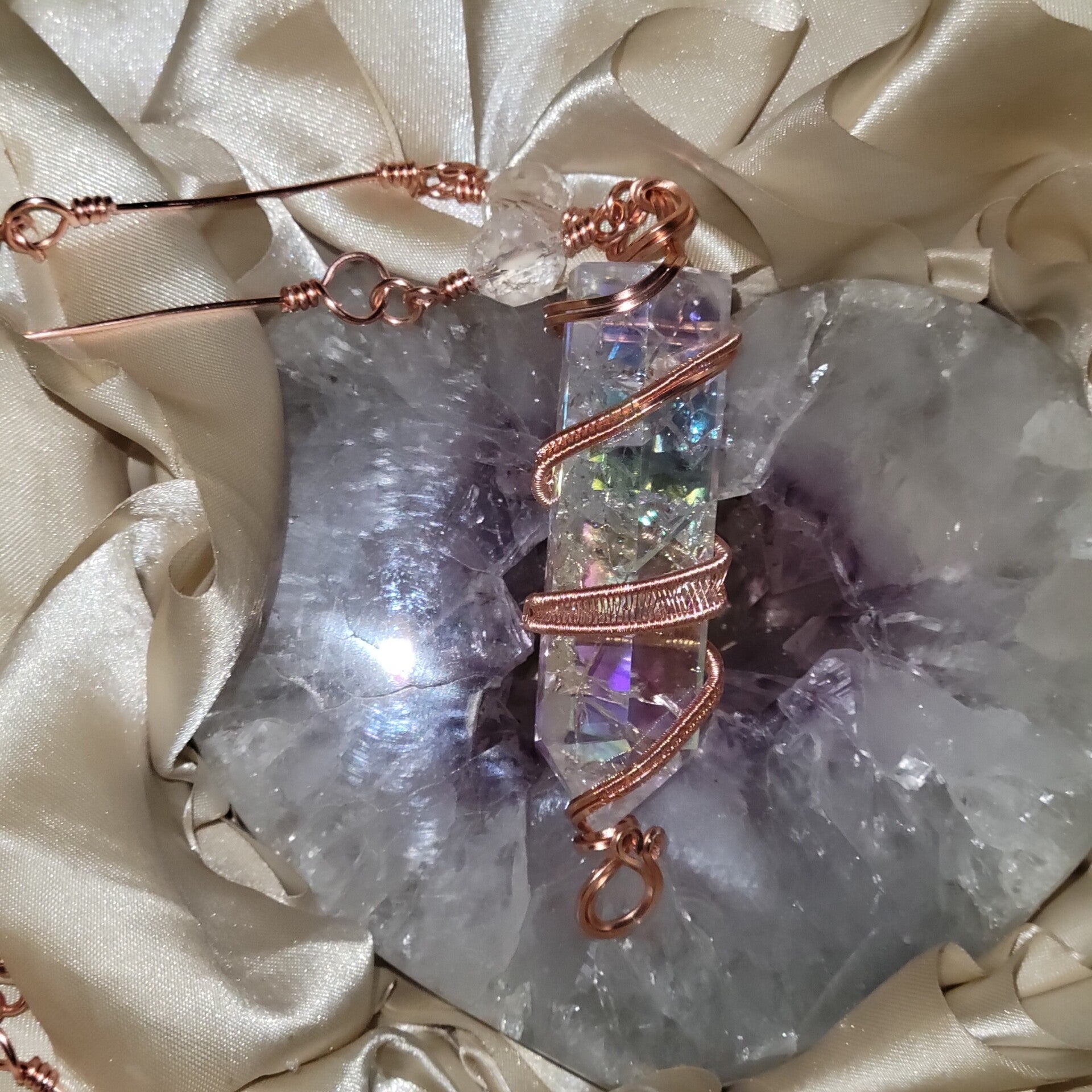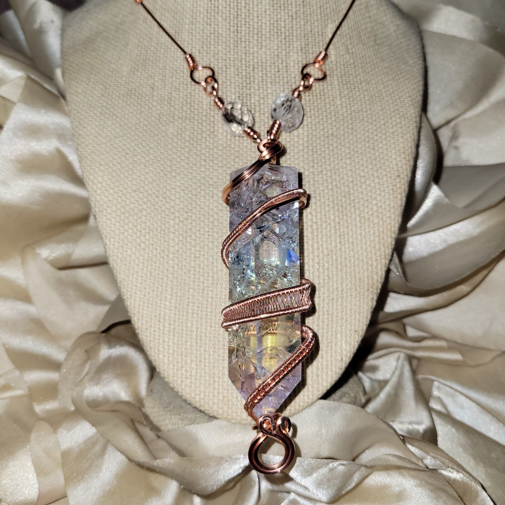 Copper wrapped Aura Quartz Tower adorn with crackle Quartz beads