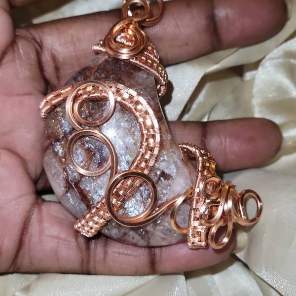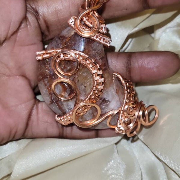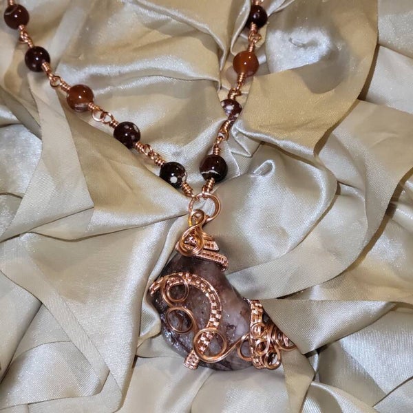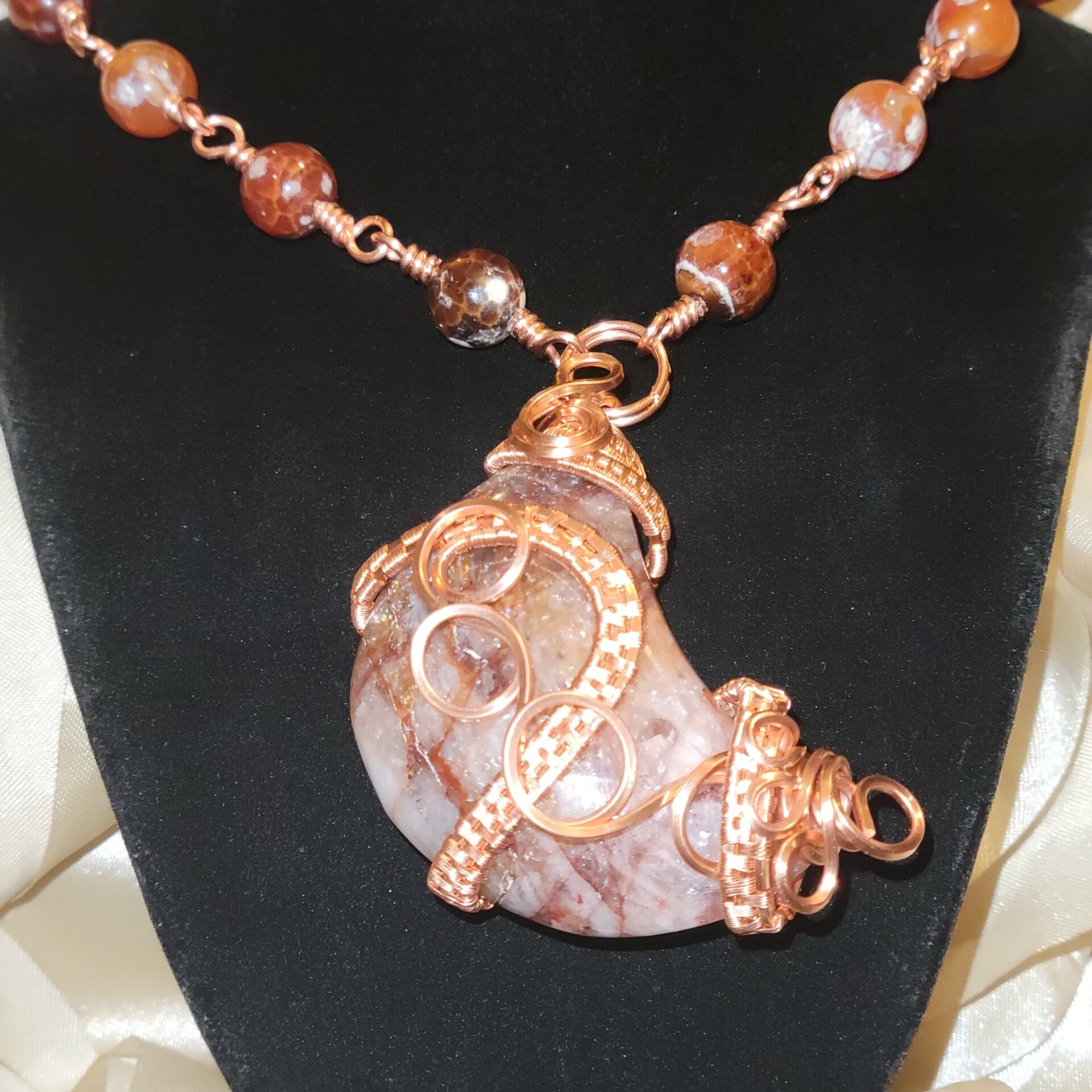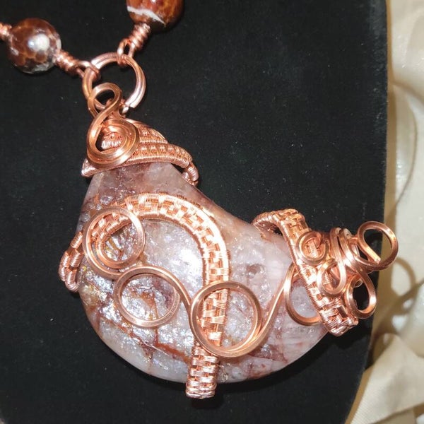 Copper wrapped Red Hematoid Quartz moon adorn with Fire agate beads