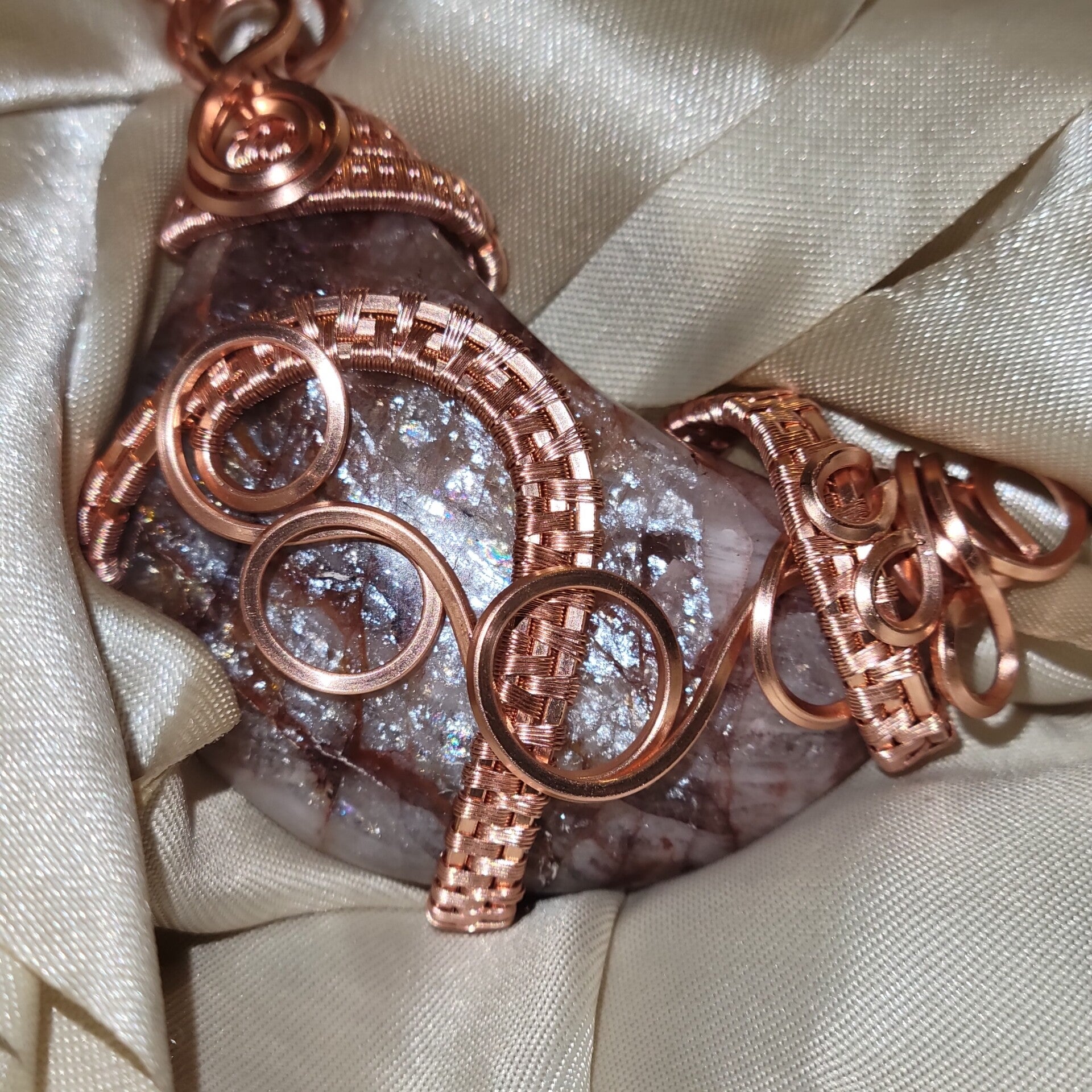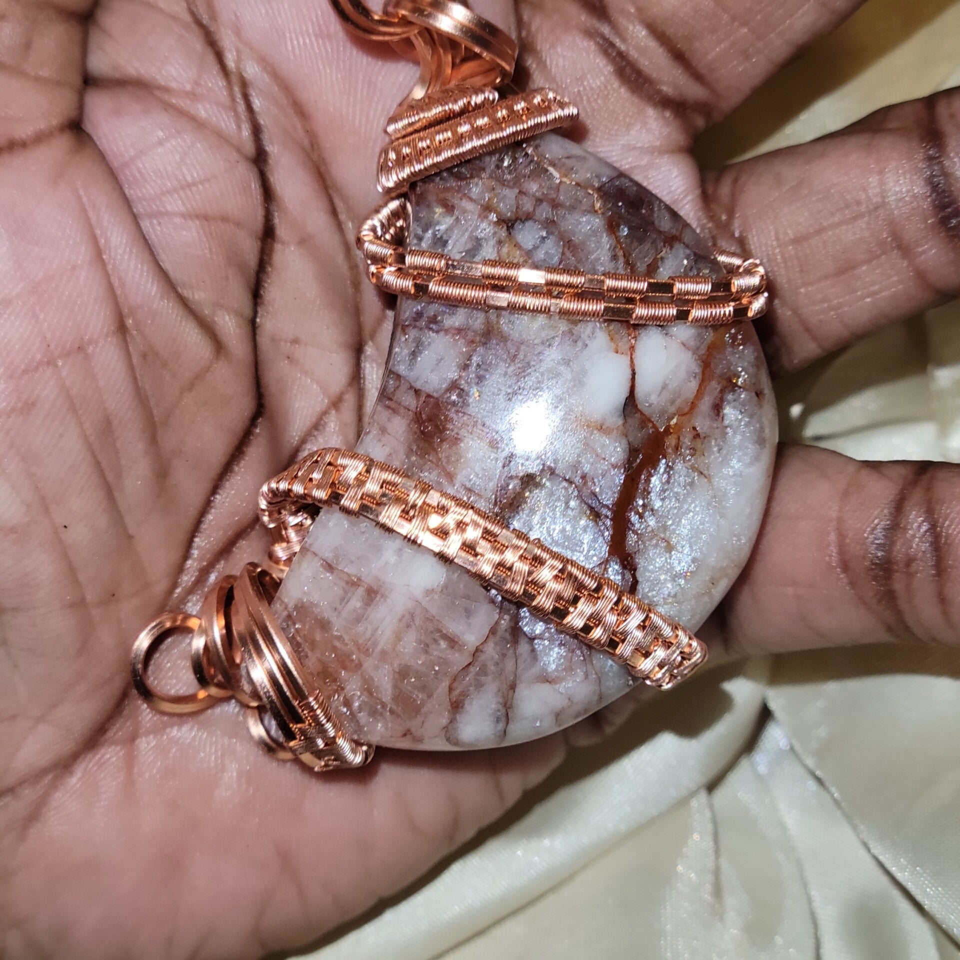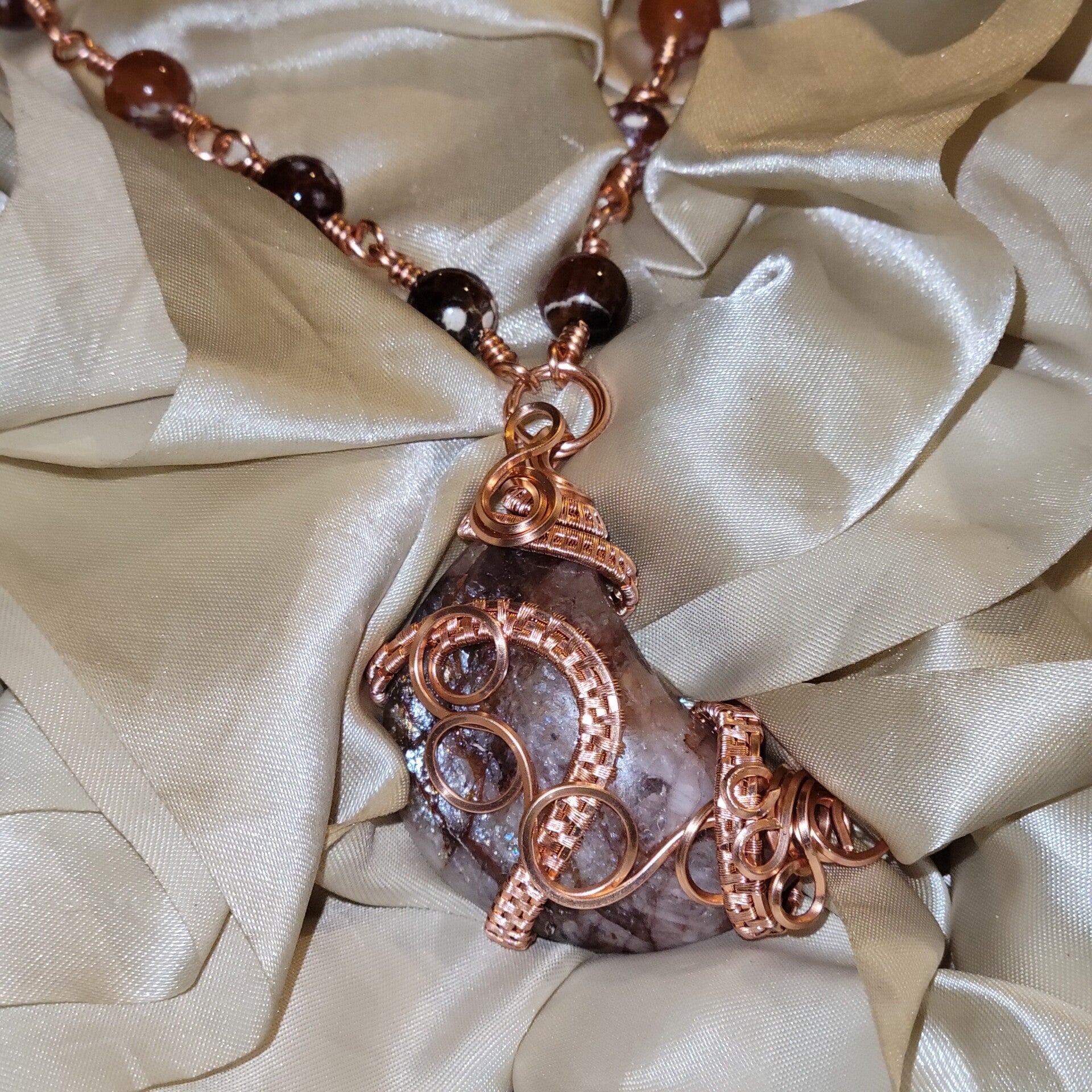 Copper wrapped Red Hematoid Quartz moon adorn with Fire agate beads