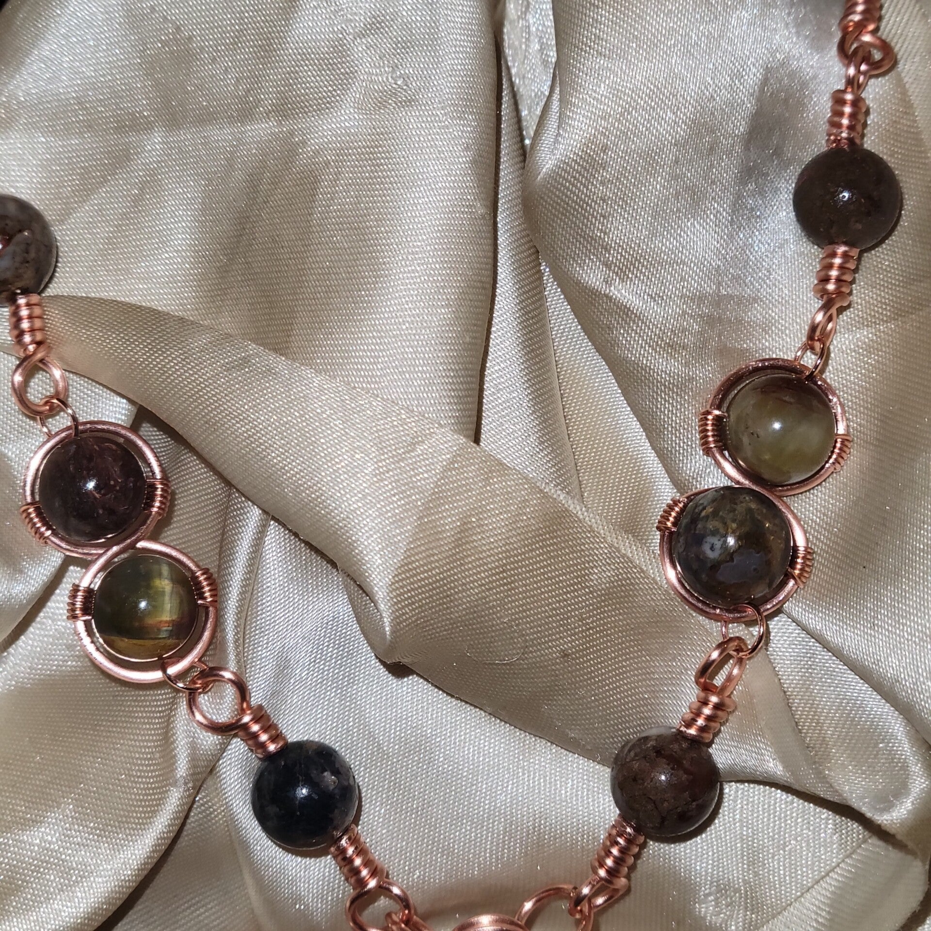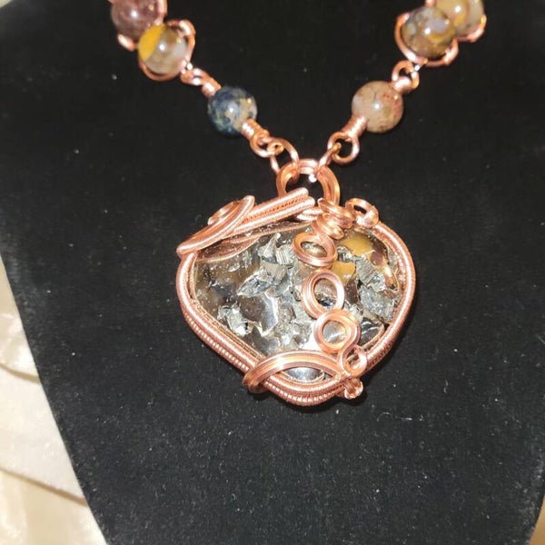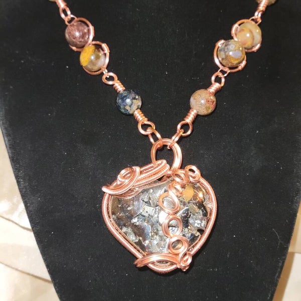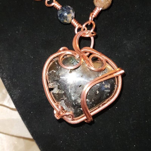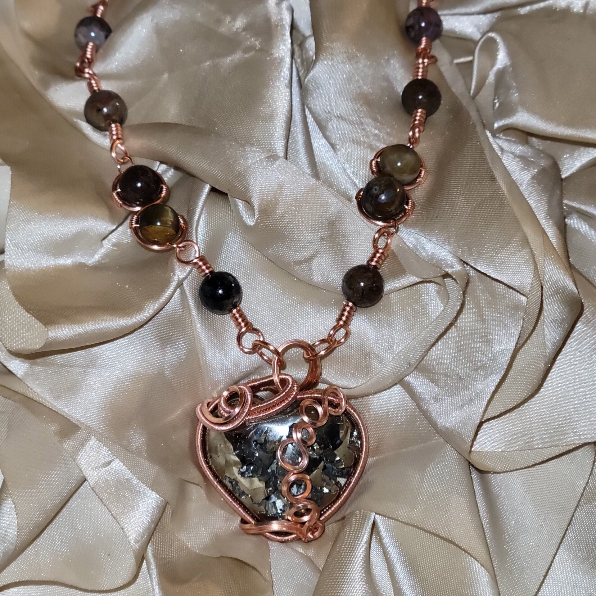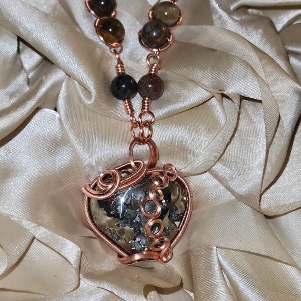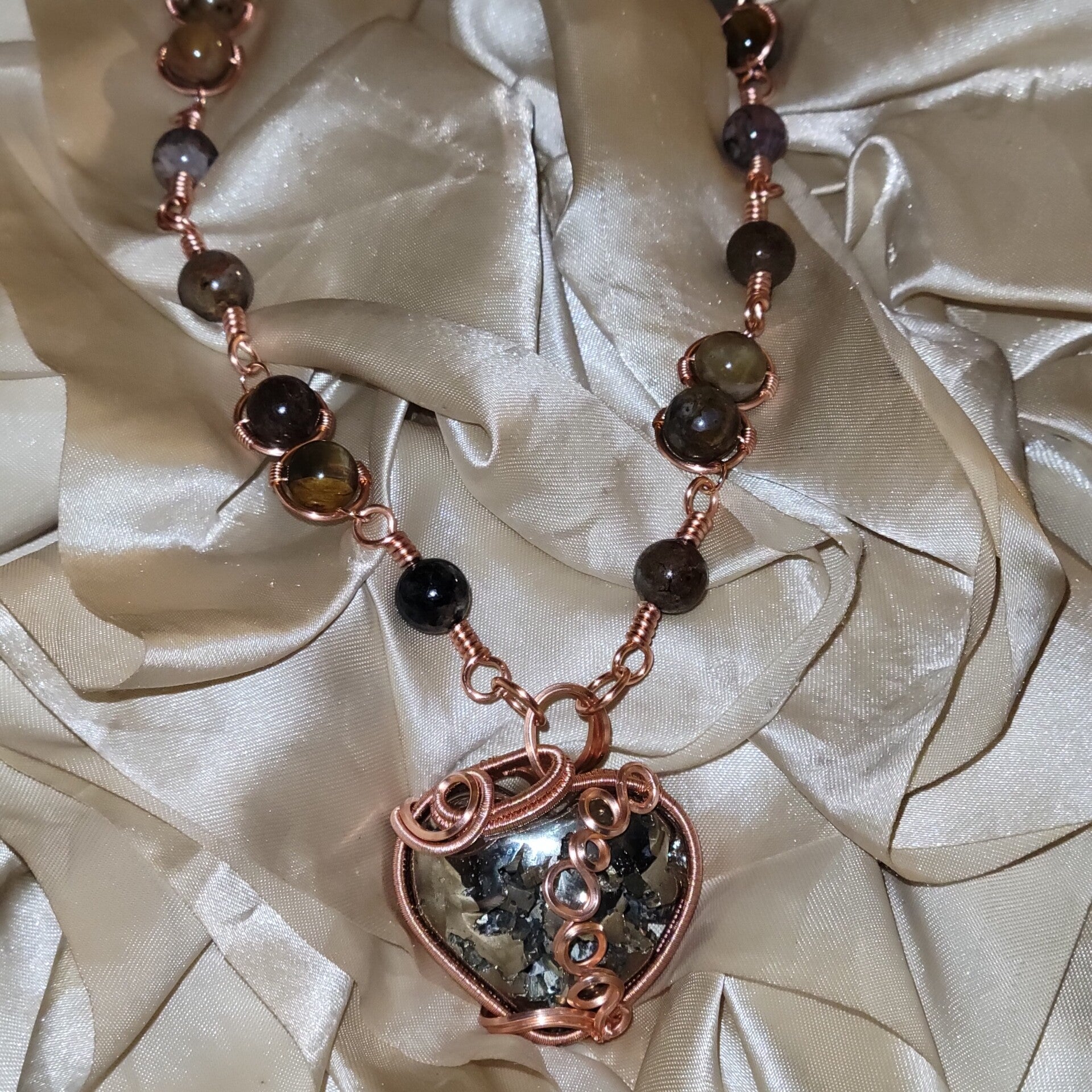 Copper wrapped Pyrite Heart adorn with Pietersite beads