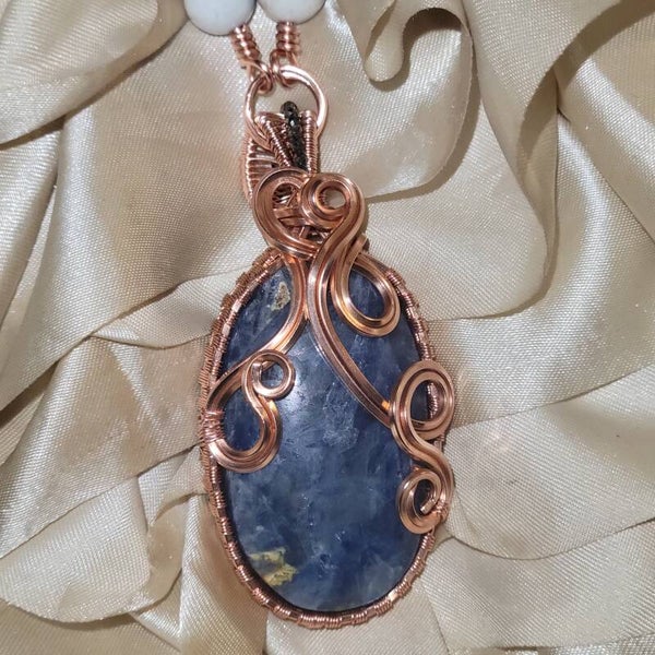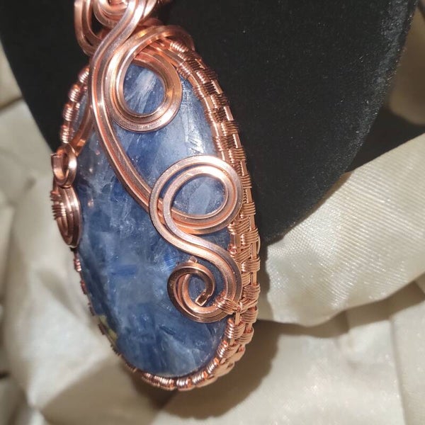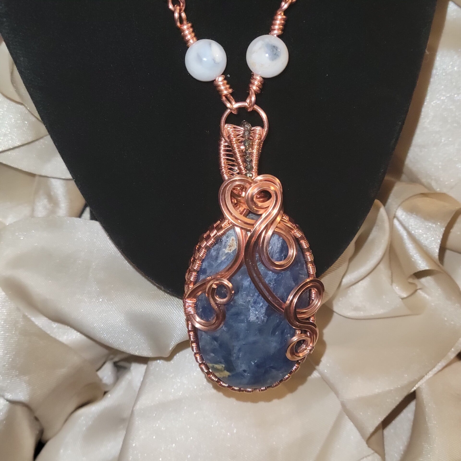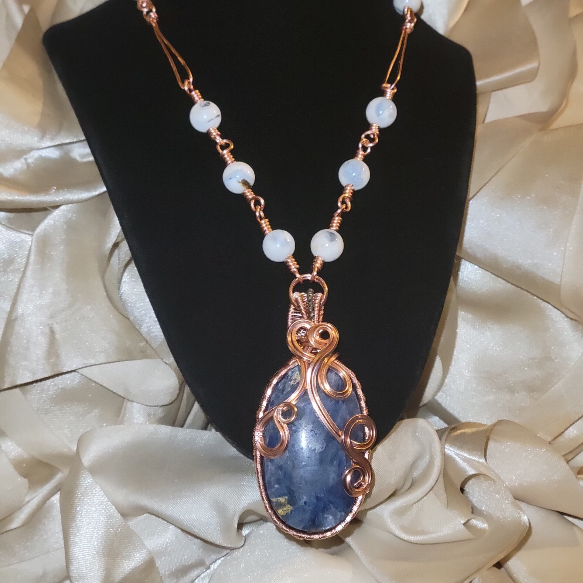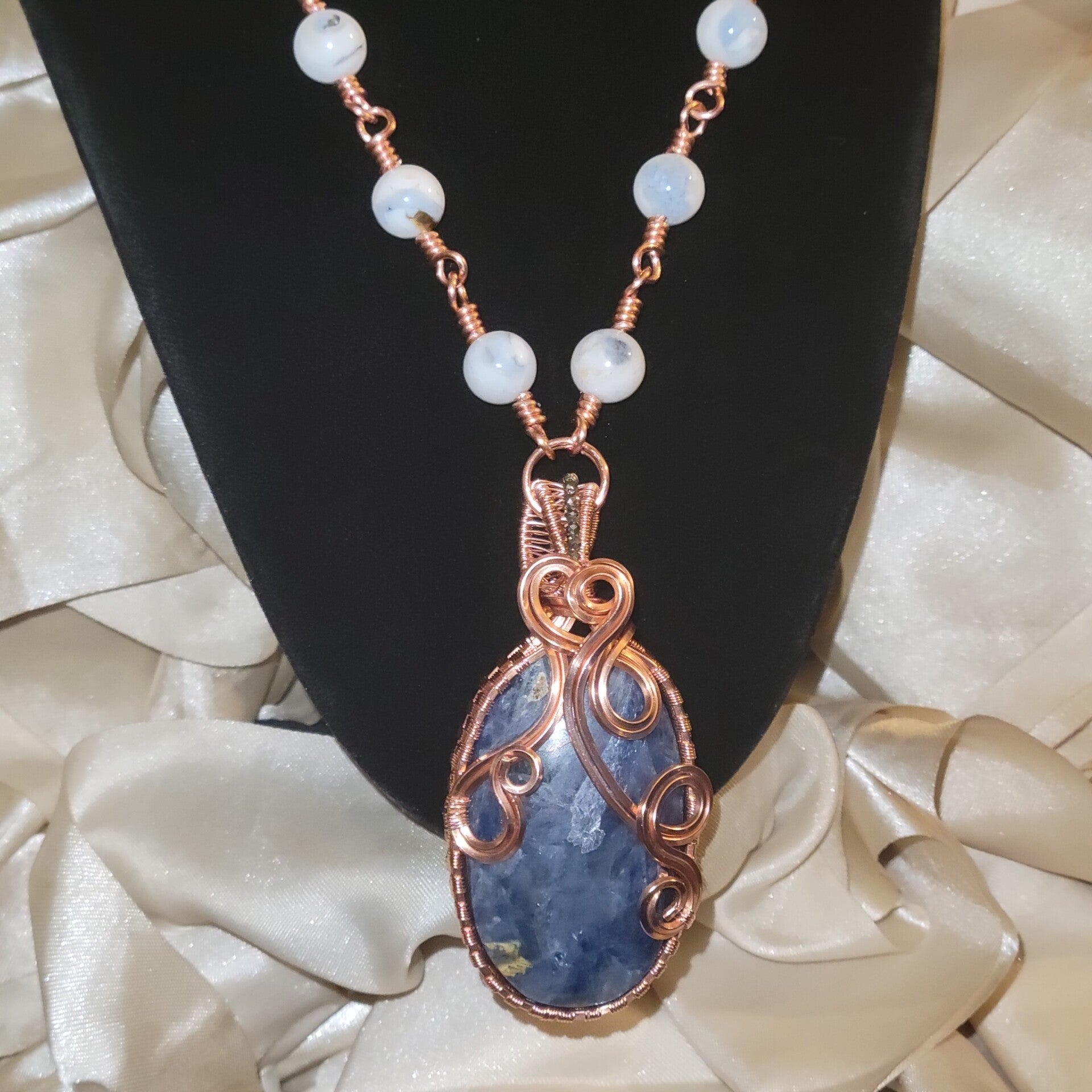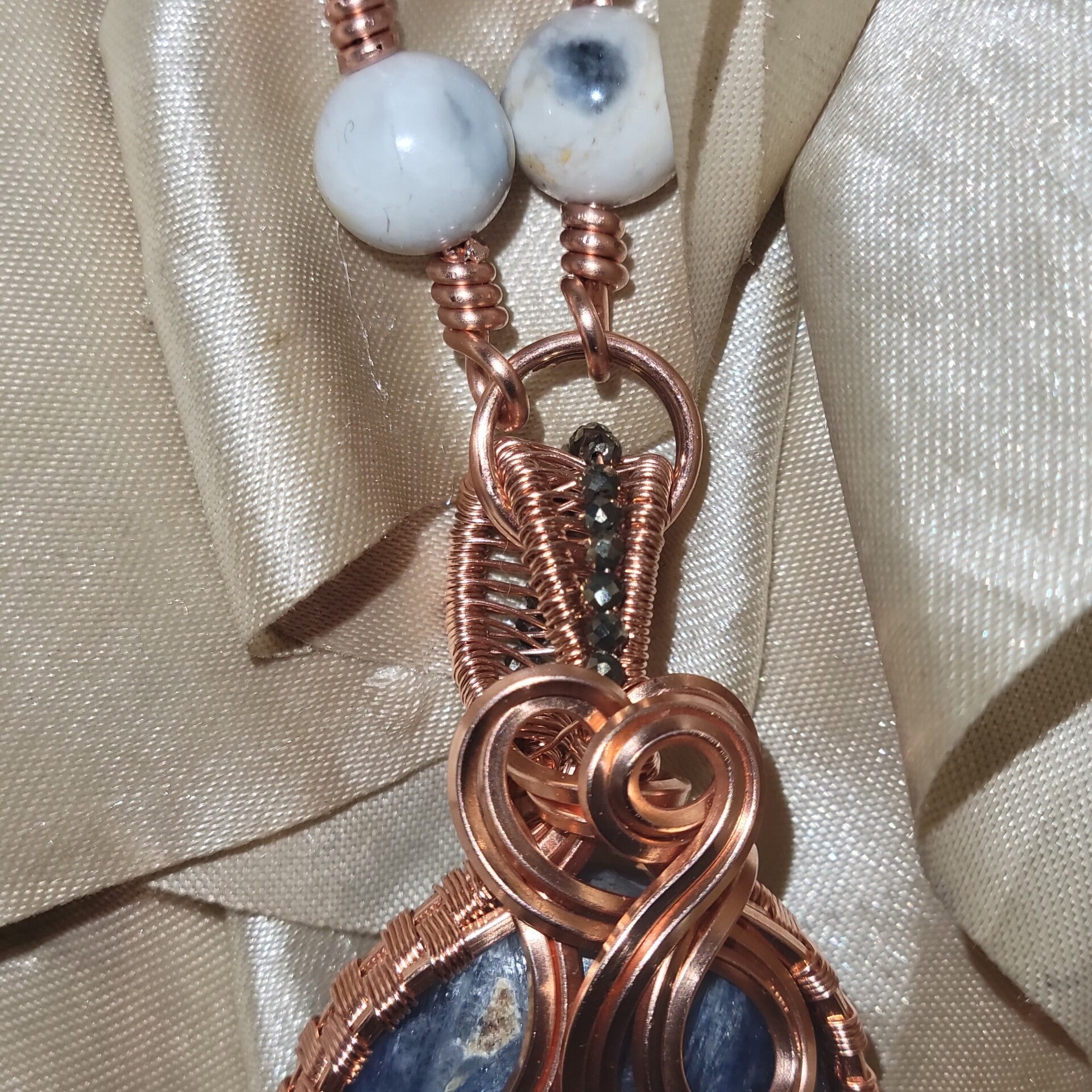 Copper wrapped Kyanite with mini pyrite beads, adorn with Blue/white Opal Beads
