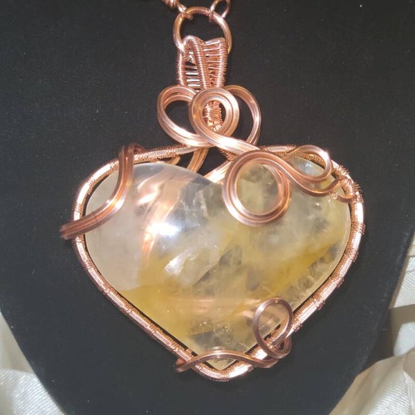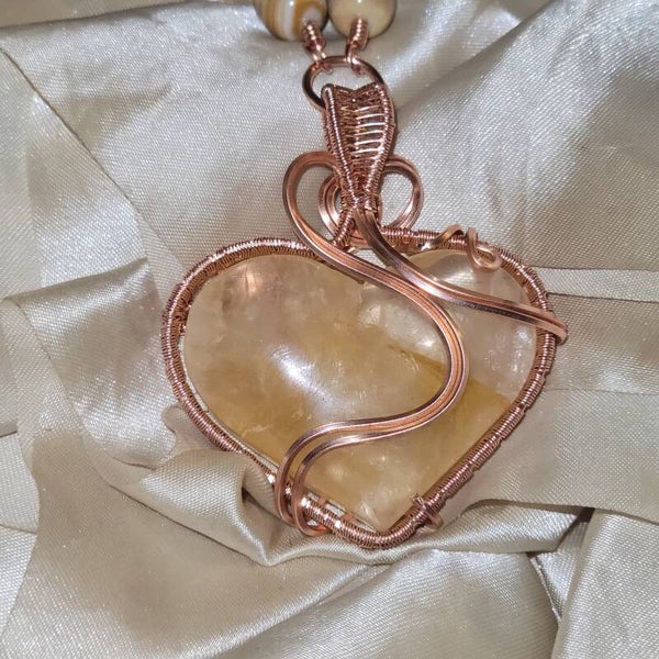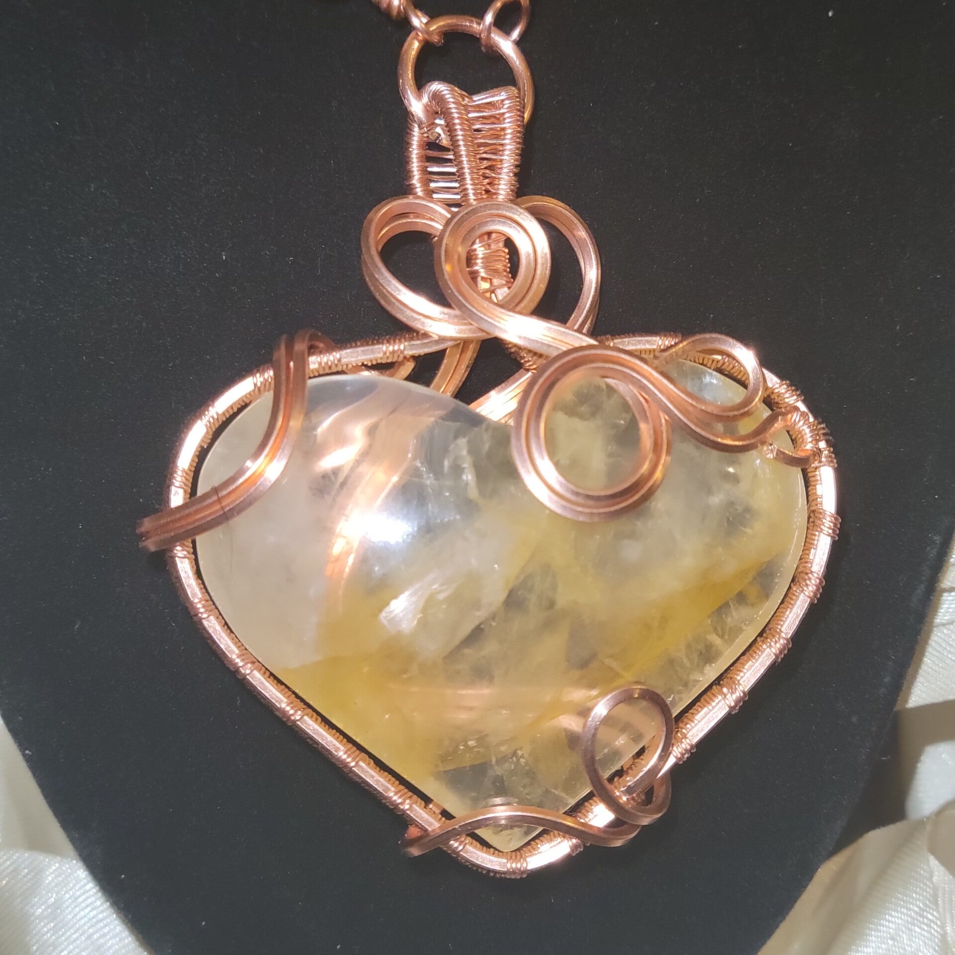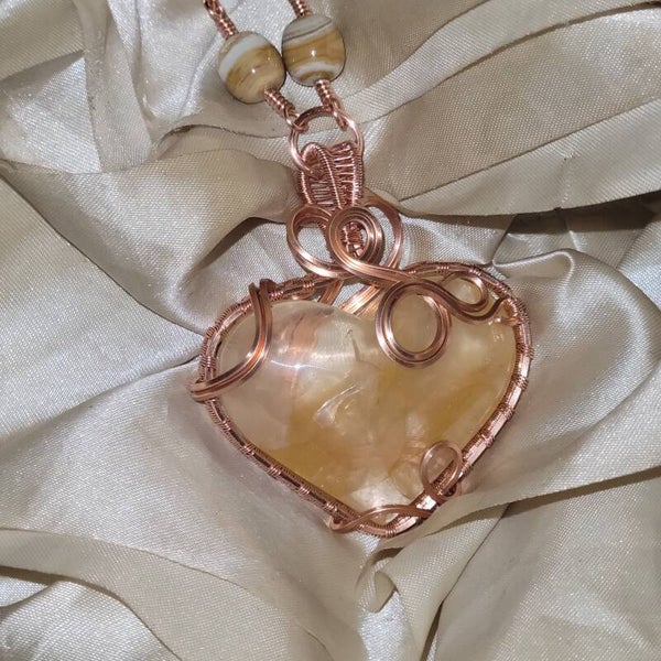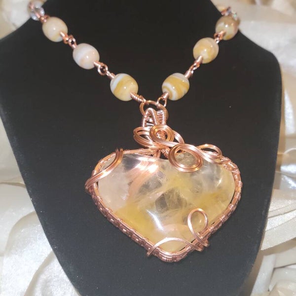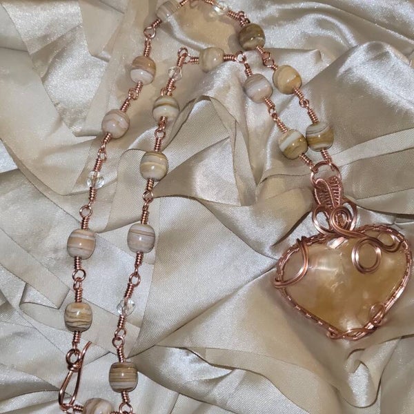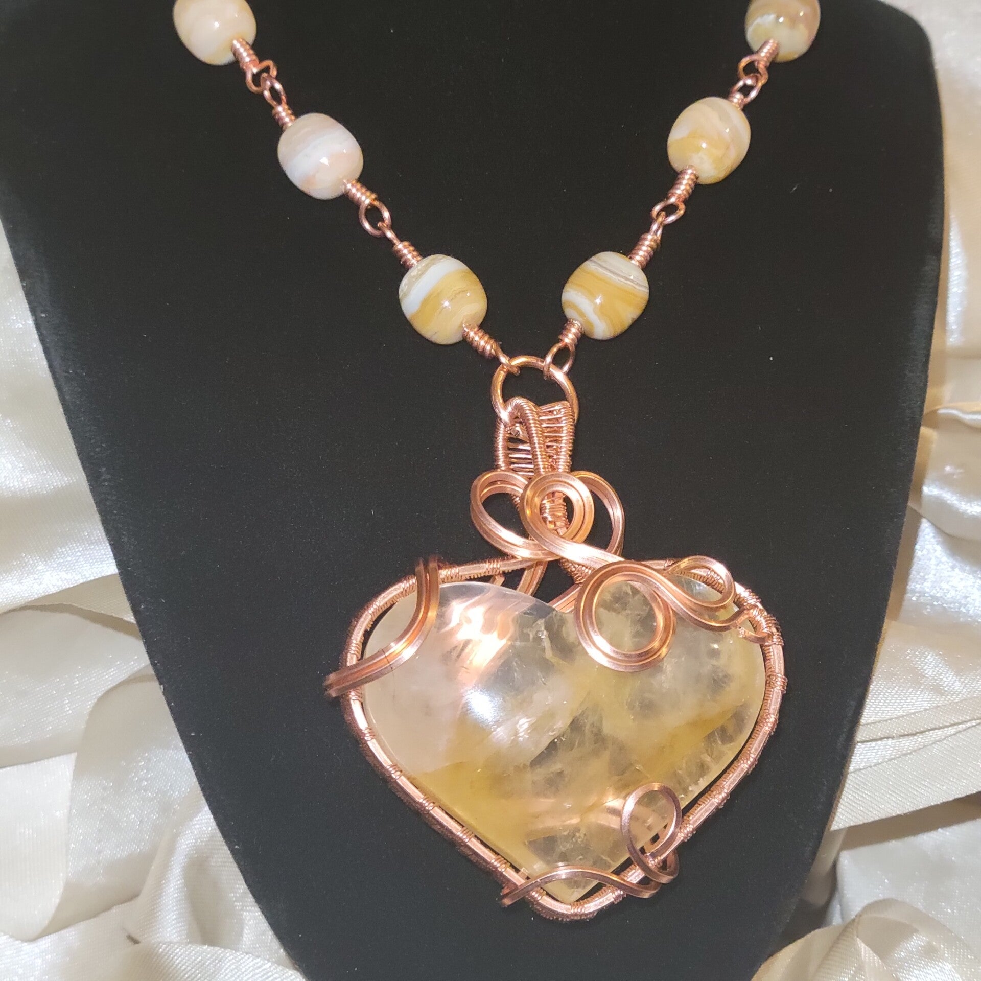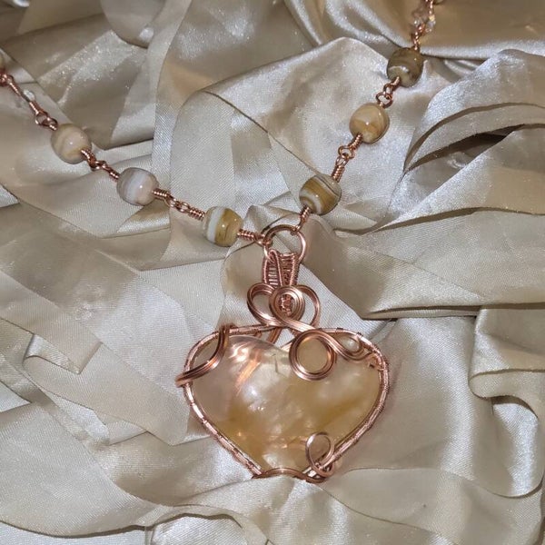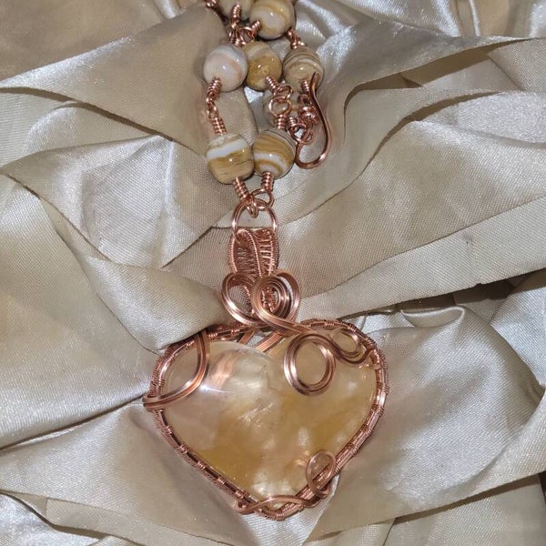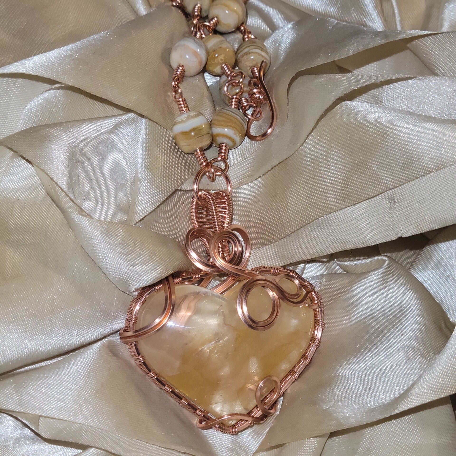 Copper wrapped Golden Healer Heart adorn with Crazy Lace Agate beads