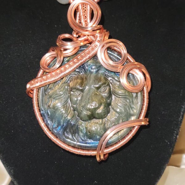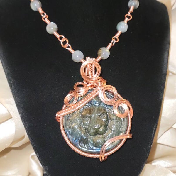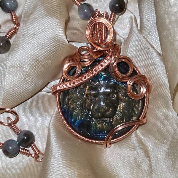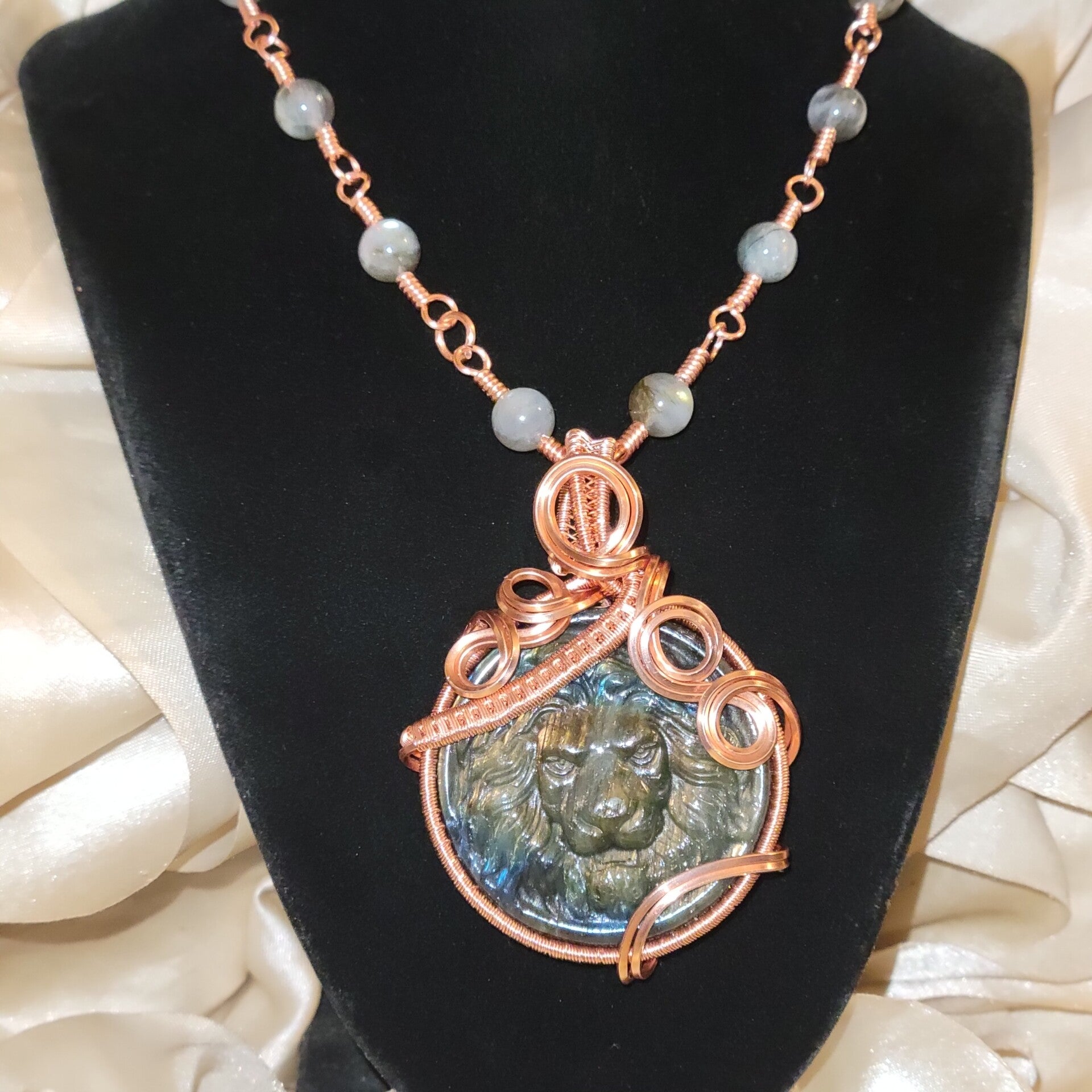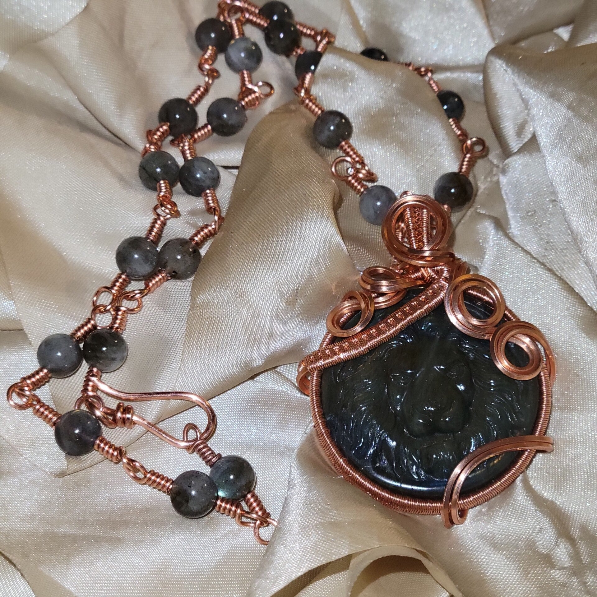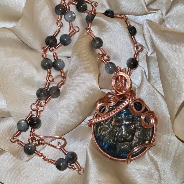 Copper wrapped Labradorite Lion adorn with Labradorite beads