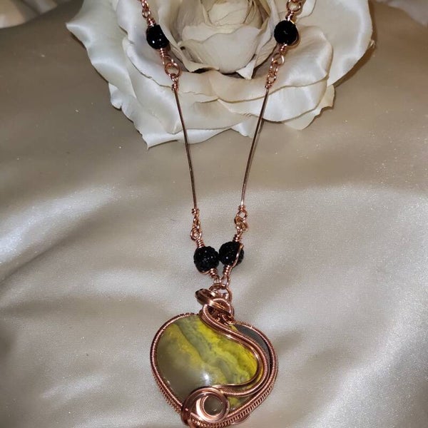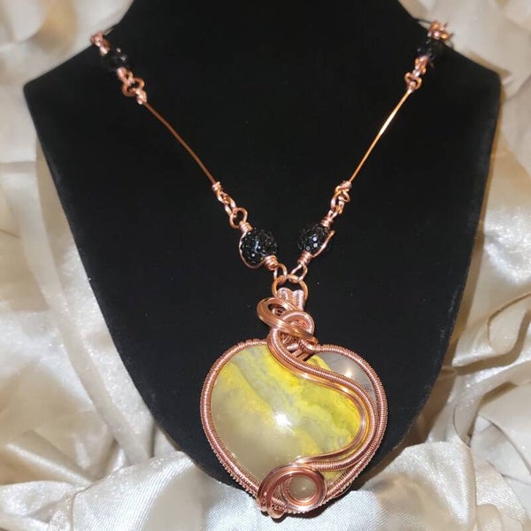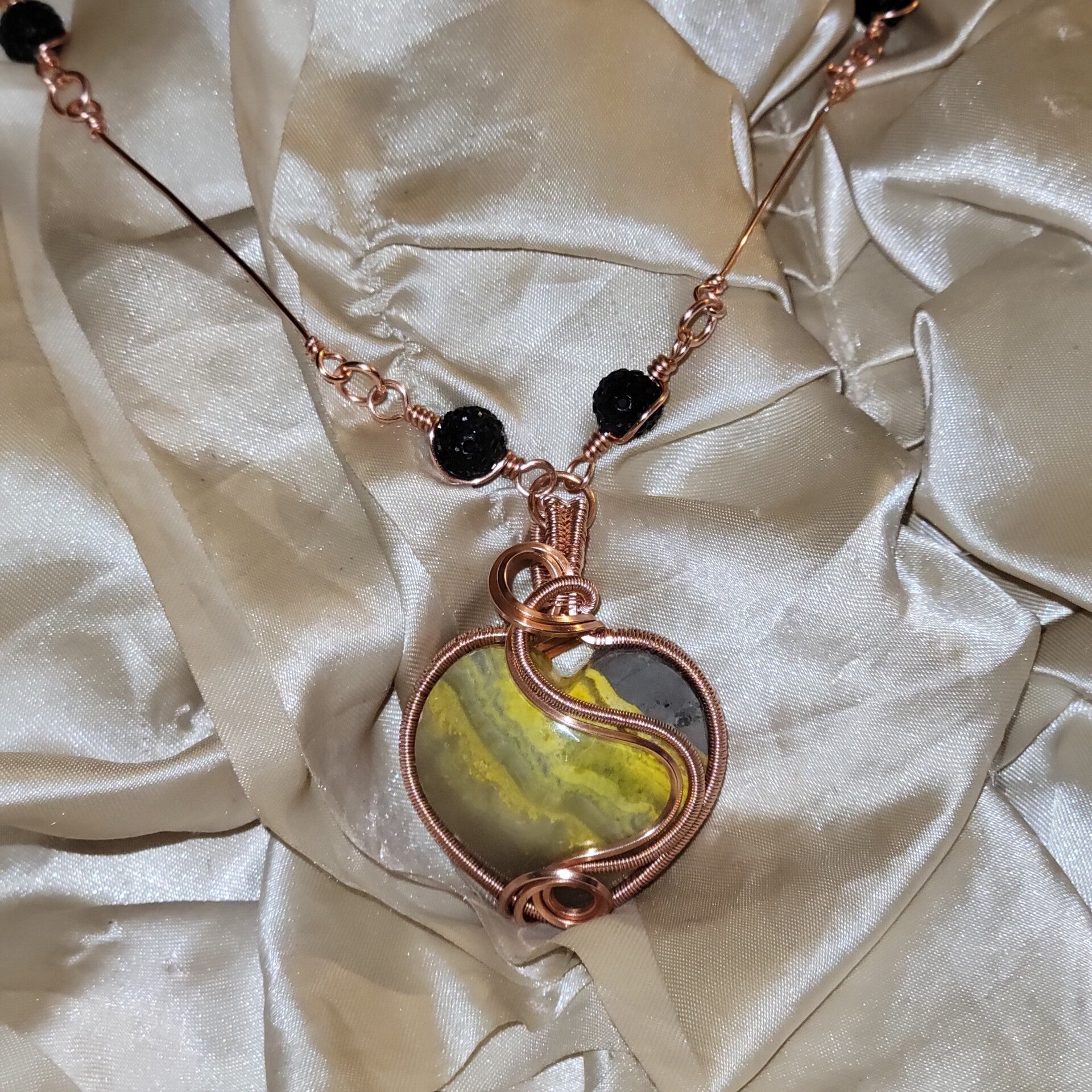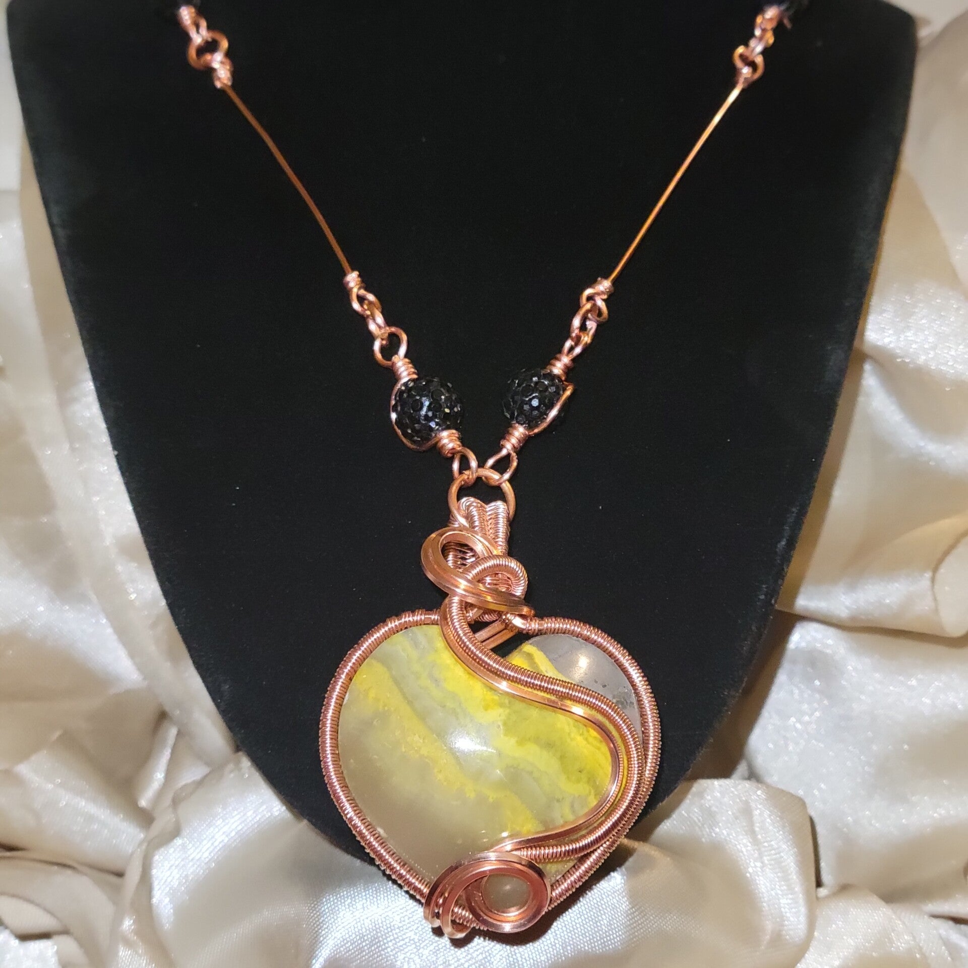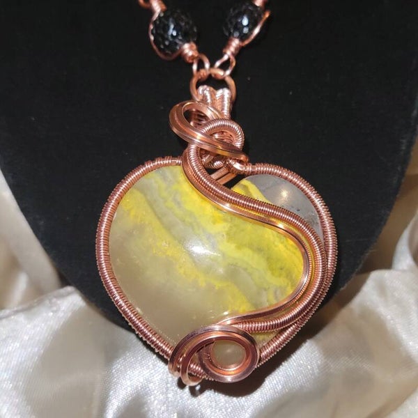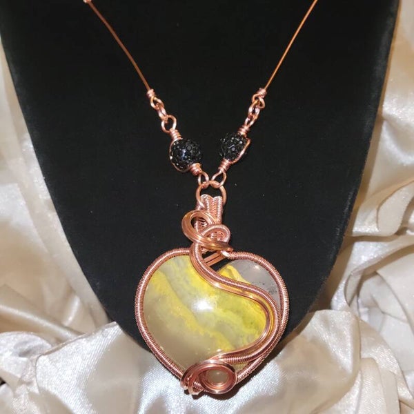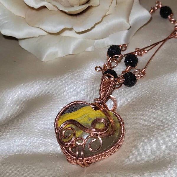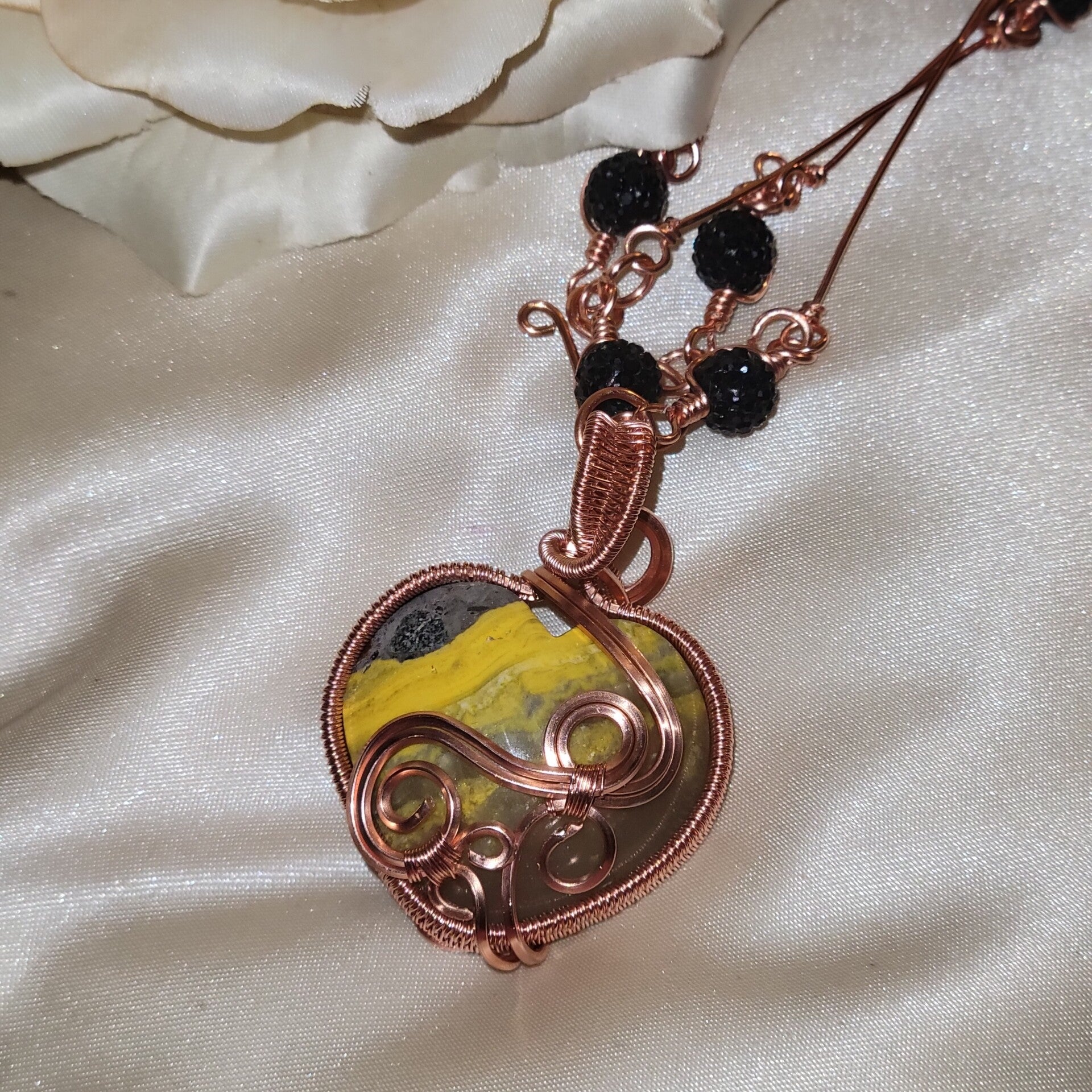 Copper wrapped Bumblebee Jasper heart adorn with sparkling black beads