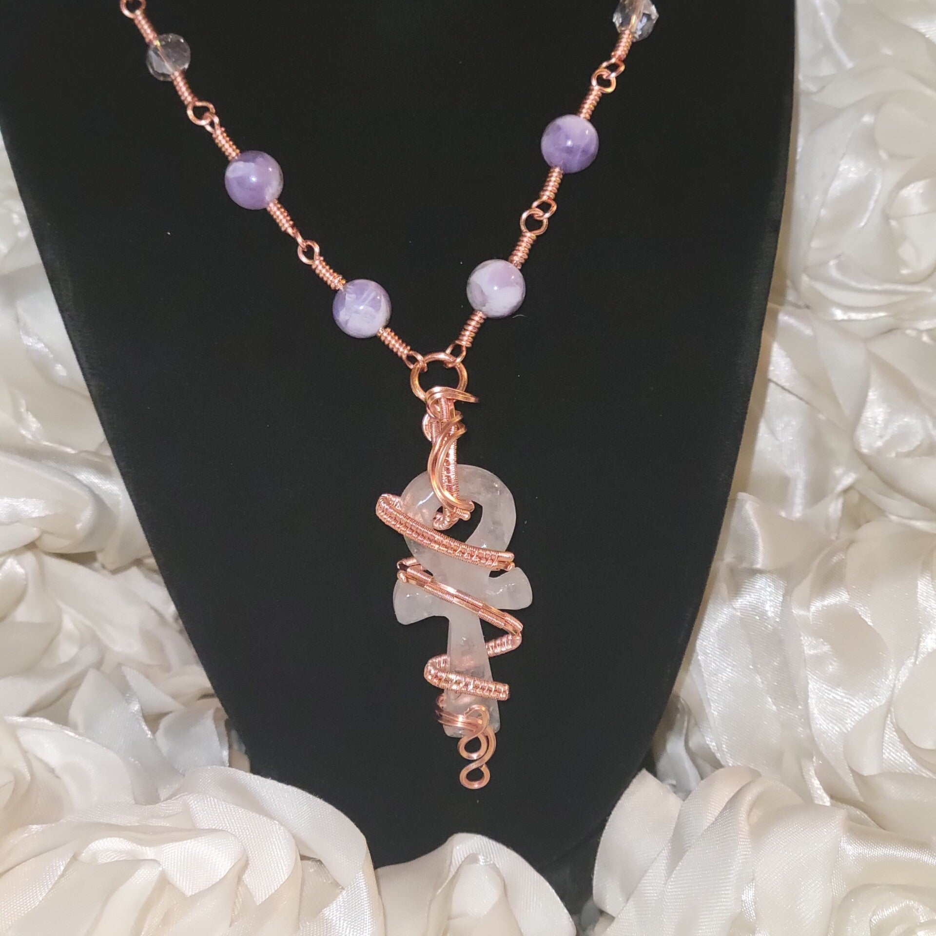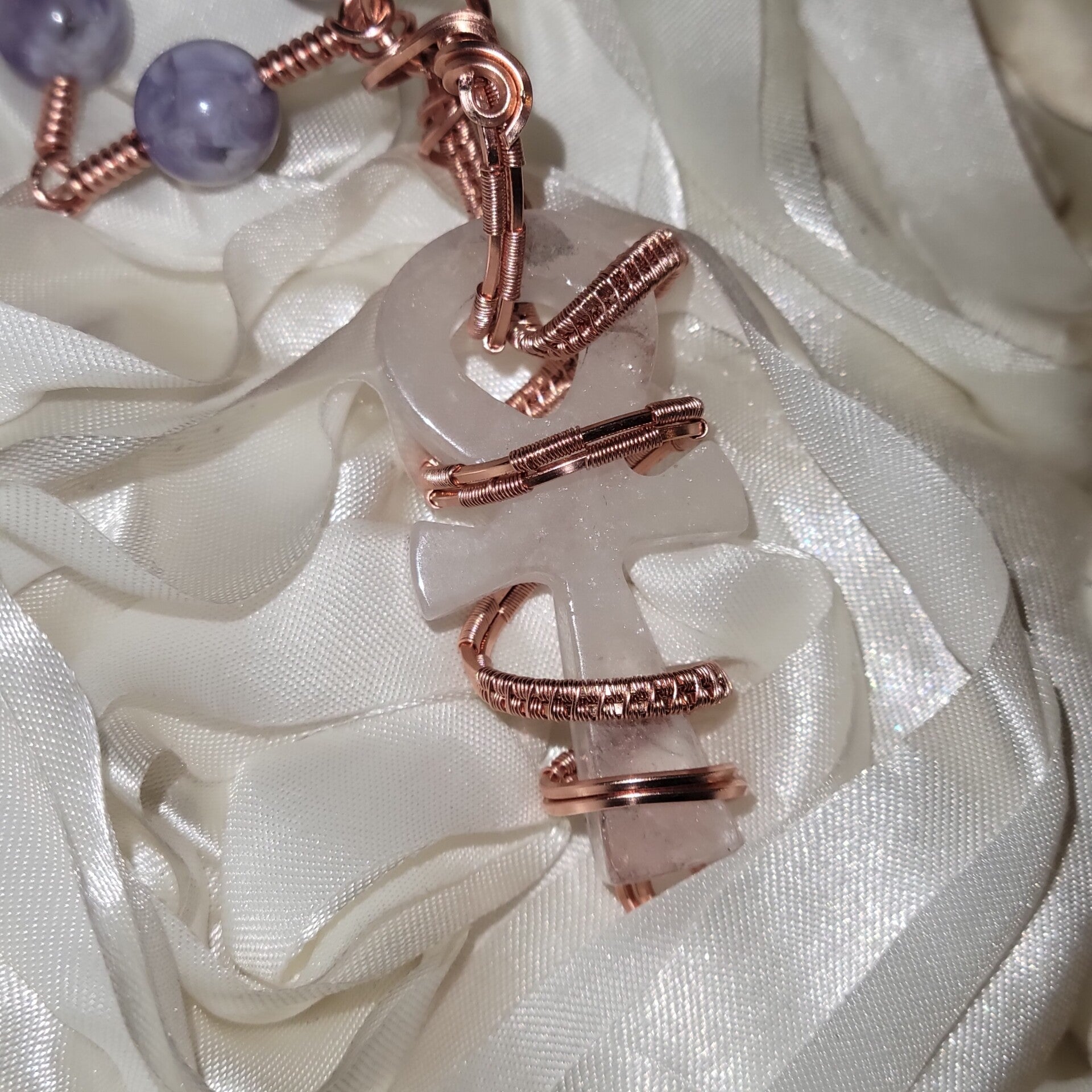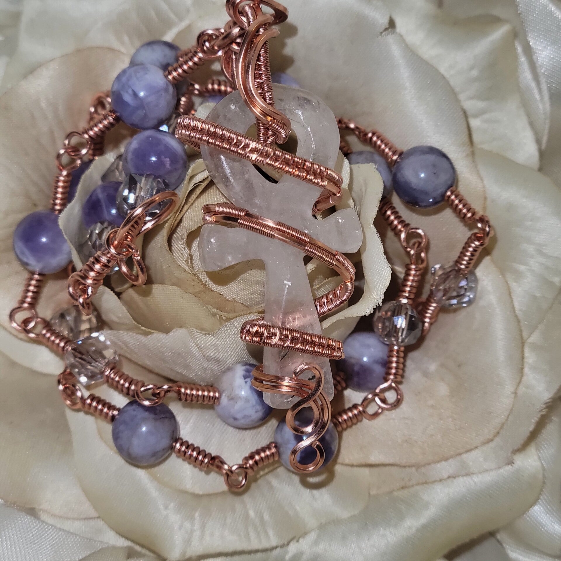 Copper wrapped Clear Quartz Ankh adorn with Chevron Amethyst beads