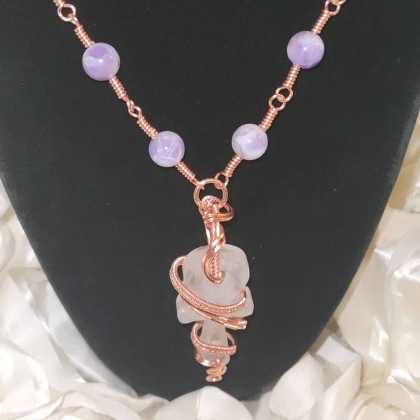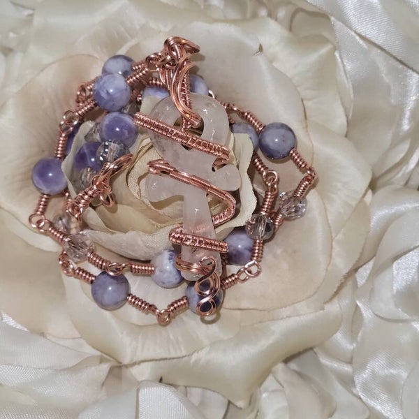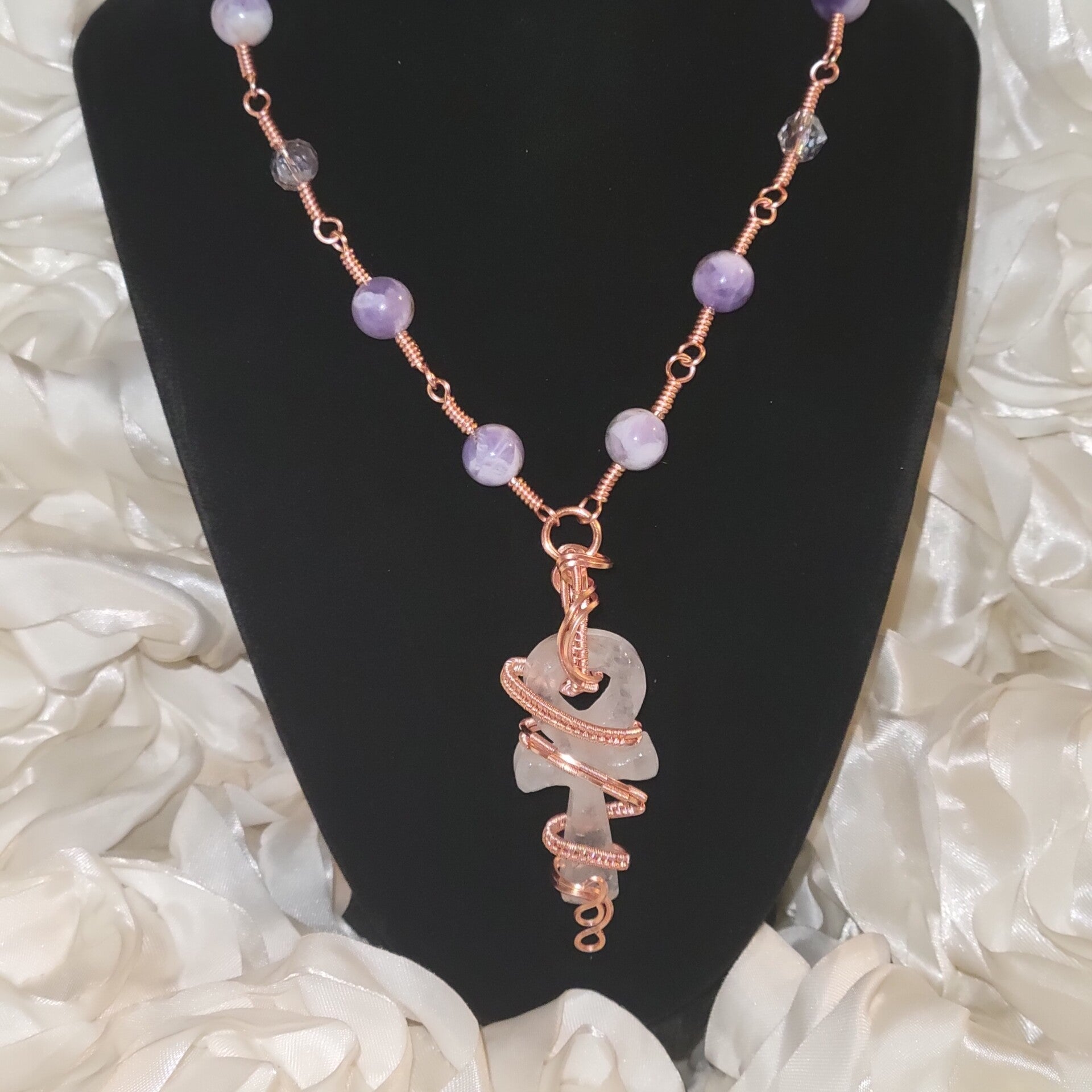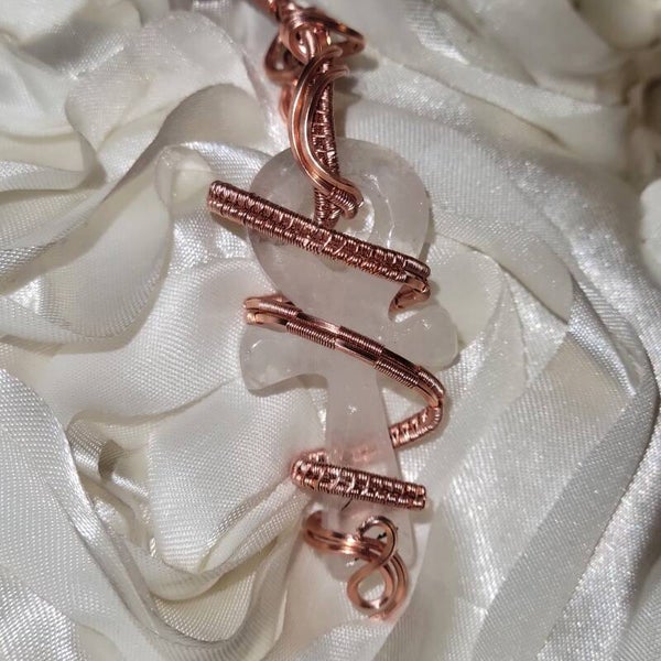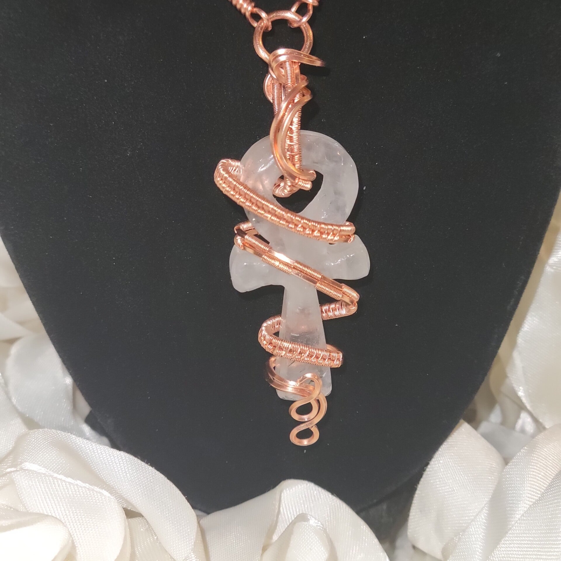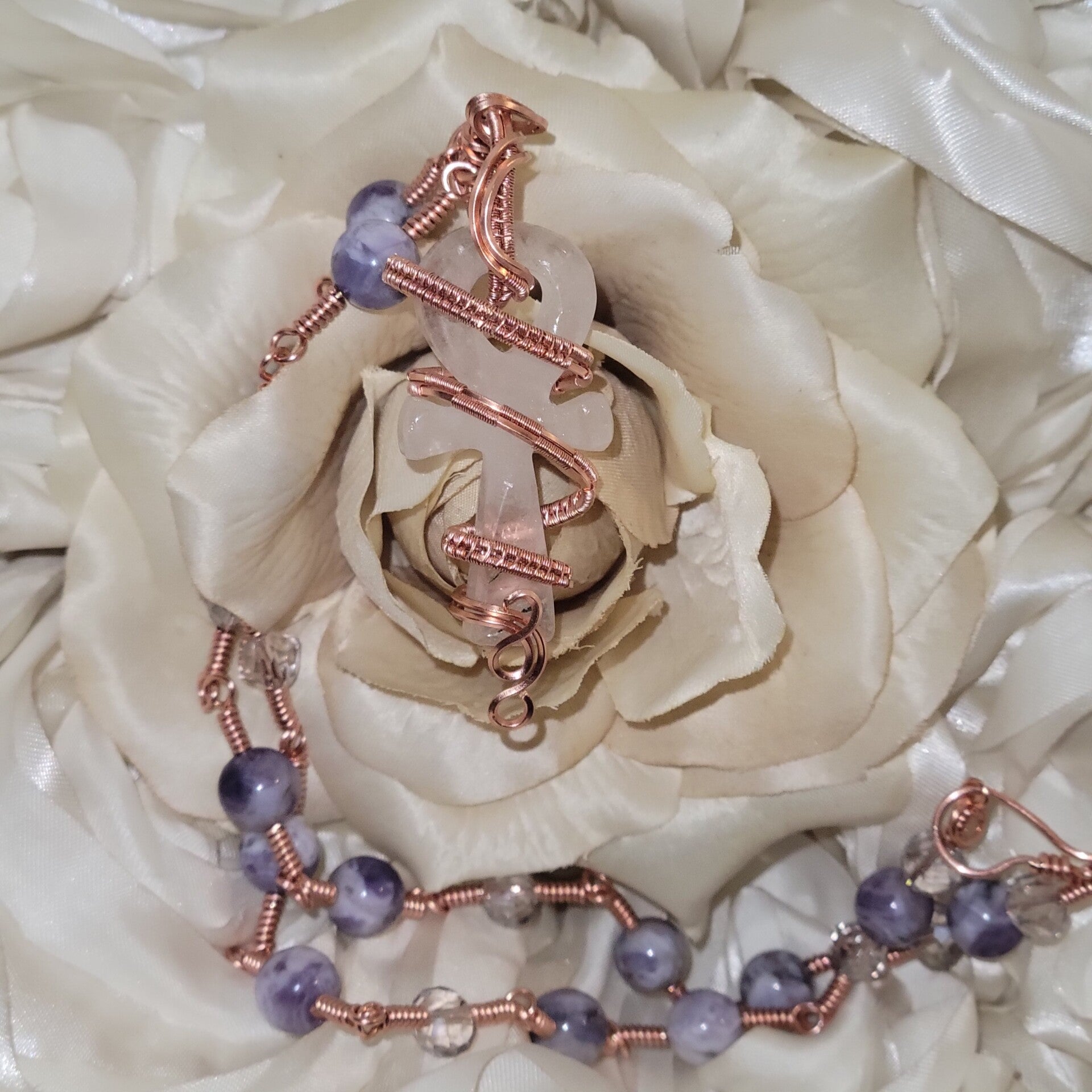 Copper wrapped Clear Quartz Ankh adorn with Chevron Amethyst beads