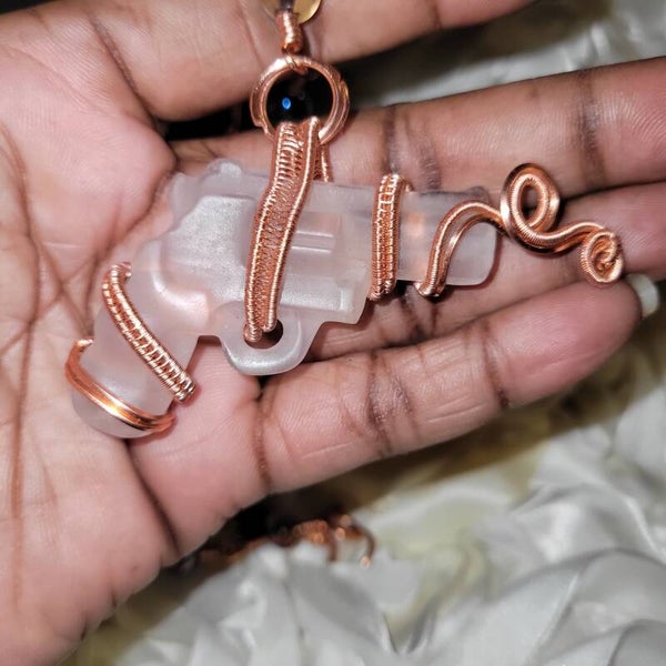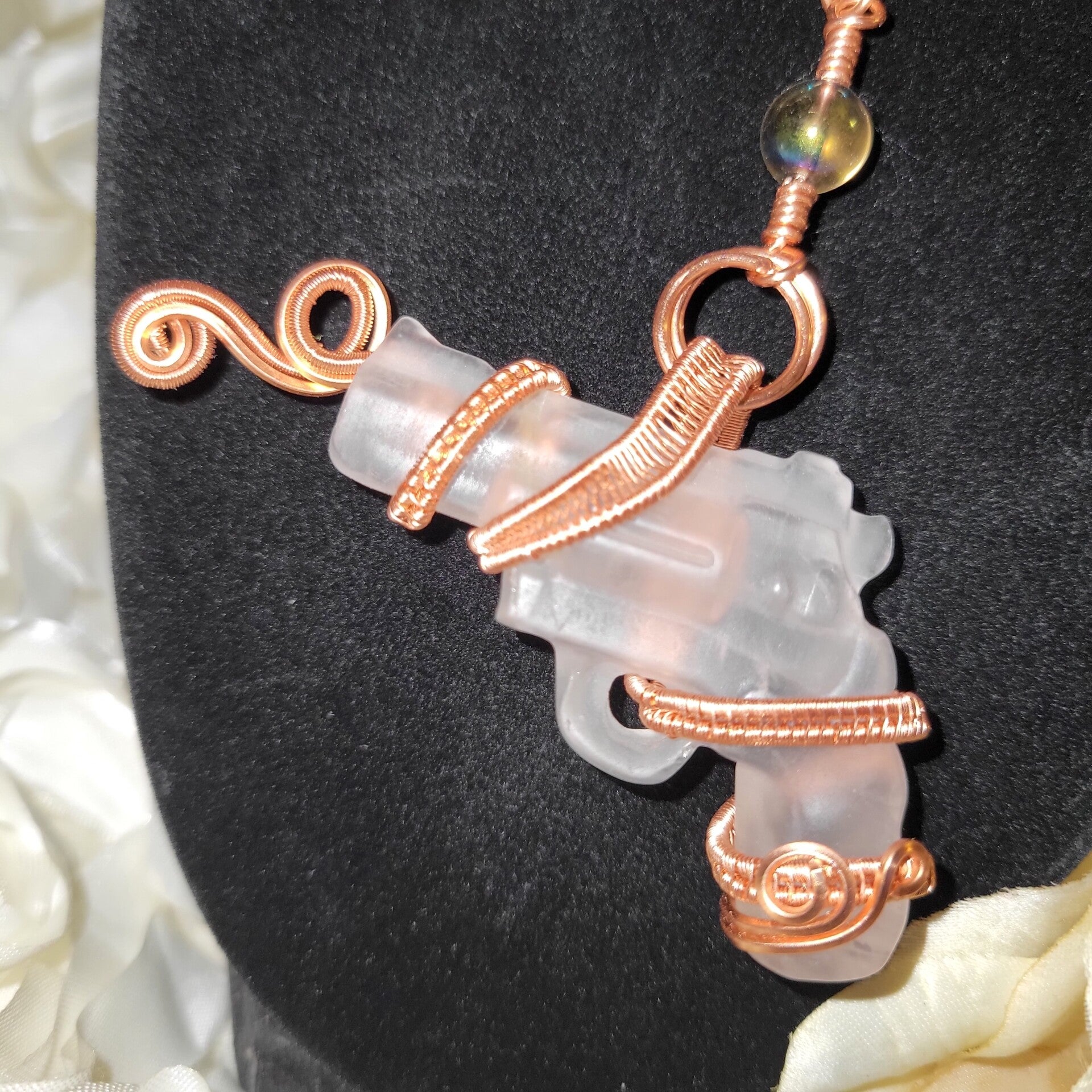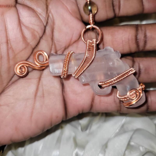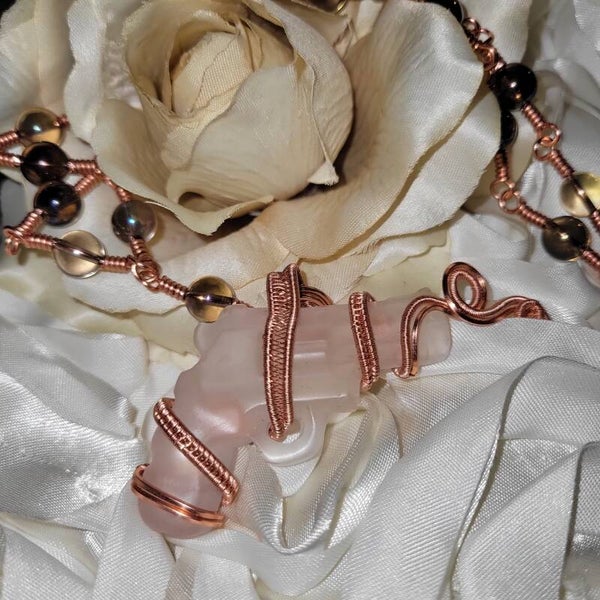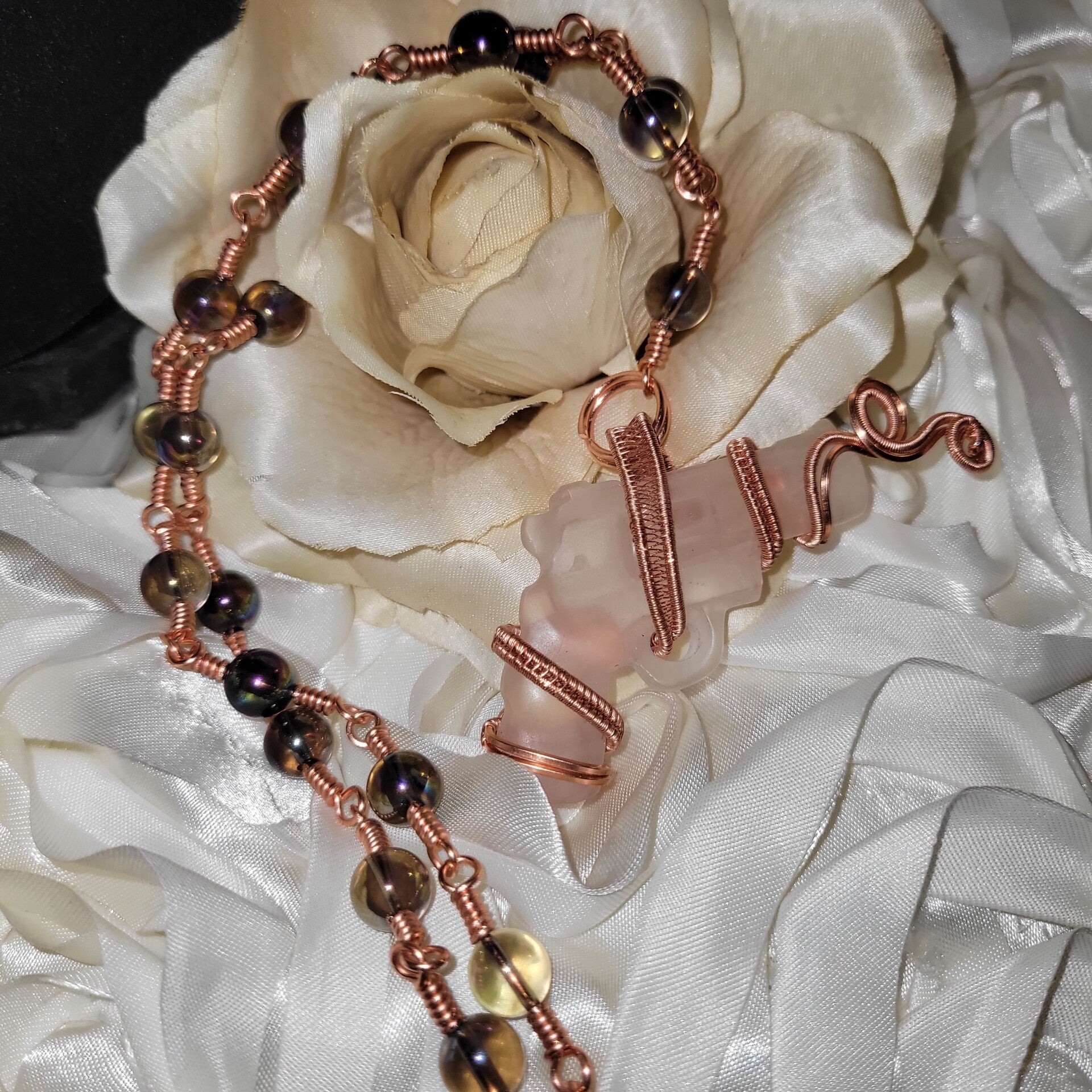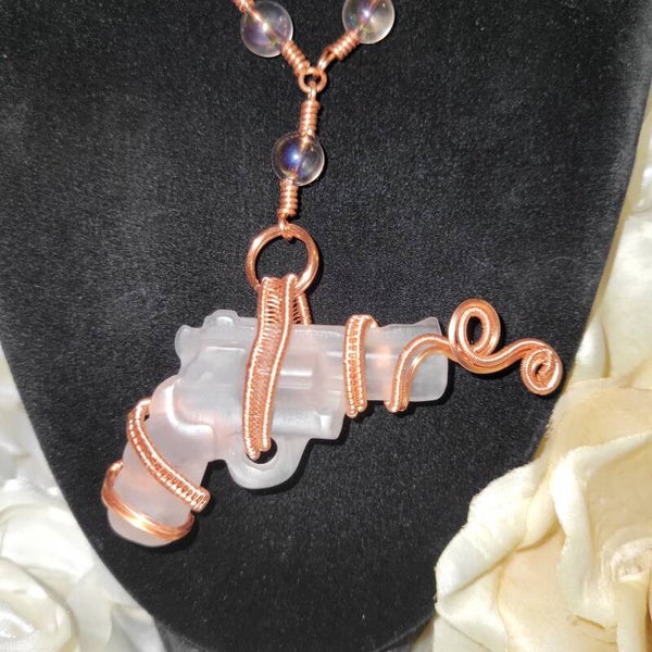 Copper wrapped Clear Quartz Gun adorn with rainbow Aura quartz beads
