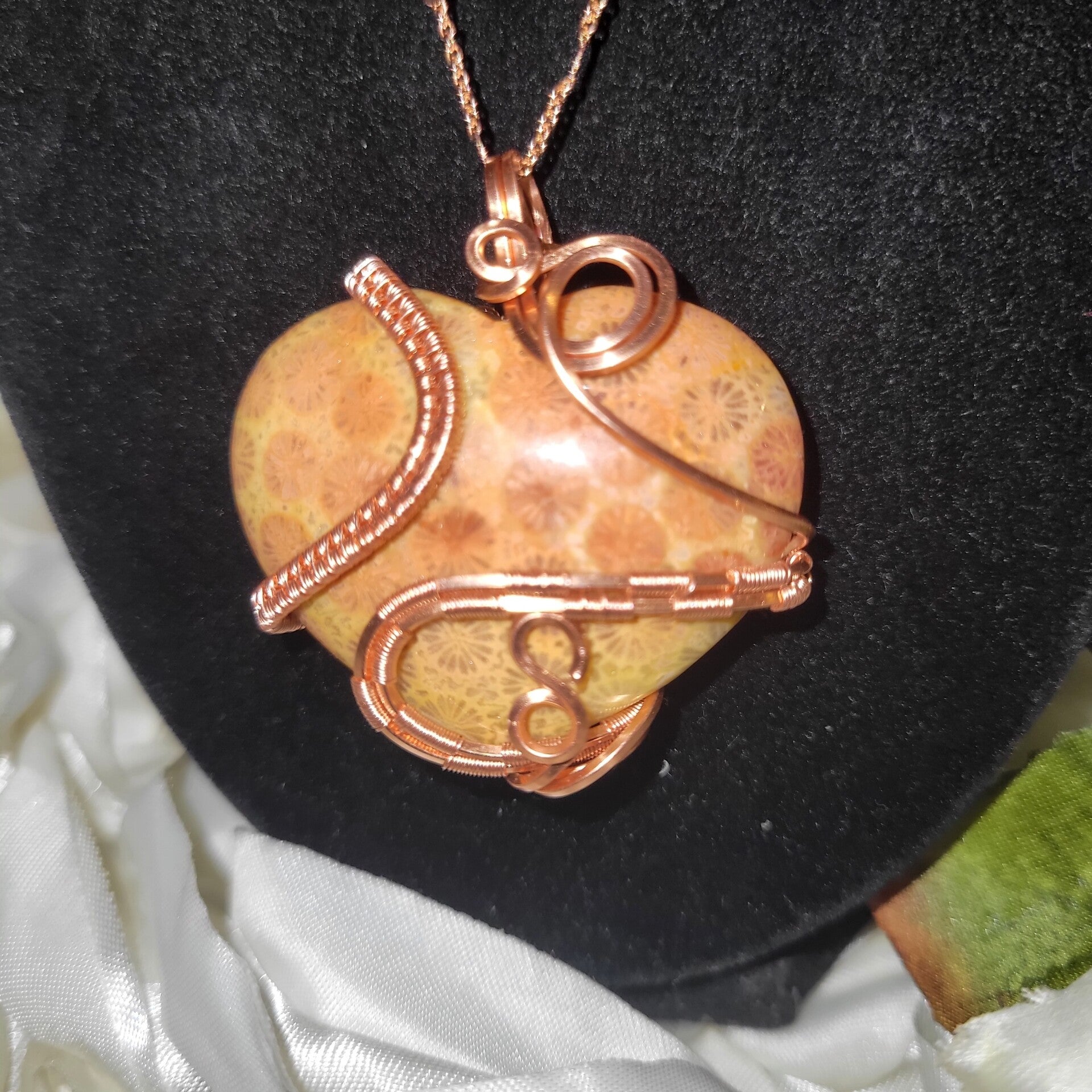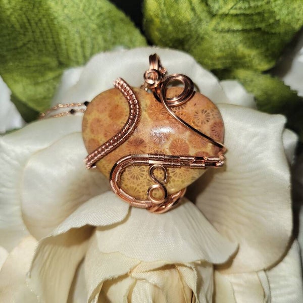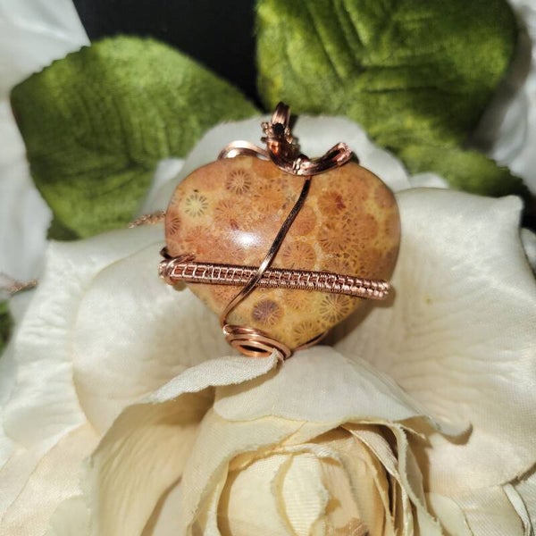 Copper wrapped Coral Jasper Heart Pendant