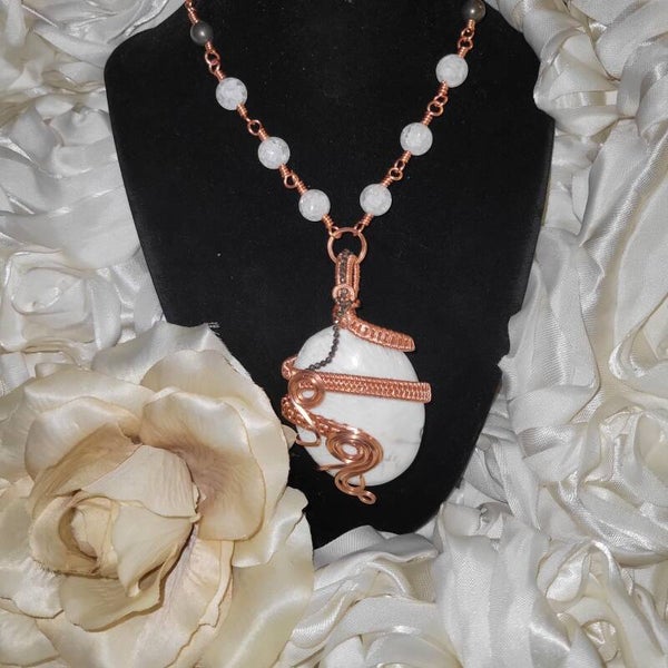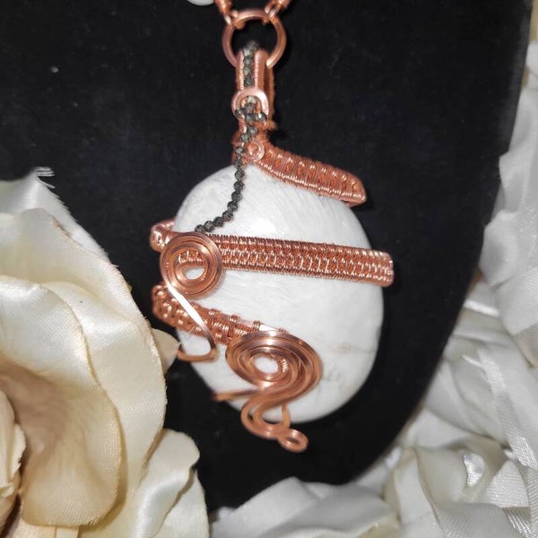 Copper wrapped Scolecite palm adorn with white crackle glass beads and Pyrite beads
