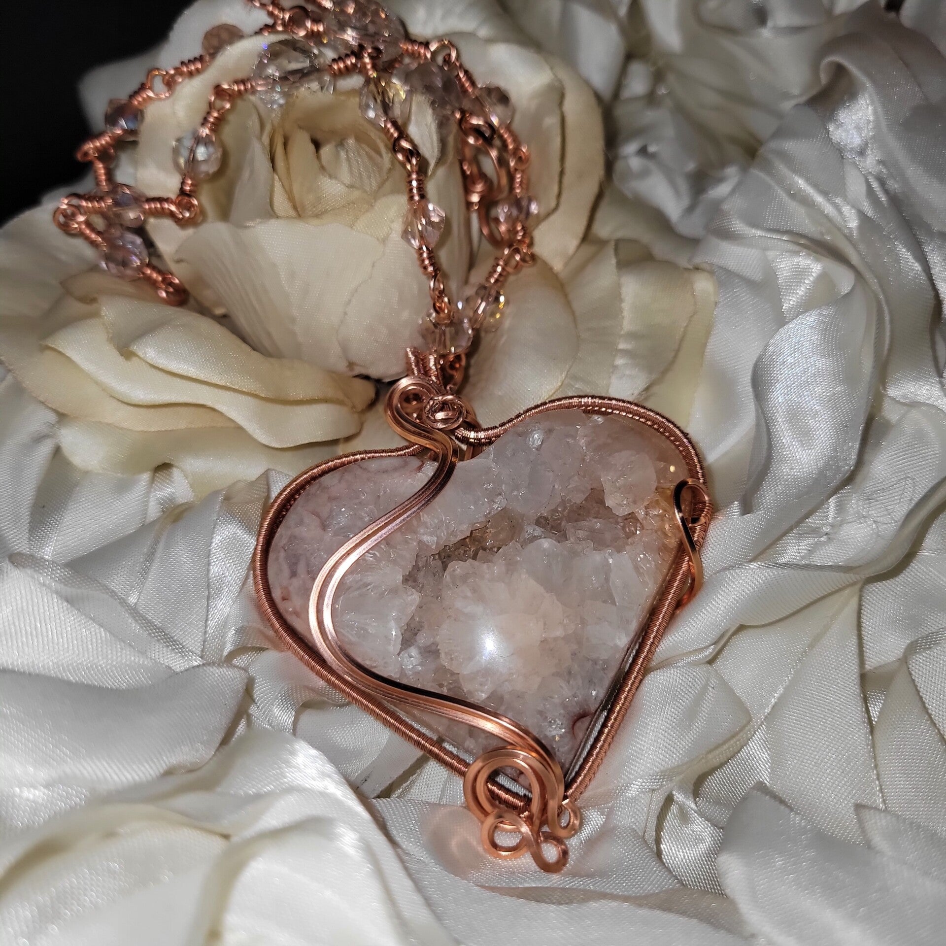Copper wrapped Druzy Amethyst Flower Agate heart pendant adorn with glass and quartz beads