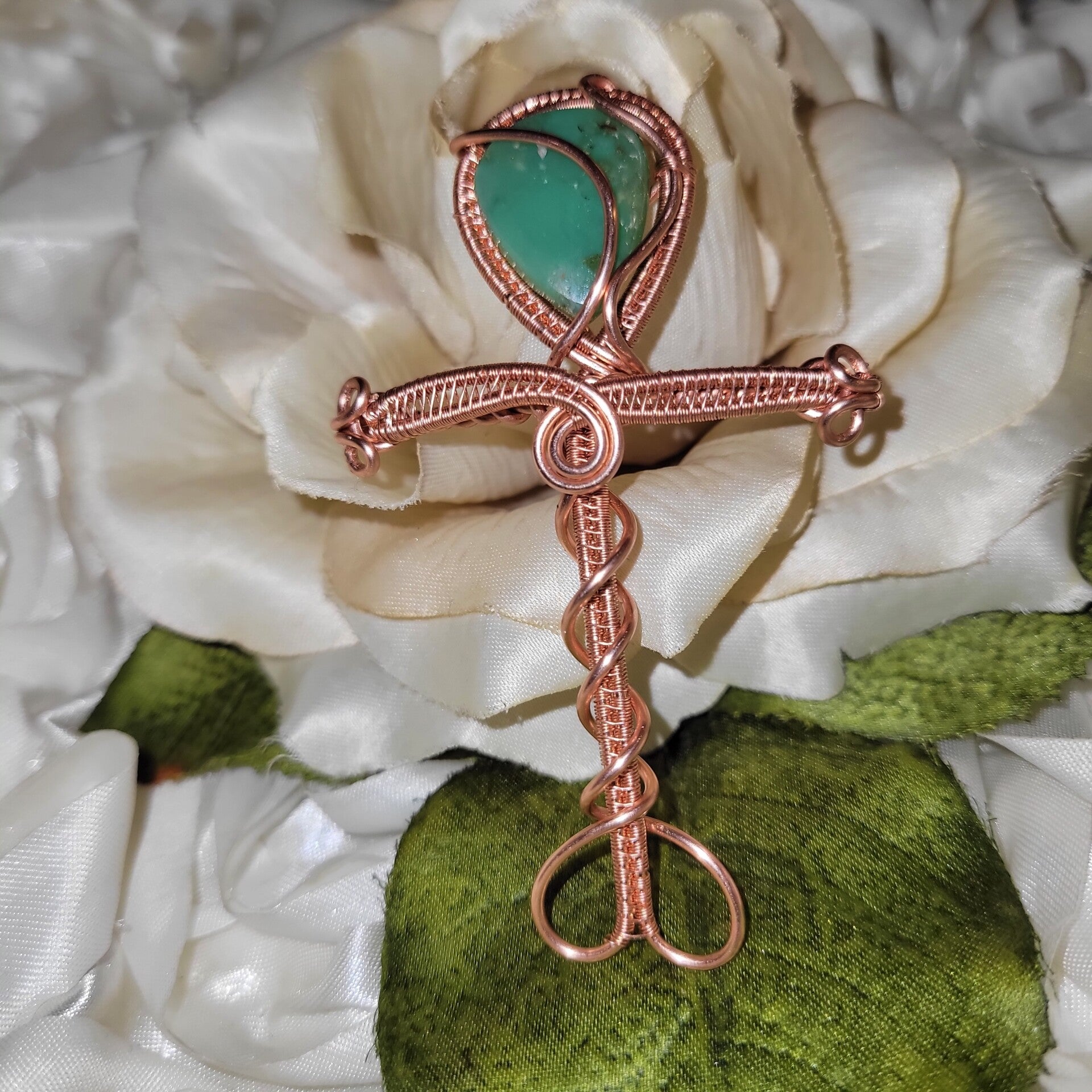 Hand-wrapped in copper and crowned with chrysoprase, Iyara embodies sacred life force, emotional clarity, and divine renewal. Her curves echo the eternal symbol of the Ankh, grounding you in your truth while awakening ancestral grace