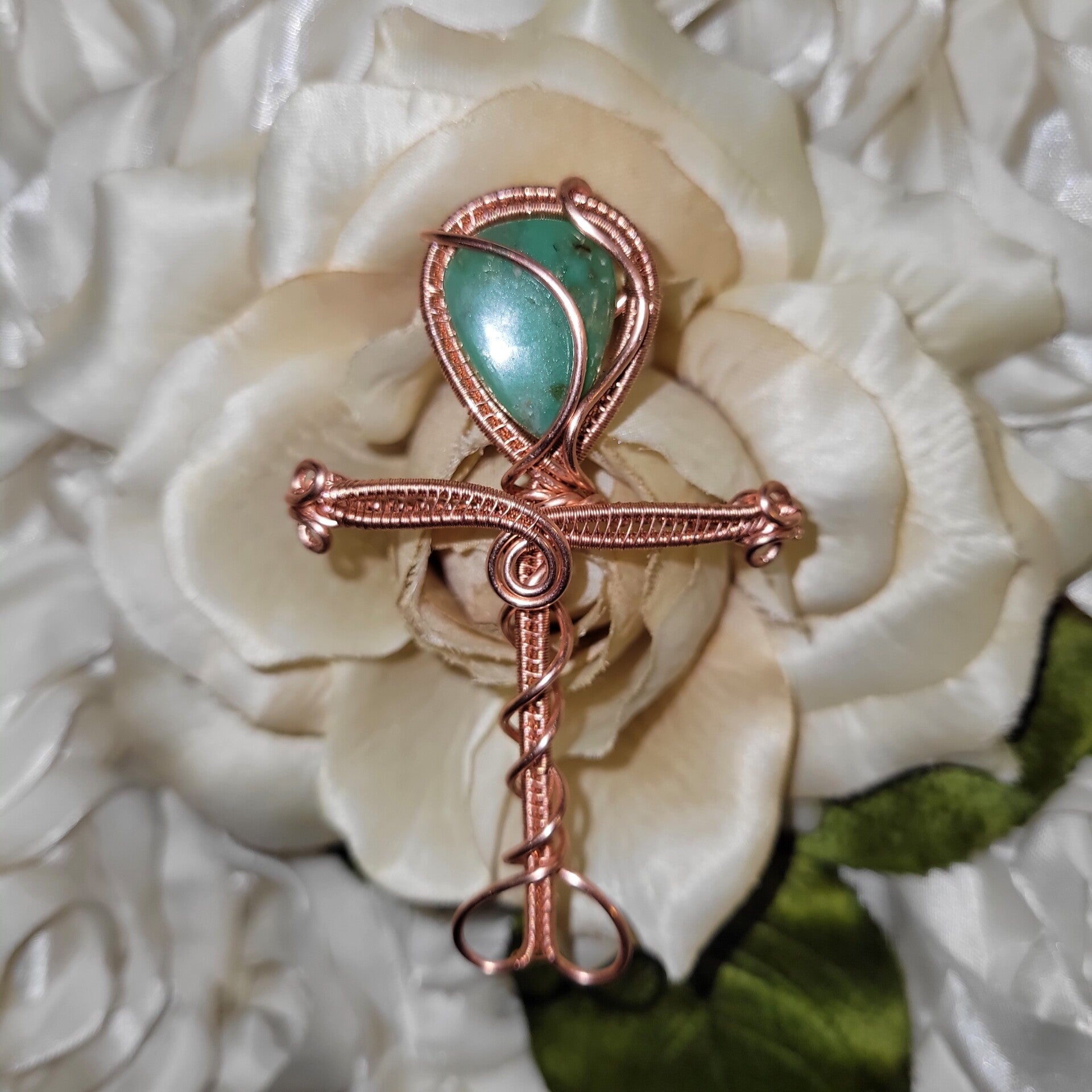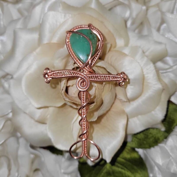 This handcrafted Ankh pendant is more than adornment—it’s a sacred symbol of eternal life and divine balance. Wrapped with pure copper to amplify its energy, this piece features a stunning Chrysoprase stone at its heart, glowing with healing green light and deep ancestral power.