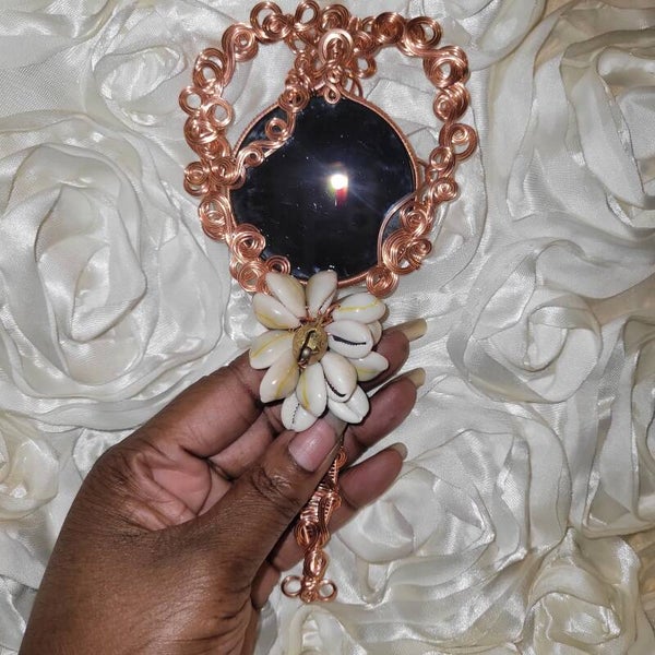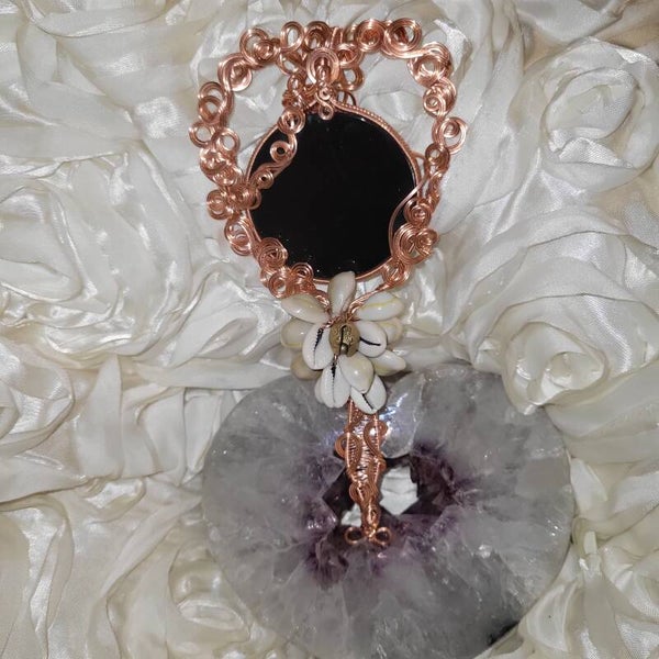 A conjured mirror of Black Obsidian, wrapped in copper like a sacred petition to Spirit.