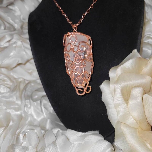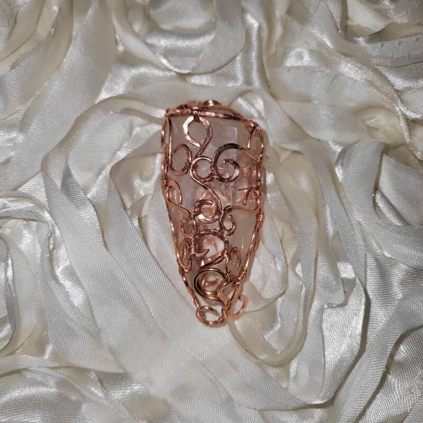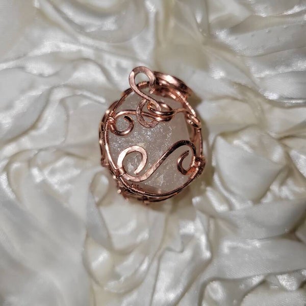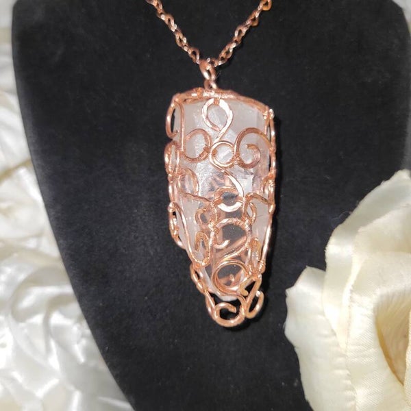 Behold Crysalira, a glacial whisper from the spirit realms. This icy Clear Quartz crystal has been intricately hand-wrapped in warm copper, using a unique spiral weave design that mimics sacred geometry—each curl and coil intentionally formed to amplify and channel divine energy.