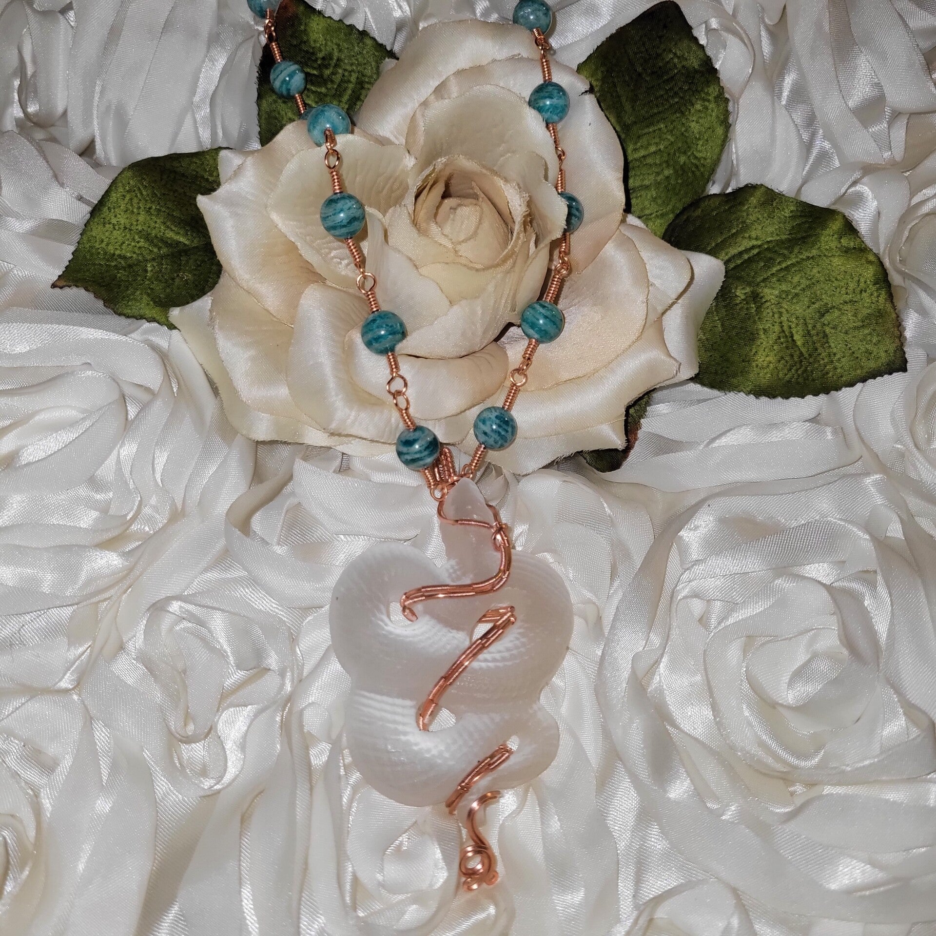 Summon the sacred forces of transformation, divine protection, and inner truth with Naelira—a handcrafted talisman featuring a luminous selenite serpent entwined in copper, anchored by rhythmic striped Amazonite beads.