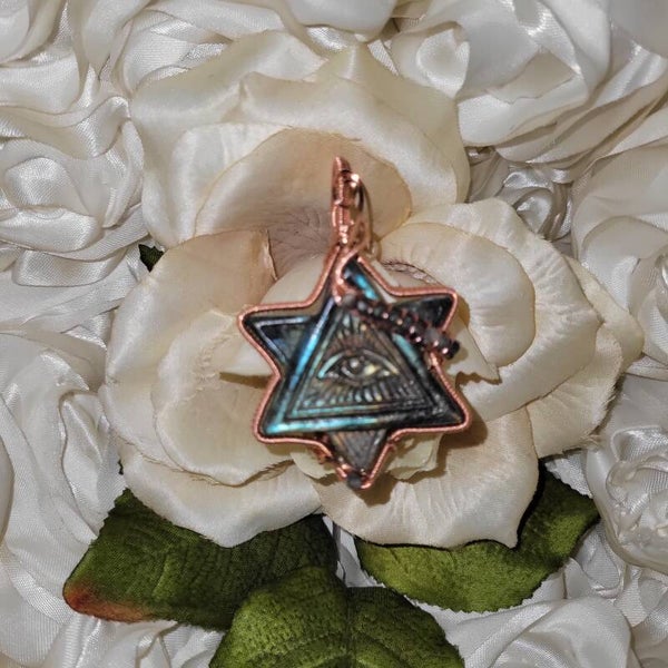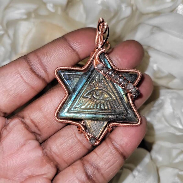 HUMAIYA is a powerful talisman carved from a single piece of Labradorite, shaped as a radiant five-pointed star with an intricately detailed All-Seeing Eye at its heart. This sacred geometry—eye within star—represents the union of inner wisdom and cosmic order. It is a symbol of divine insight cutting through illusion, lighting the way for the soul that seeks truth.