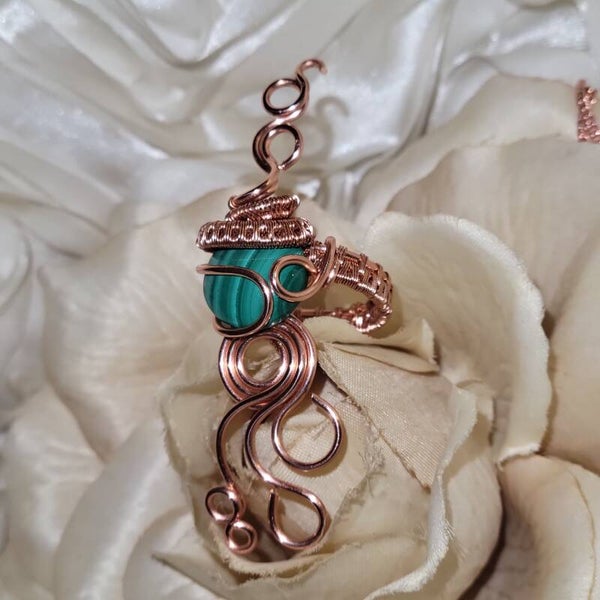 Meet Esmerelle, a regal one-of-a-kind jewelry set handcrafted with intention and artistry. This set features a small yet powerful Malachite cabochon framed in swirling copper loops and bold sculptural details. The set includes both an adjustable copper ring and a matching pendant, making her as versatile as she is enchanting.