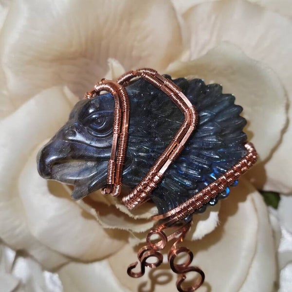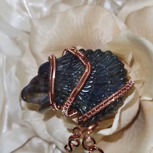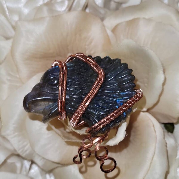 This one-of-a-kind pendant is handcrafted in copper wire, featuring a carved eagle centerpiece of genuine Labradorite. Known as the “stone of transformation,” Labradorite flashes with electric blue and green — colors that perfectly echo Eagle pride.