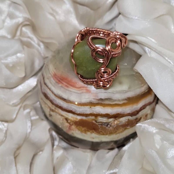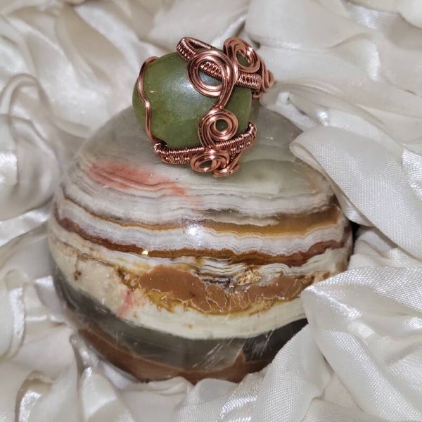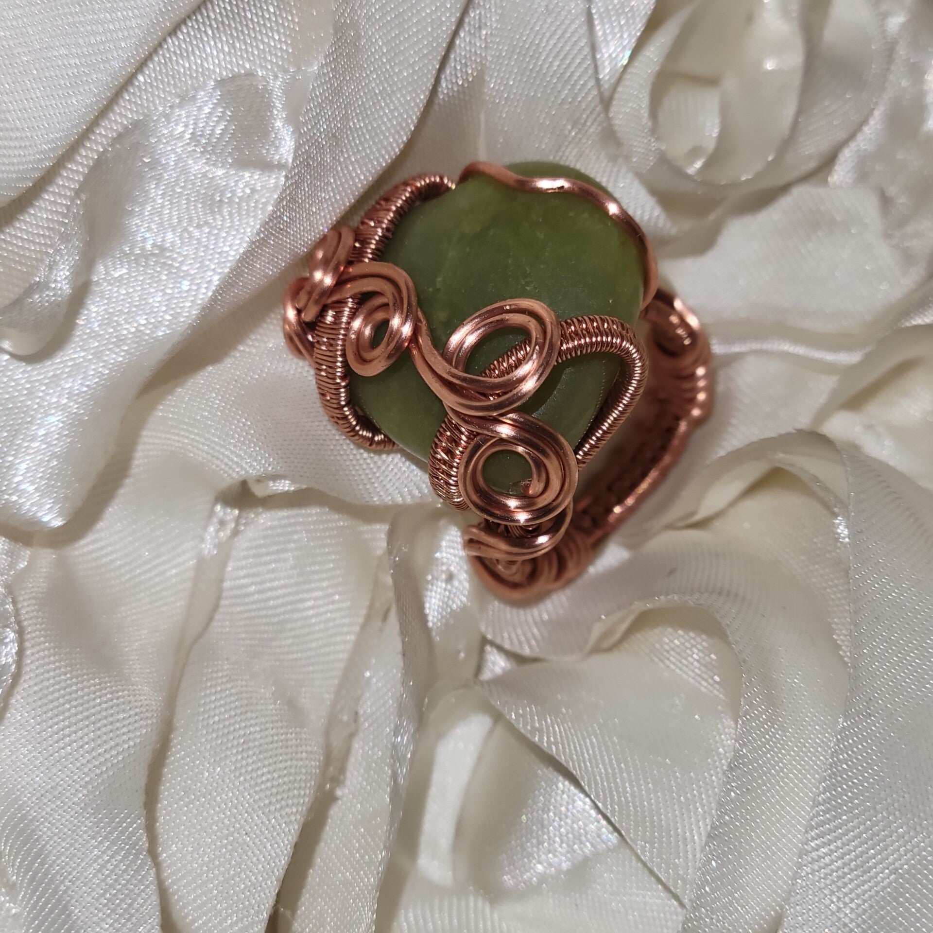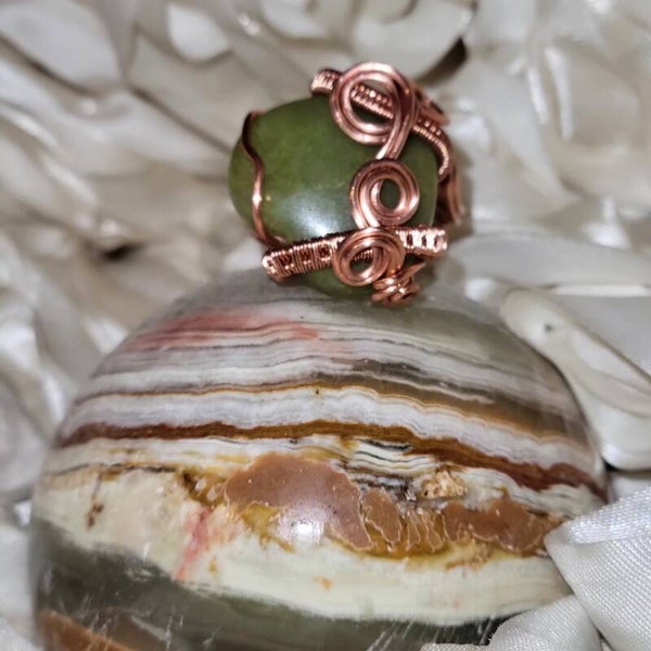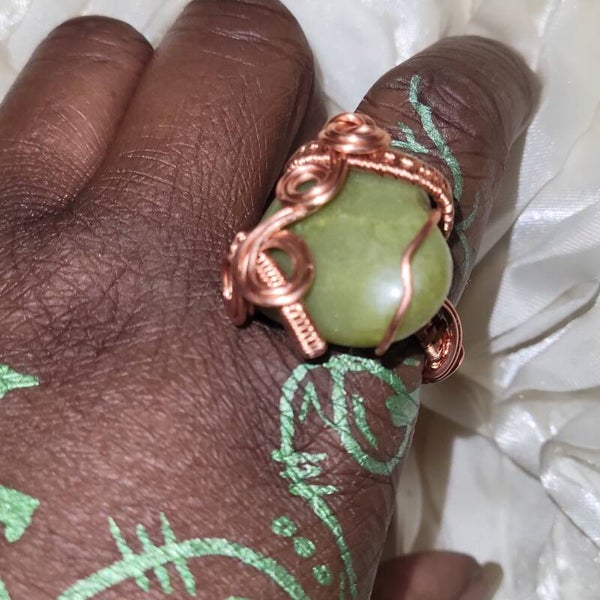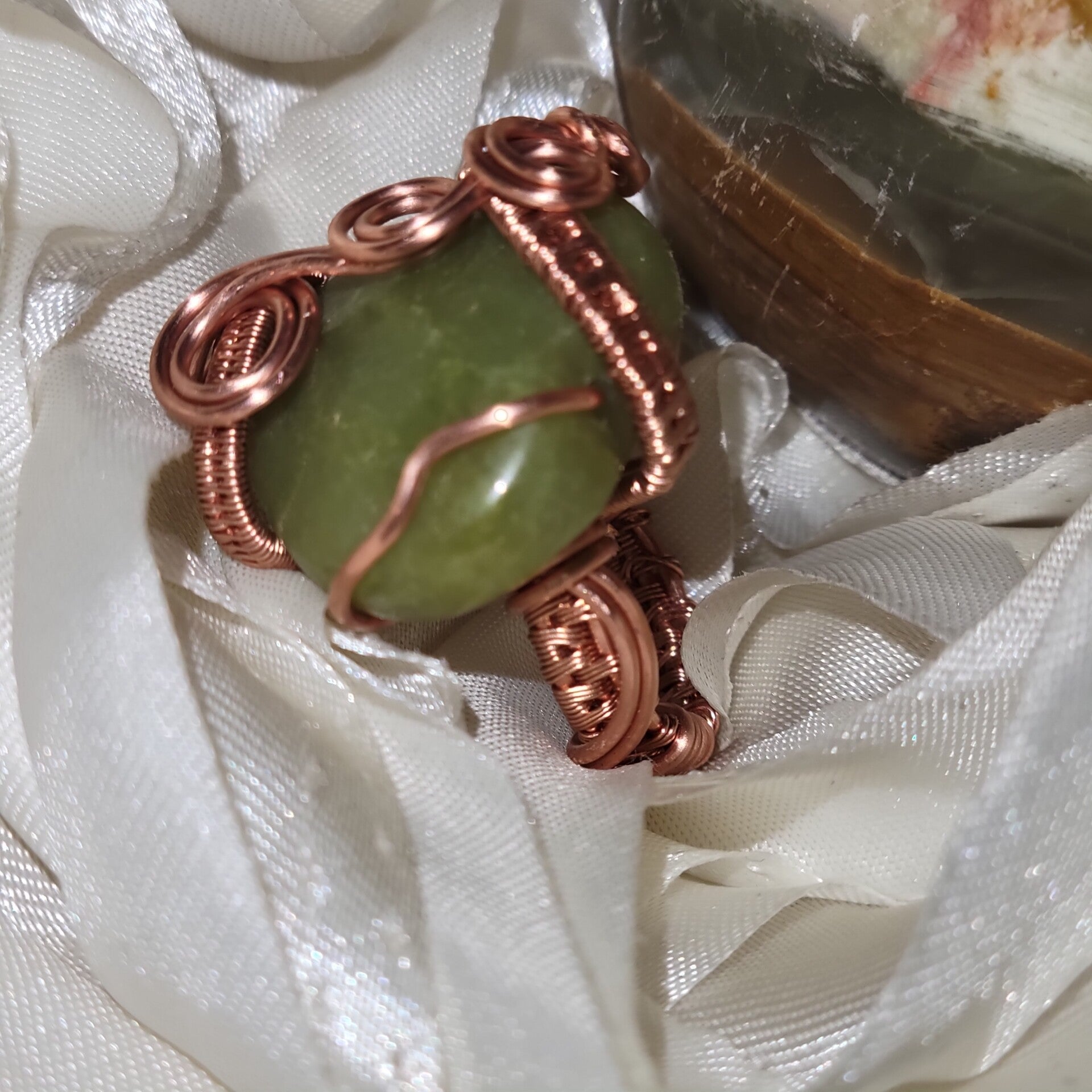 Handcrafted with intricate copper wirework, Jasira carries the strength of jade and the power of the heart. This one-of-a-kind ring features a natural green jade heart, a stone long revered as the guardian of love, balance, and abundance.