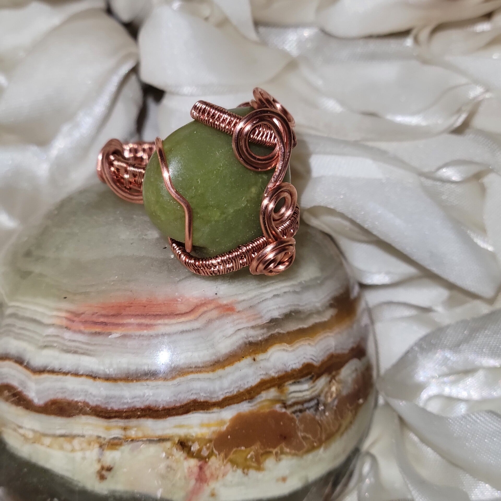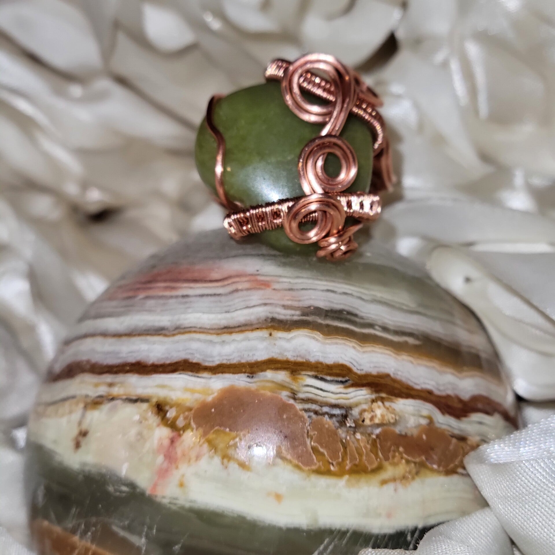 Green Jade resonates with the Heart Chakra, helping to release emotional blockages, attract harmony, and encourage compassion for self and others. Wrapped in copper, its energy is amplified—flowing straight into your hands, so every action you take carries love, strength, and courage.