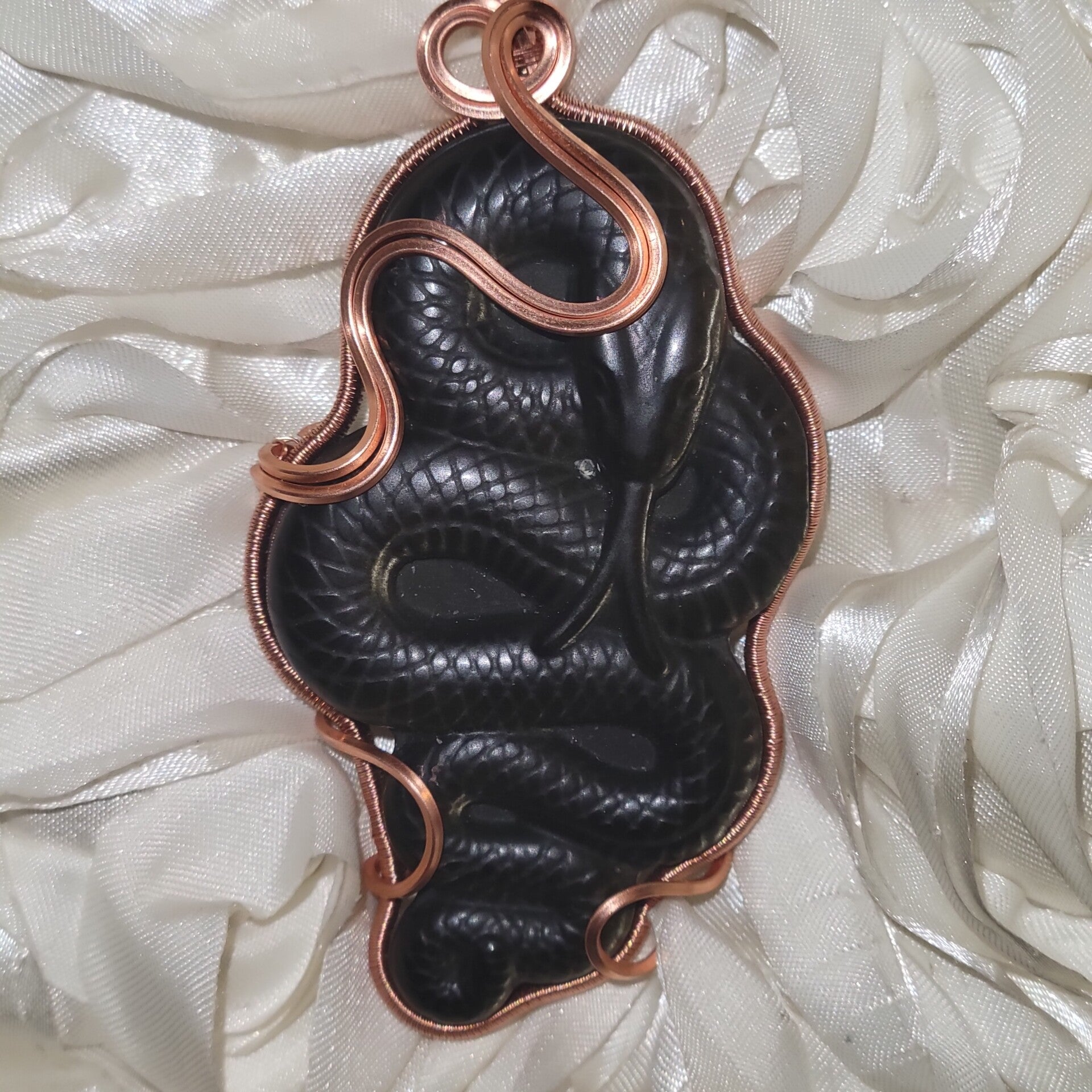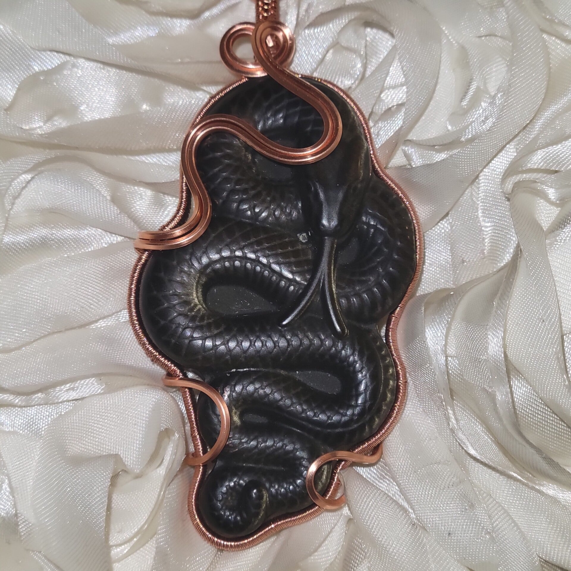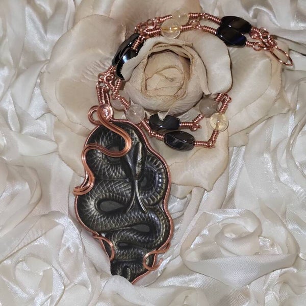 Step into the energy of Kaelira, a pendant that radiates dark seduction and divine protection. Hand-wrapped in copper, this carved cobra centerpiece golden sheen obsidian is accented with hematite and citrine beads, forming a magnetic blend of shadow and light.