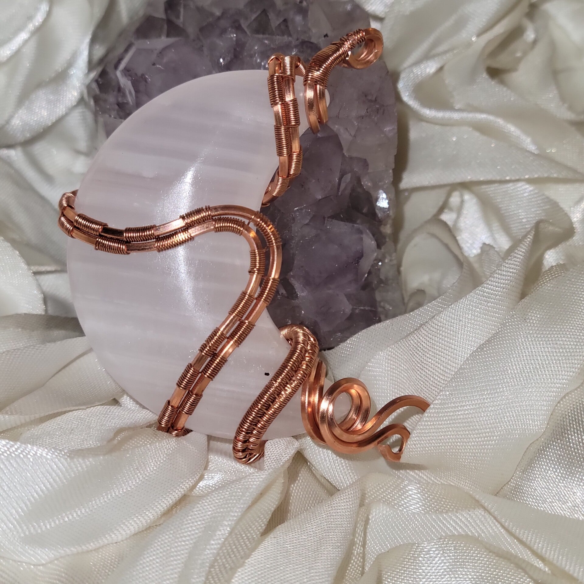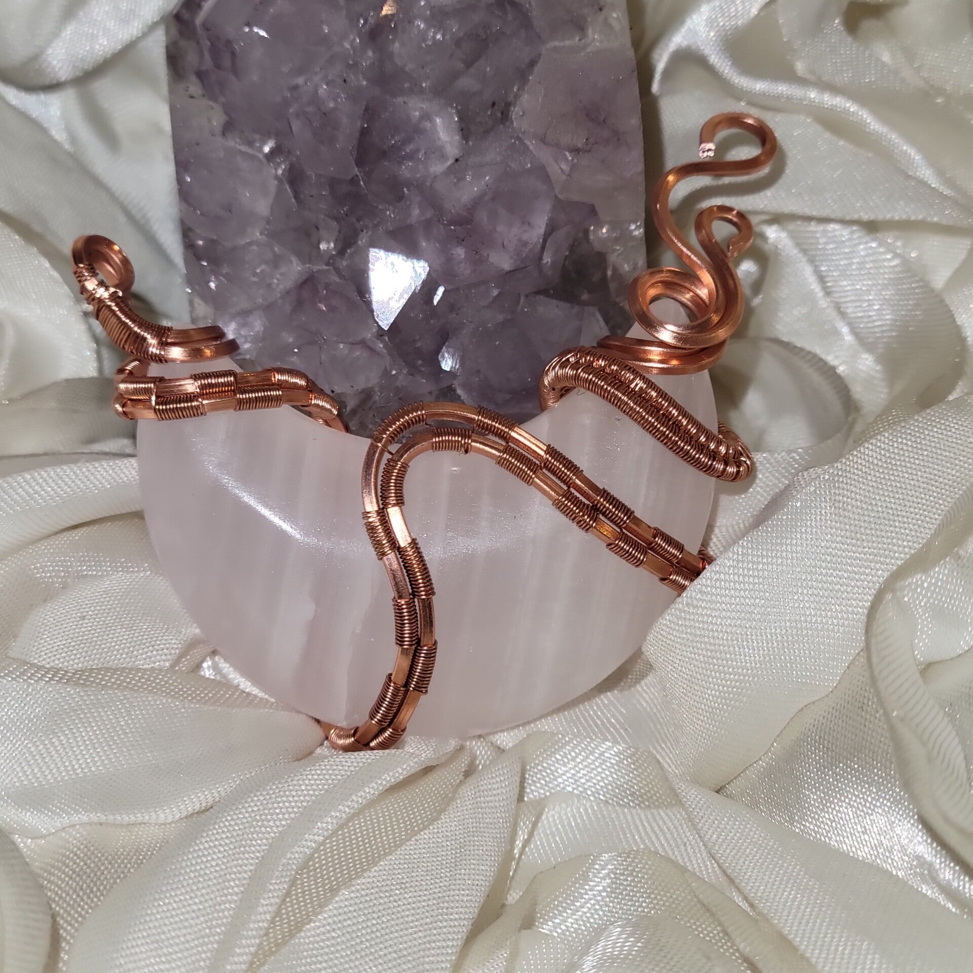 Roselle is a handcrafted Mangano Calcite crescent moon, lovingly wrapped in warm copper. This gentle piece carries the energy of soft moonlight and blooming roses, reminding you to embrace tenderness, love, and inner peace.