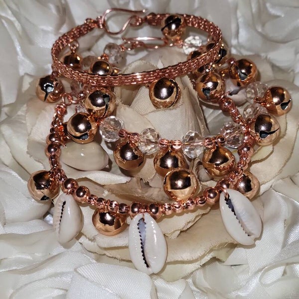 Together, Nyelle, Soriel, and Amaira create a symphony of protection, clarity, and abundance. Bells clear away negative energy, purify the aura, and bring the spirit back to center. Cowries attract prosperity and honor legacy, while copper grounds and heals the body’s energy flow. Stacked as a trio, these bracelets form a sacred rhythm—keeping you aligned, shielded, and connected to self.