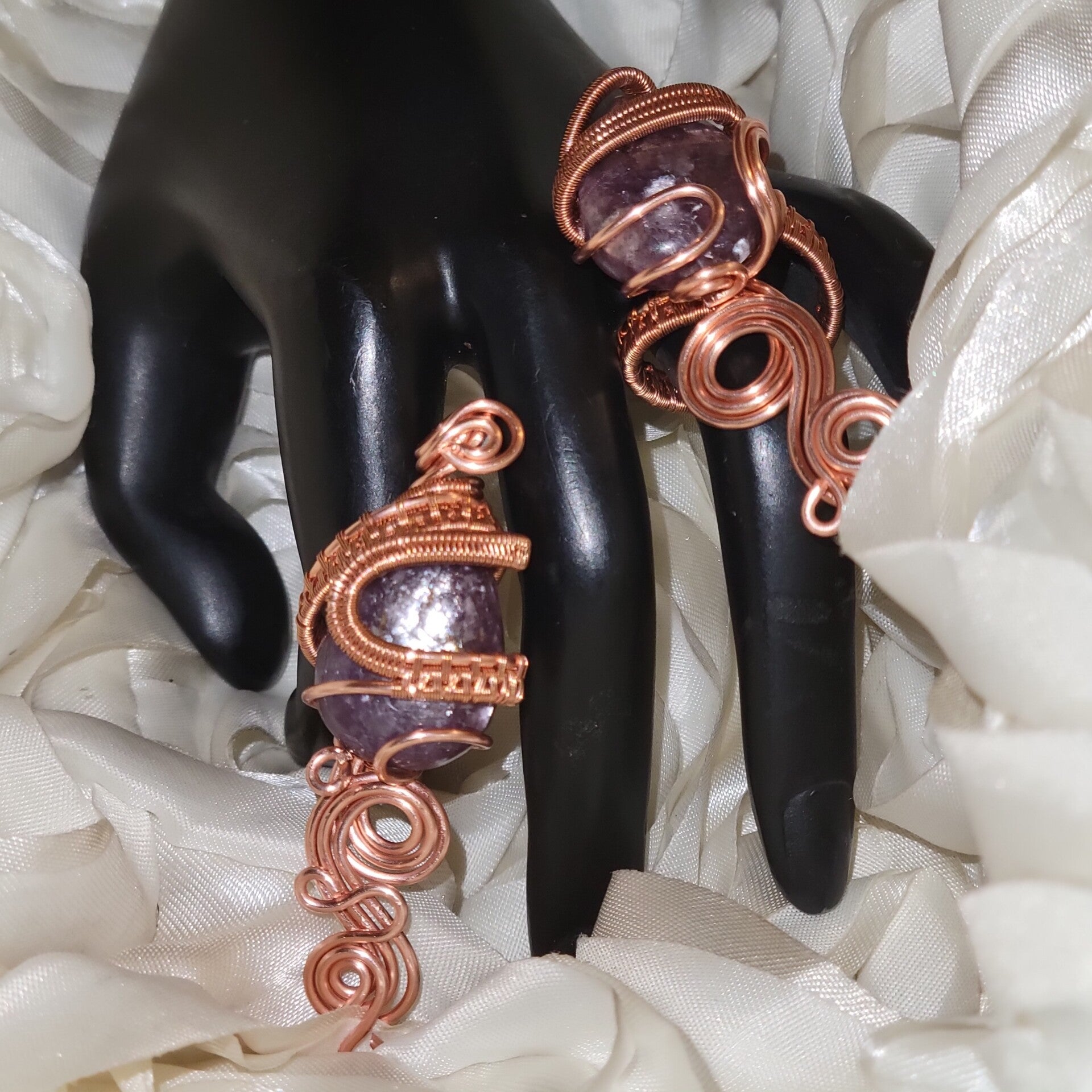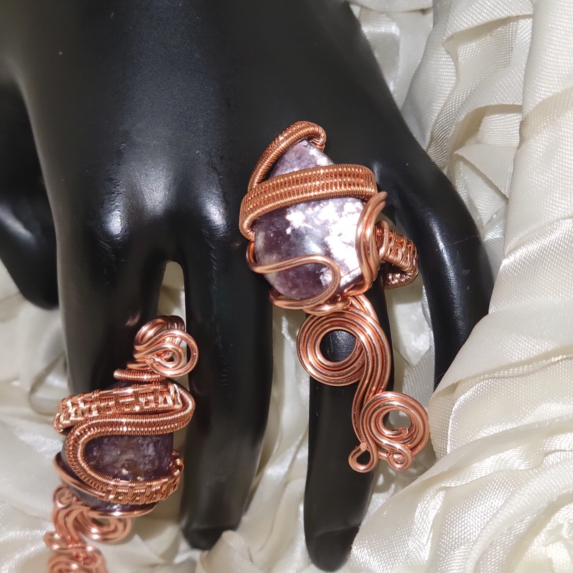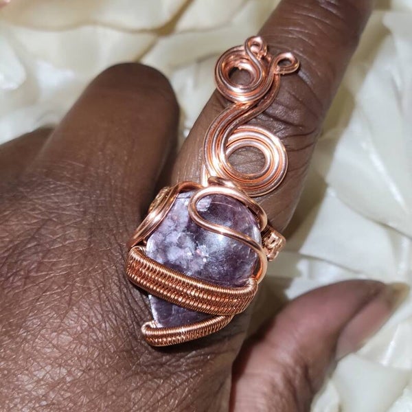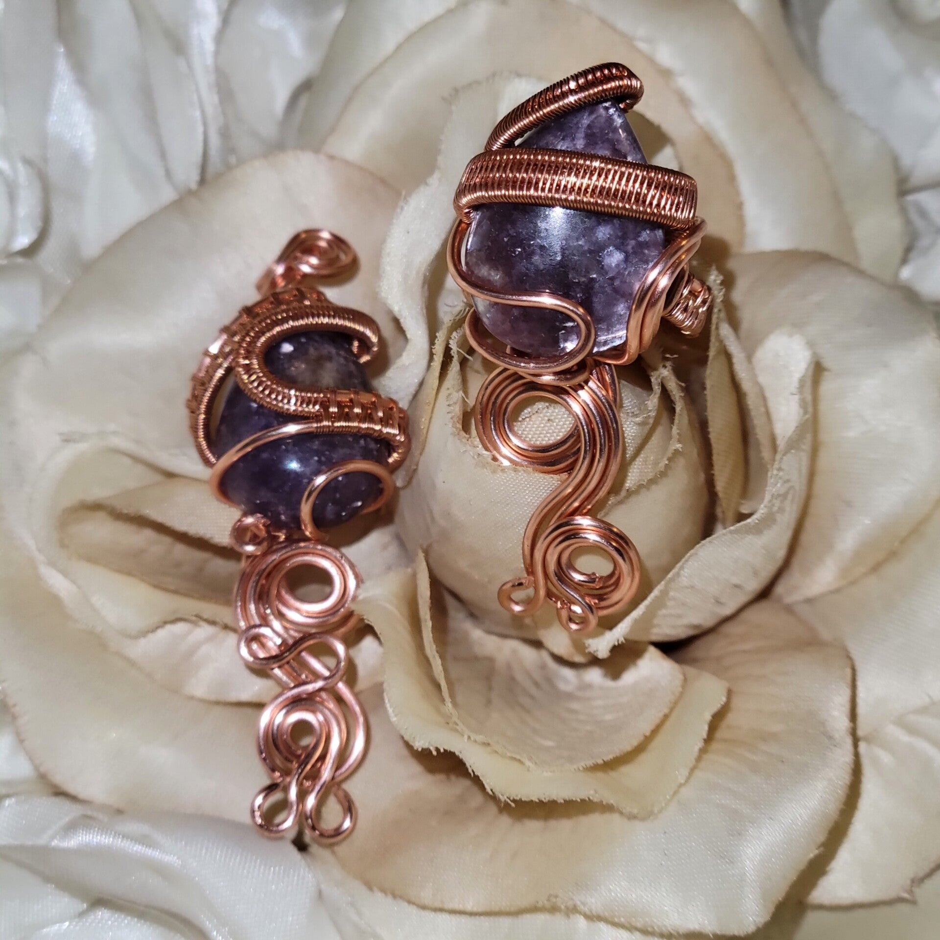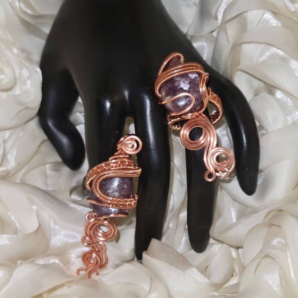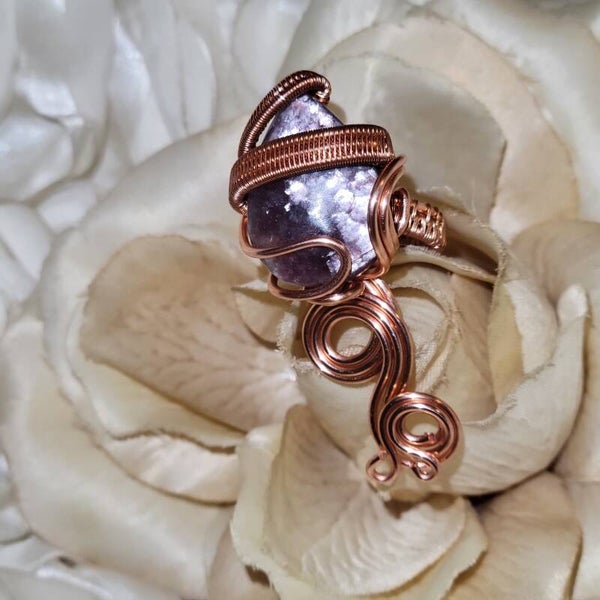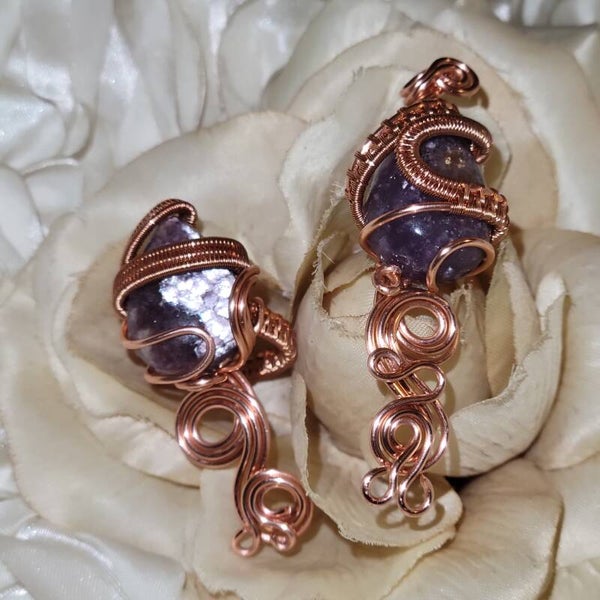 Step into the mystical power of royalty with Veyara, a handcrafted copper-wrapped set featuring both a pendant and ring, adorned with the rare and ethereal Purple Mica. This gemstone is a natural variation of Lepidolite, carrying the lilac-to-violet shimmer that has long been associated with divine femininity, psychic awareness, and inner transformation.