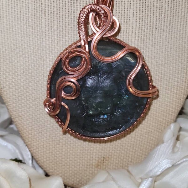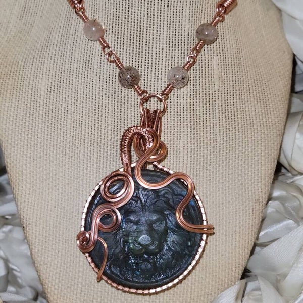 N’kosi (meaning “lion/king” in Zulu) embodies the fearless spirit of royalty, protection, and divine power. This one-of-a-kind pendant features a hand-carved lion face in a matte finish Labradorite, adorned with clear Super Seven beads, all intricately wrapped in warm copper wire.
