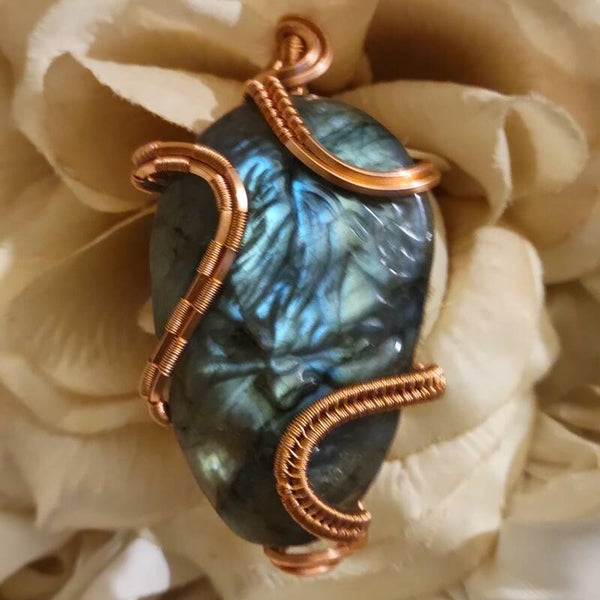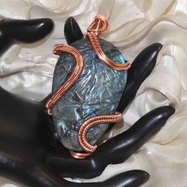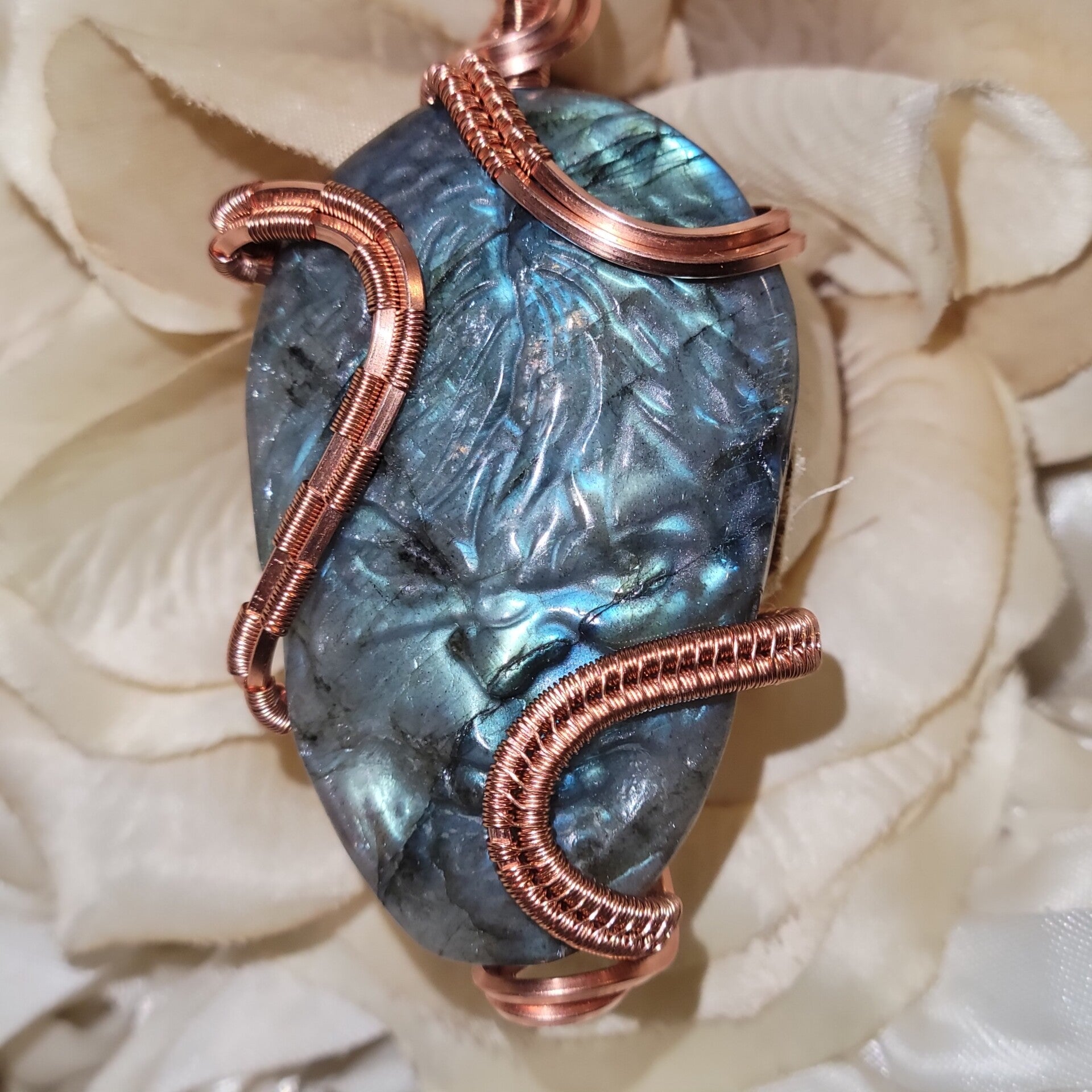 Enter the shadows with Cryptalis, a hand-carved labradorite monster pendant wrapped in copper wire. Labradorite is known as the stone of transformation, protection, and hidden realms—its mystical flashes said to open the doorway between worlds. The carved face of Cryptalis embodies the unknown creature that dwells in the depths of imagination, a guardian of secrets and a reminder that what we fear often carries hidden wisdom.
