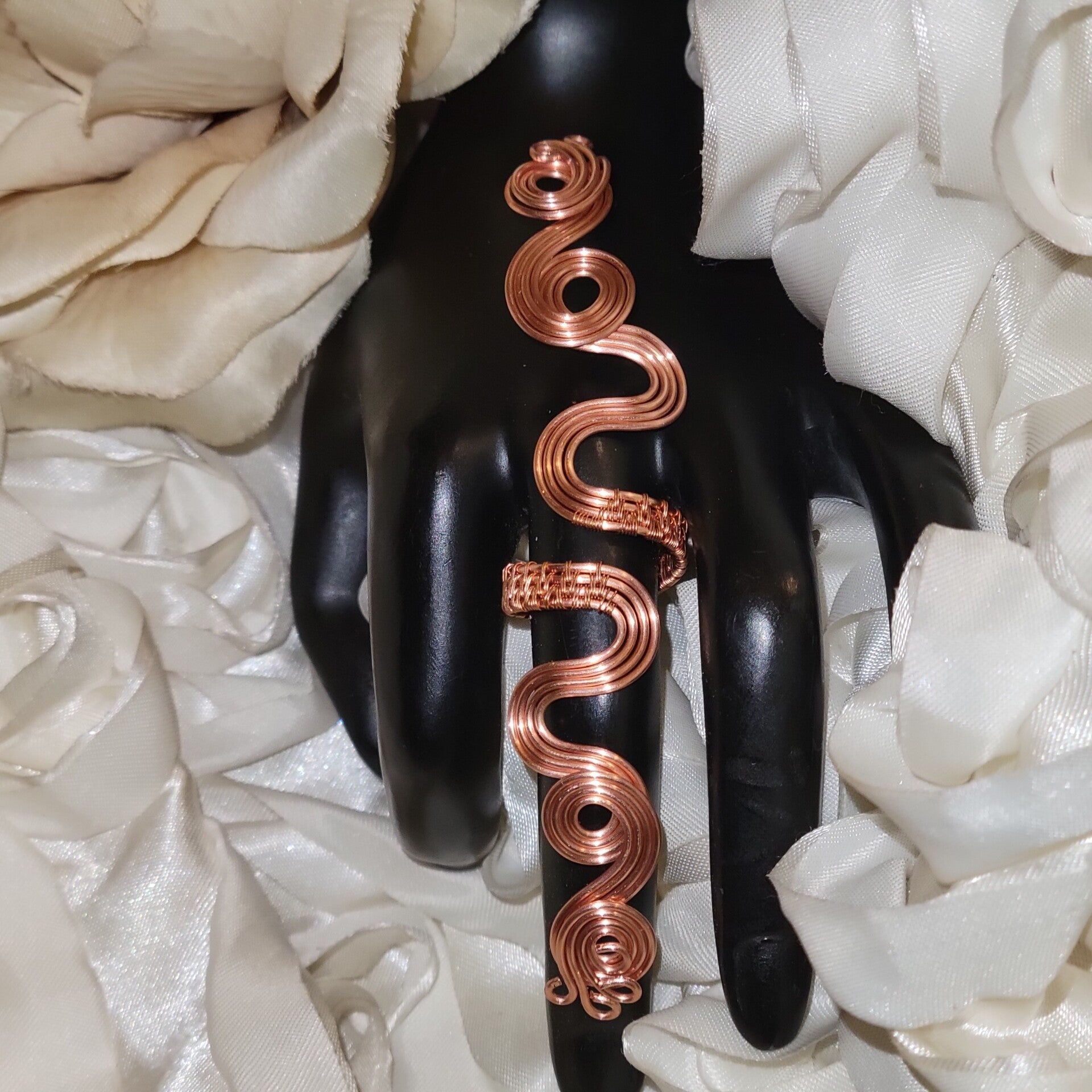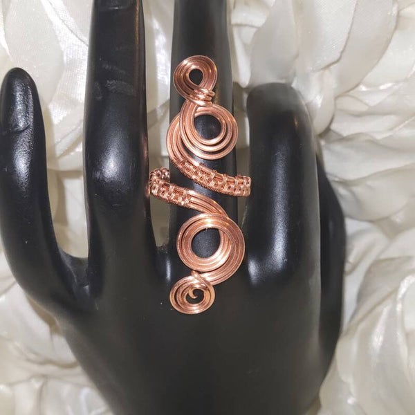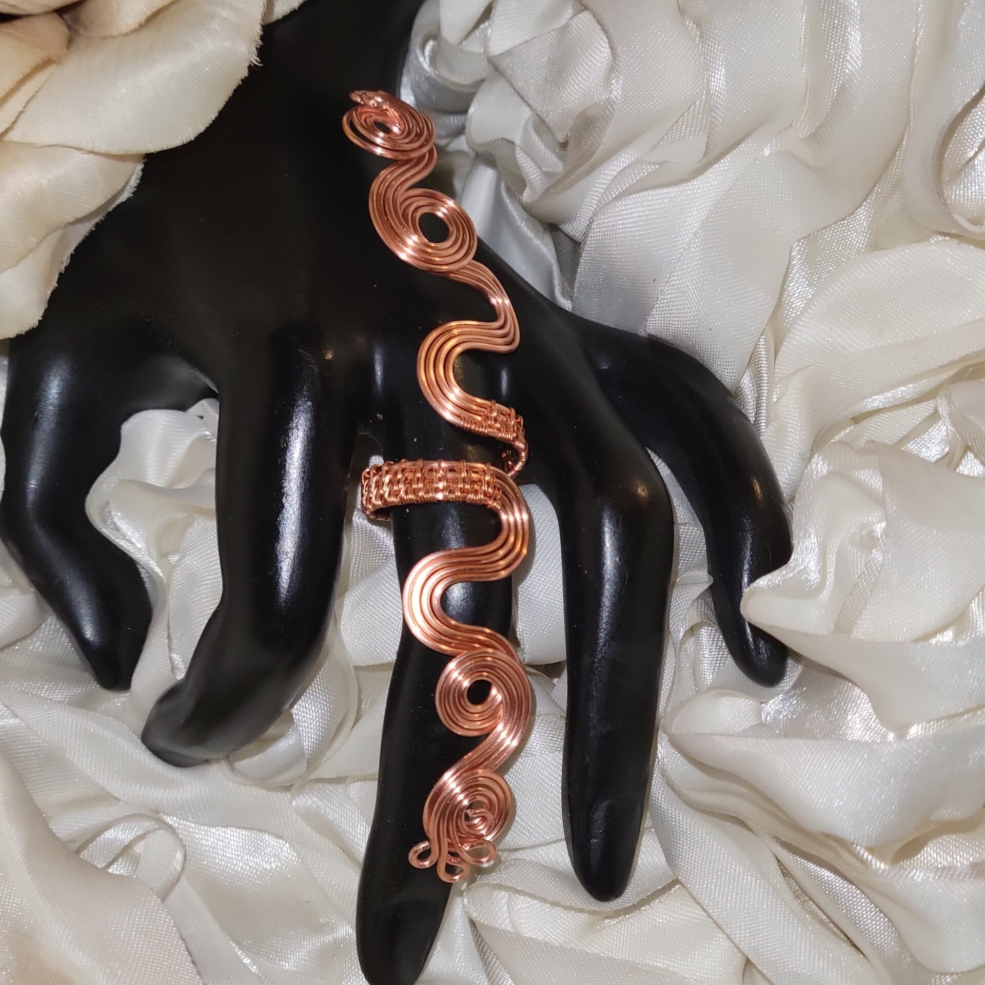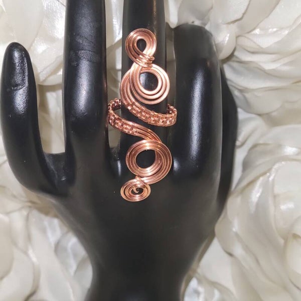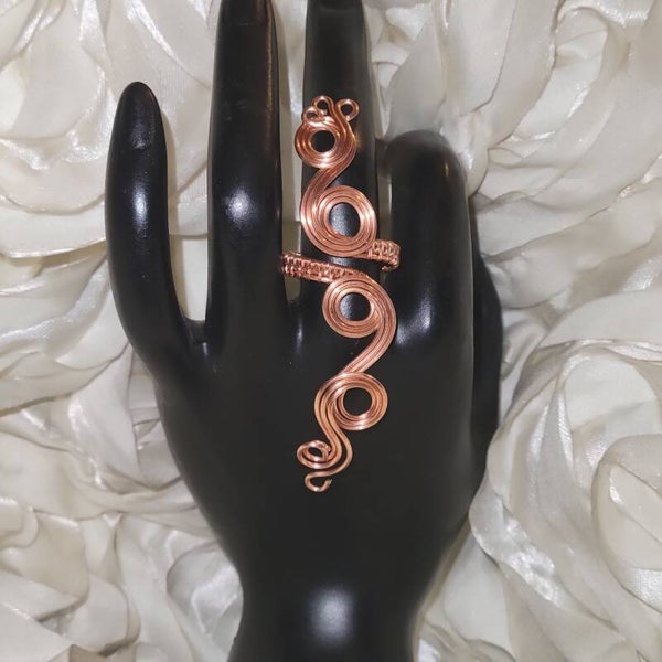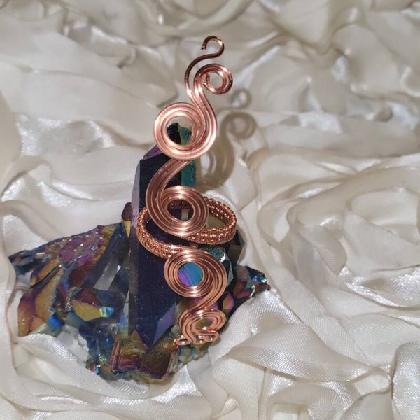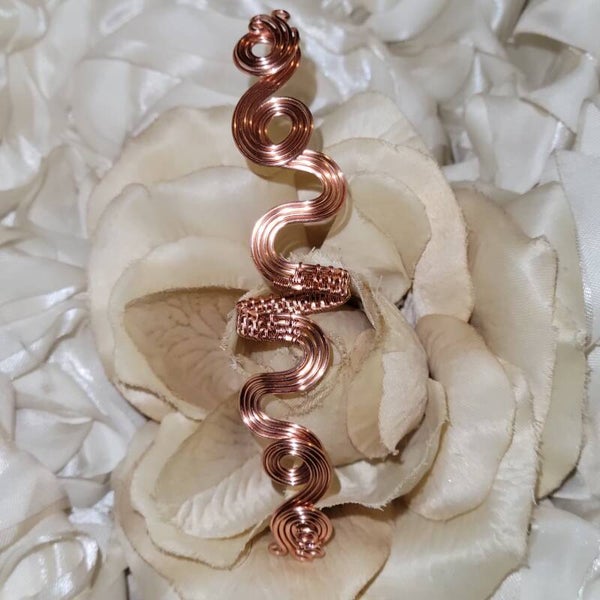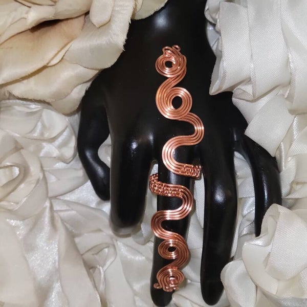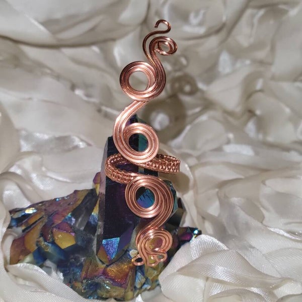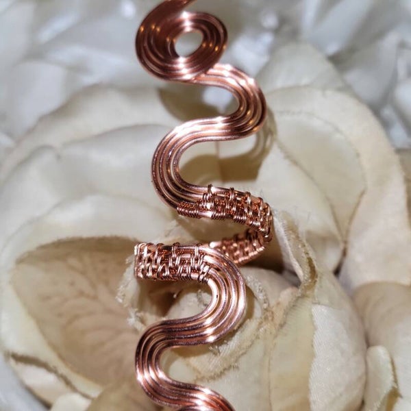 Handcrafted entirely from pure copper, Neryah is a bold and elegant adjustable ring measuring approximately 5 inches long. The coiled design embodies serpent energy — representing wisdom, rebirth, and divine protection.