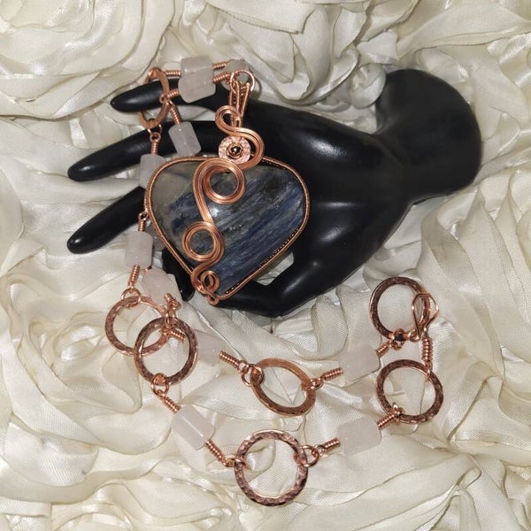 At her core lies a deep ocean-blue Kyanite heart, wire-wrapped in pure copper to amplify flow and energy. Surrounding her are icy Quartz barrel beads, amplifiers of light that raise and purify every vibration they touch. Together, they create a sacred synergy: Kyanite aligns and clears, while Quartz magnifies and expands that alignment — like truth meeting divine clarity.