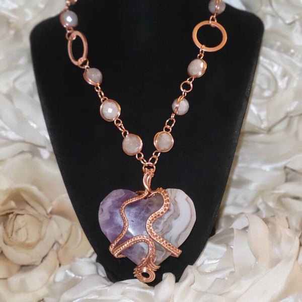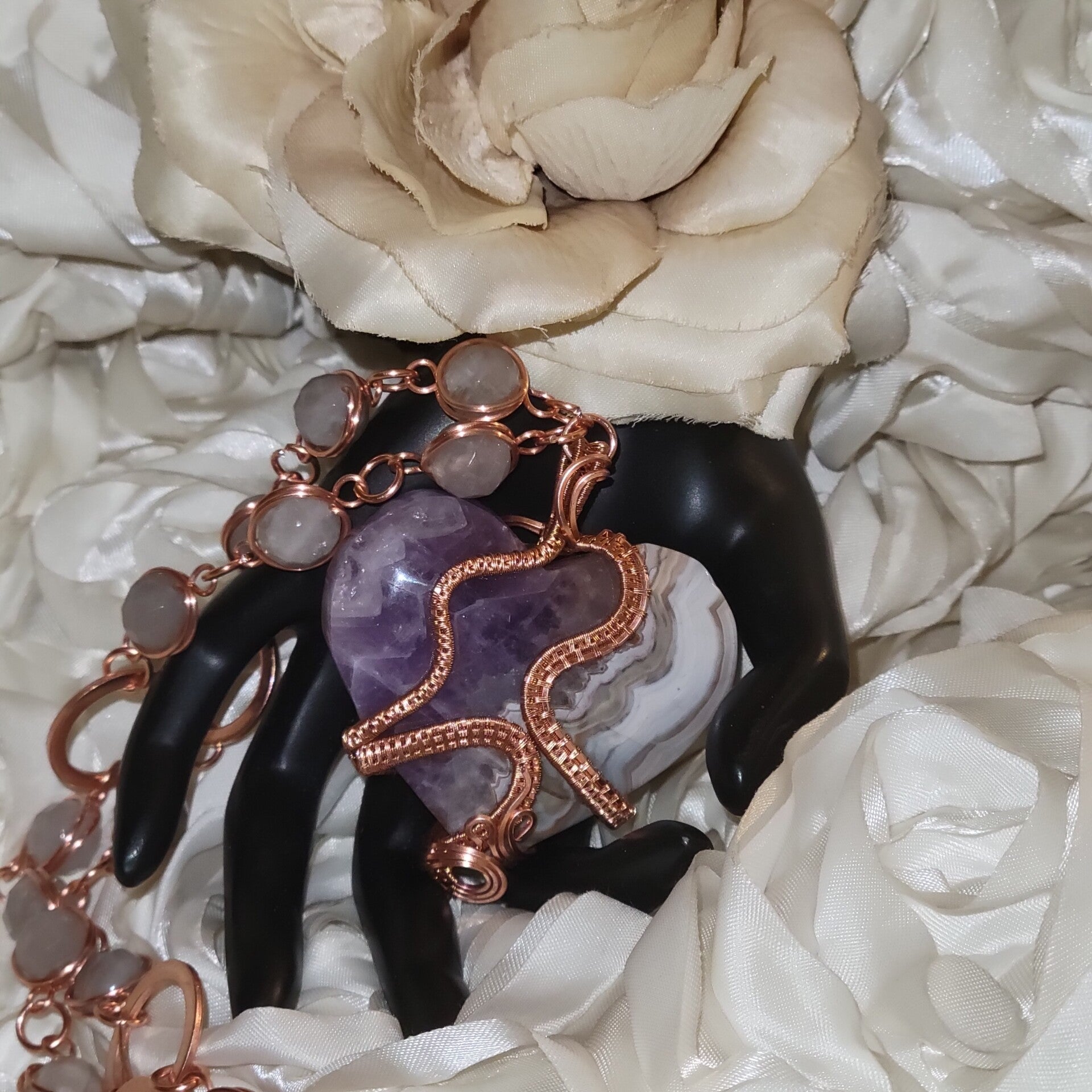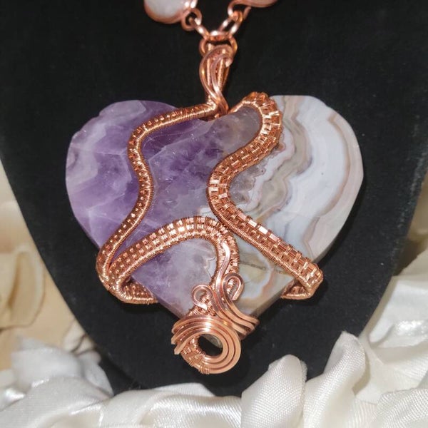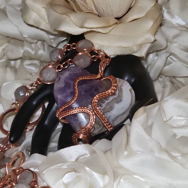 Born beneath rhythm and reflection, Avarae carries the quiet ache of something once divine. Hand-woven in copper, her heart reveals rippling lines of lilac and clouded cream — like emotion fossilized in stone. The curves of her weave move like soundwaves of a kept secret, grounding what words never said.