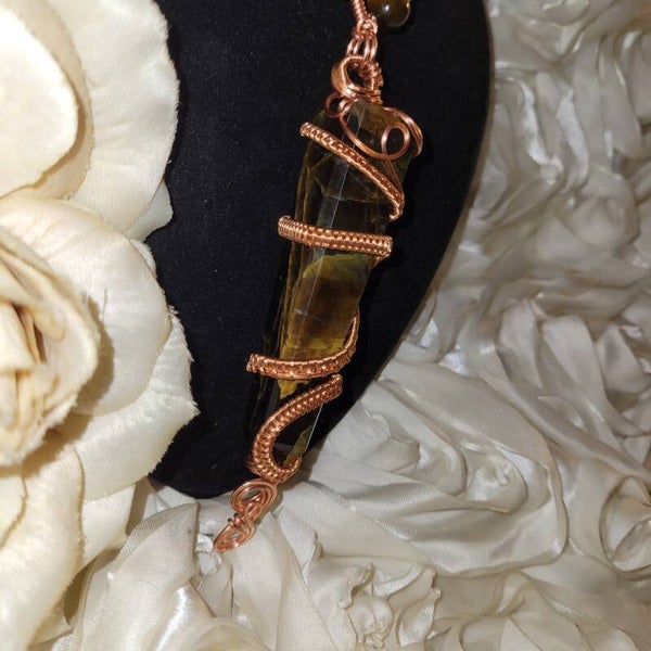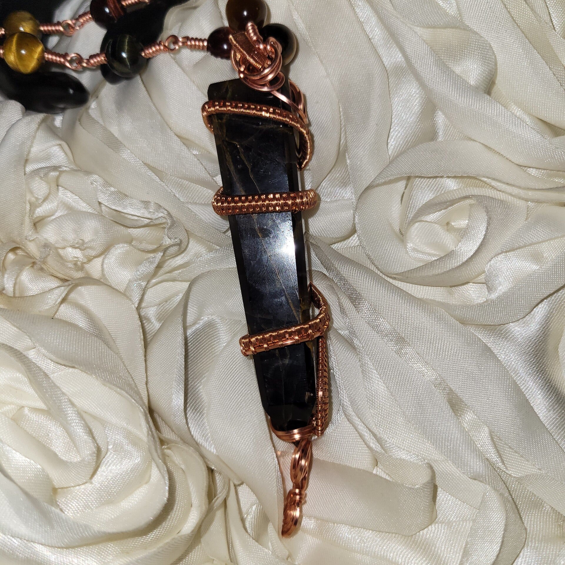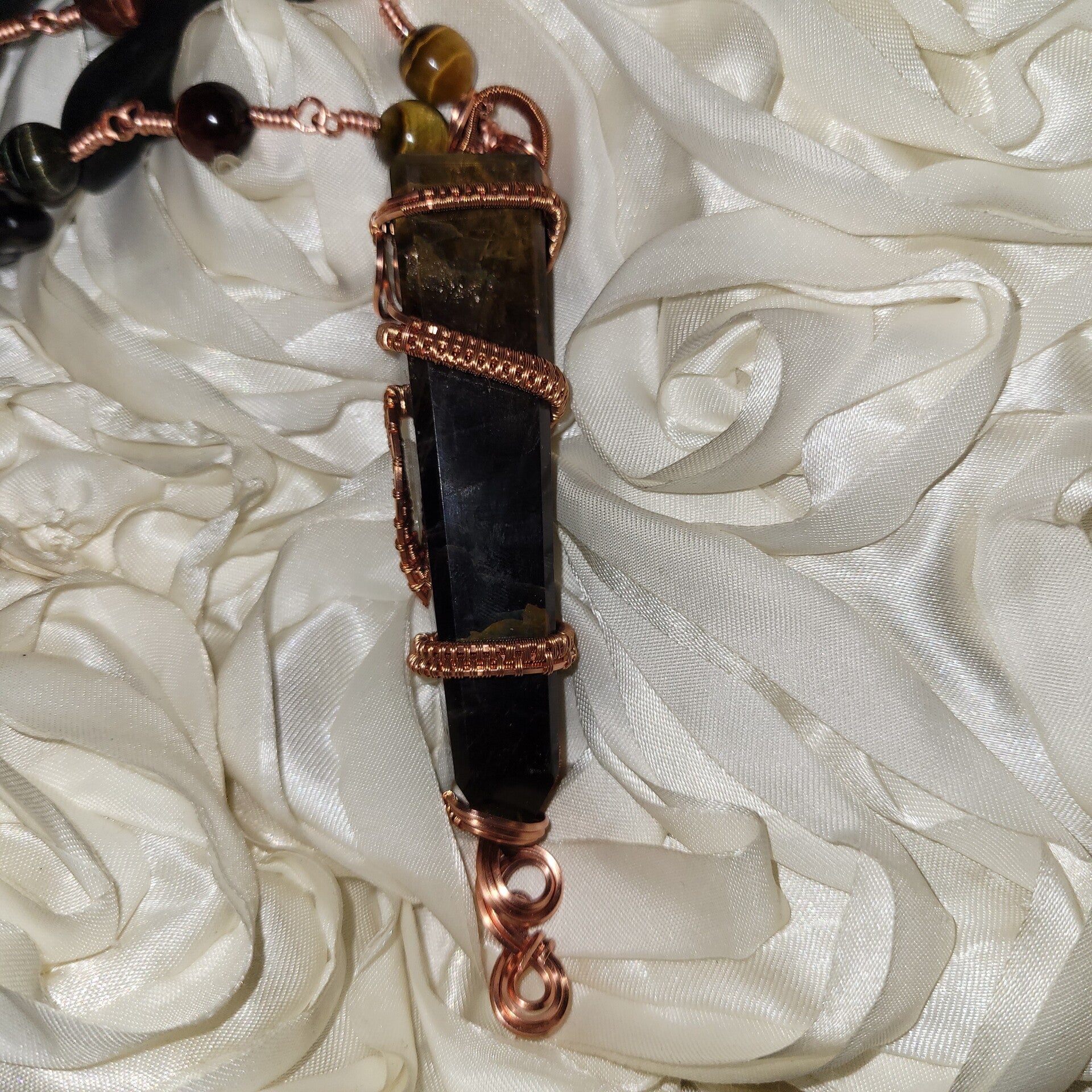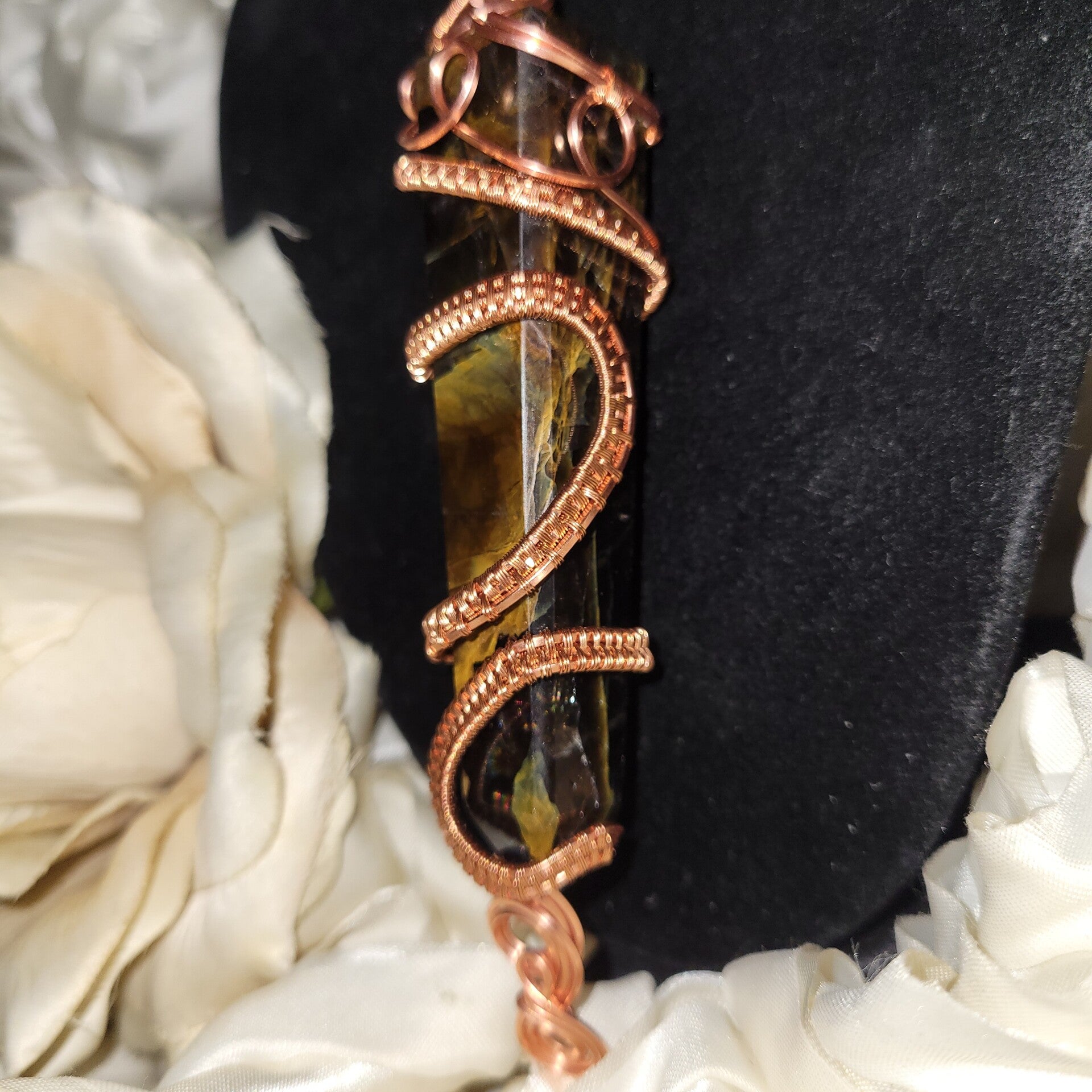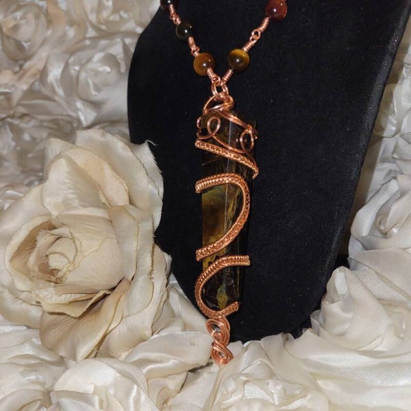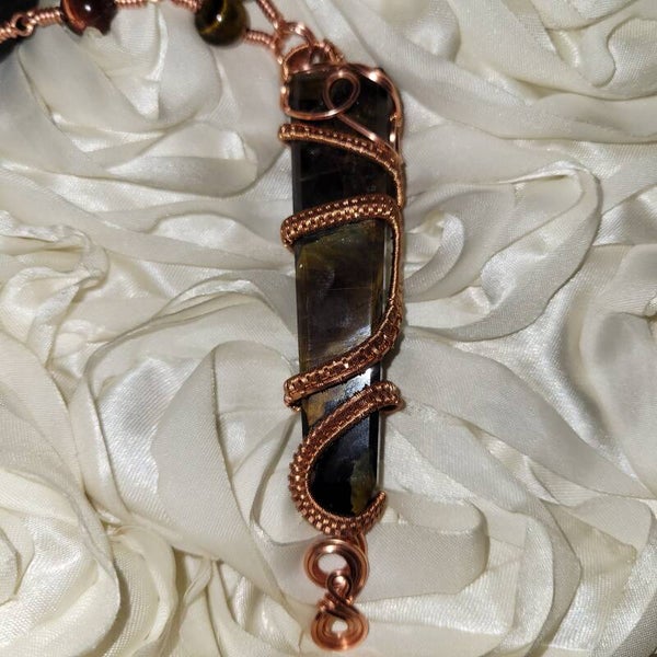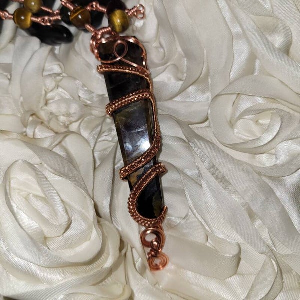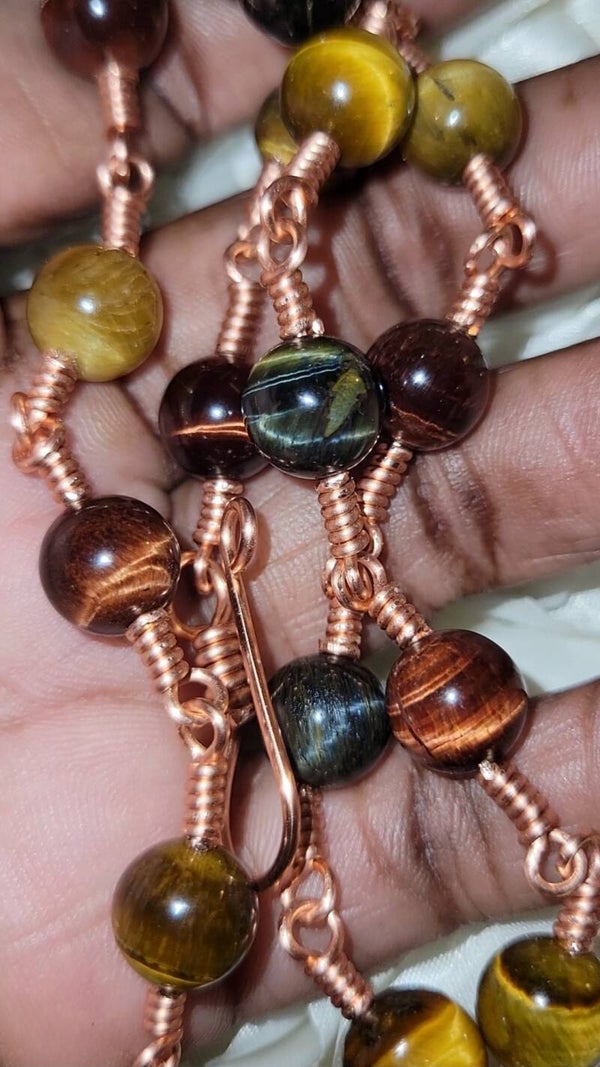 🤎💫Rhyzalei is a towering 5-inch chocolate golden healer wrapped in a full 360° copper design, adorned with red, gold, and blue tiger eye beads. She is bold, warm, royal, and deeply rooted — created to feel like an ancient artifact that once belonged to a sun priestess or earth queen.