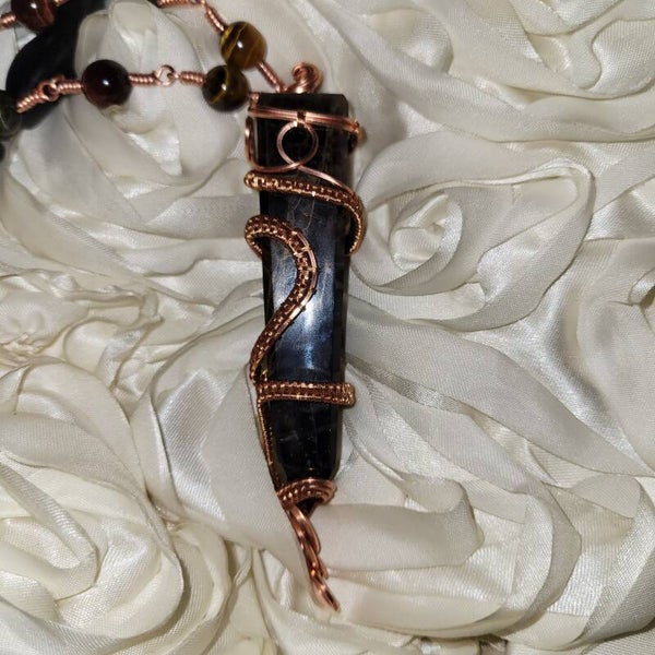 Her shape is powerful and unmistakable: a staff-like tower wrapped in spirals of copper, glowing with golden amber light at the center. As she turns, every angle reveals something different — a flame, a shadow, a window, a doorway. She is a true 360 pendant with no front or back; her energy flows continuously, creating a field of protection and grounding around the wearer.