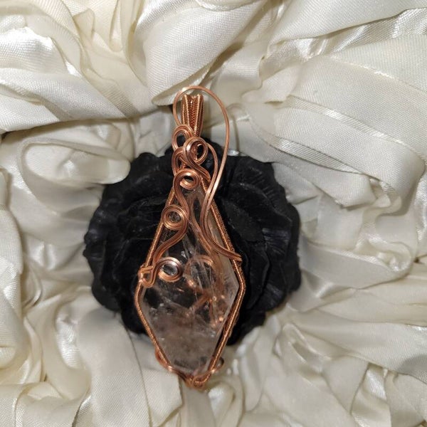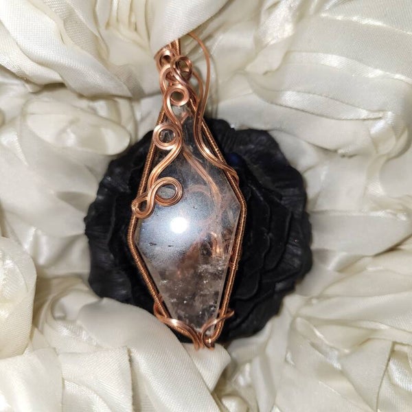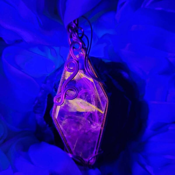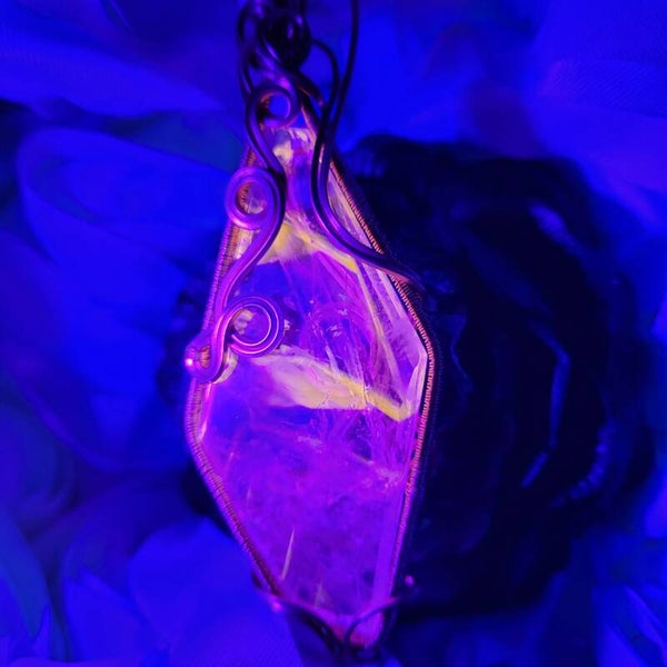 Aamari is a quietly powerful talisman crafted from clear powellite-infused quartz, wrapped in warm copper spirals that echo ancient sigils of protection. At first glance she appears delicate — crystalline, transparent, almost whisper-soft. But under UV light, her true nature reveals itself: a subtle heart-shaped glow, like two energies leaning toward one another, illuminated in golden powellite fire.