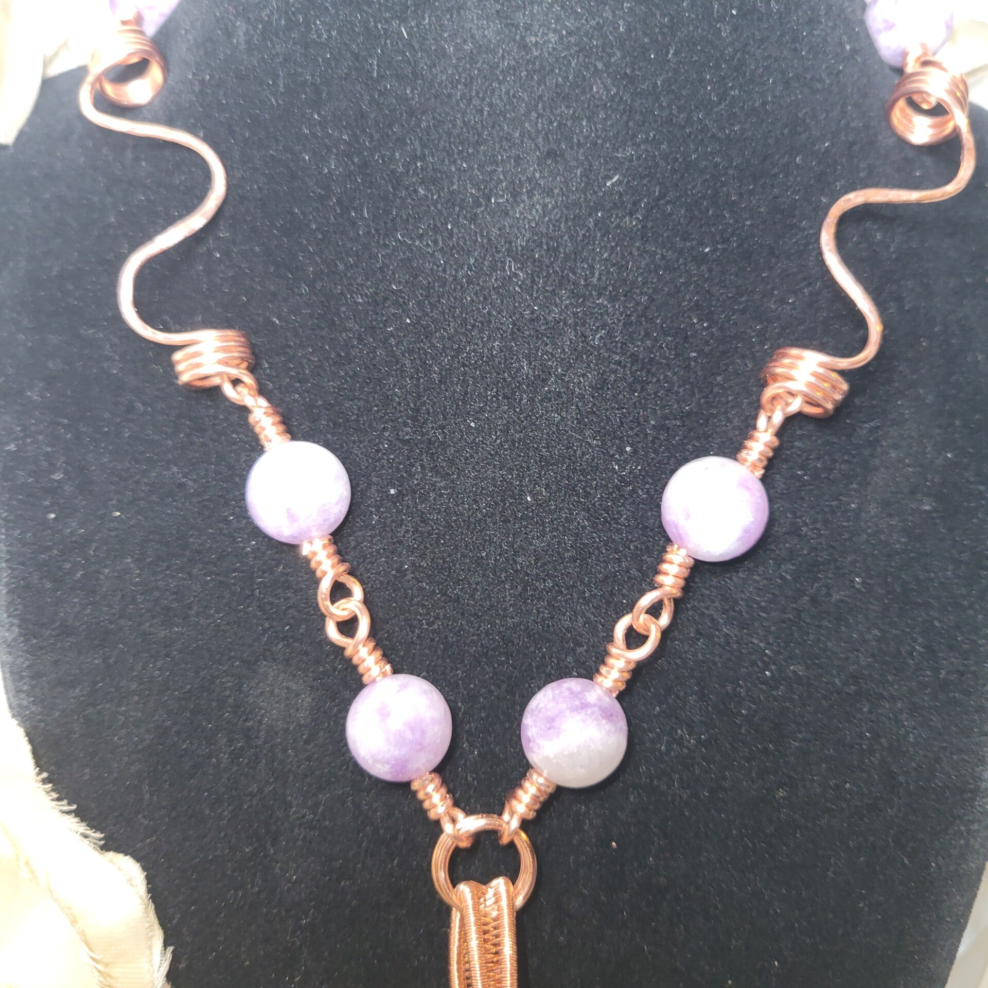 Lepidolite beads weave through her copper framework like whispers of calm, grounding Lumirae’s airy clarity with emotional balance and deep inner exhale energy. She is not loud. She is not forceful. She is steady, luminous reassurance.