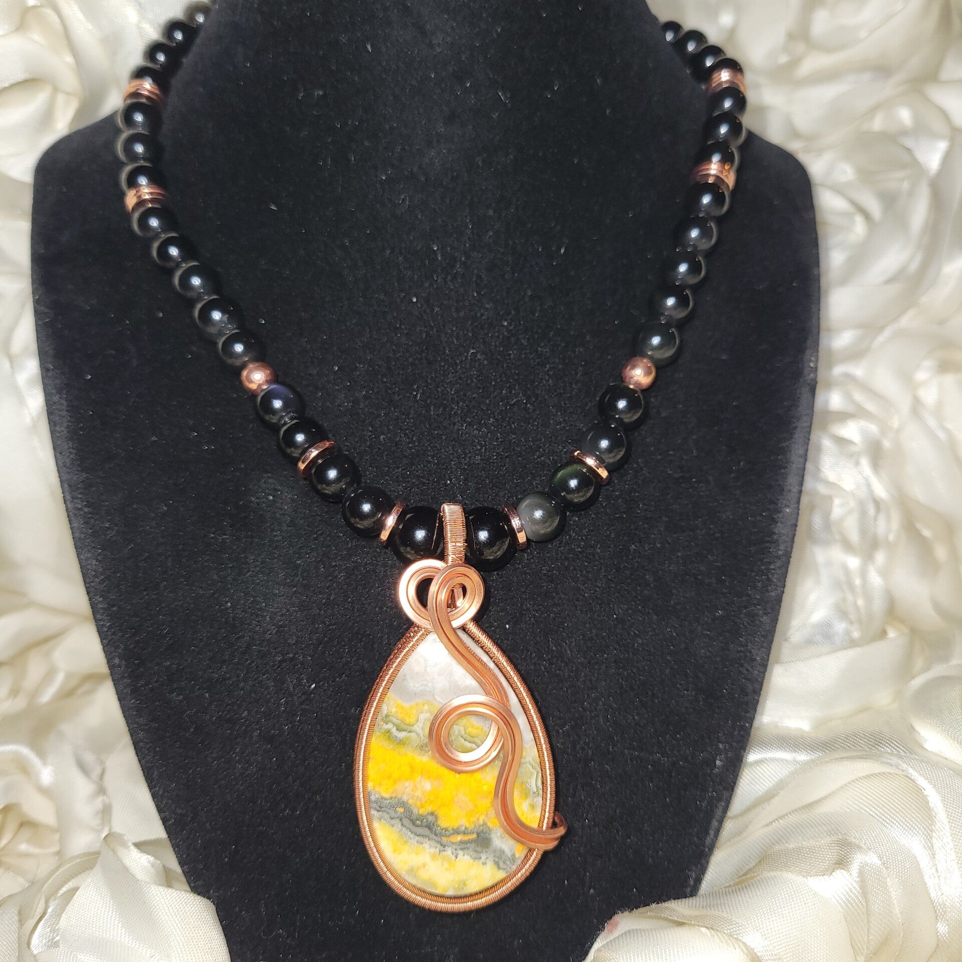 Bharani is a talisman of disciplined power, sacred endurance, and grounded protection. Wrapped in warm copper, she carries the steady pulse of Bumblebee Jasper, a stone of life force, courage, and embodied confidence. Her golden currents awaken motivation and resilience, encouraging you to stand firmly in your purpose without force or urgency. Bumblebee Jasper doesn’t rush — it commits — reminding you that true strength is sustained, not explosive.
