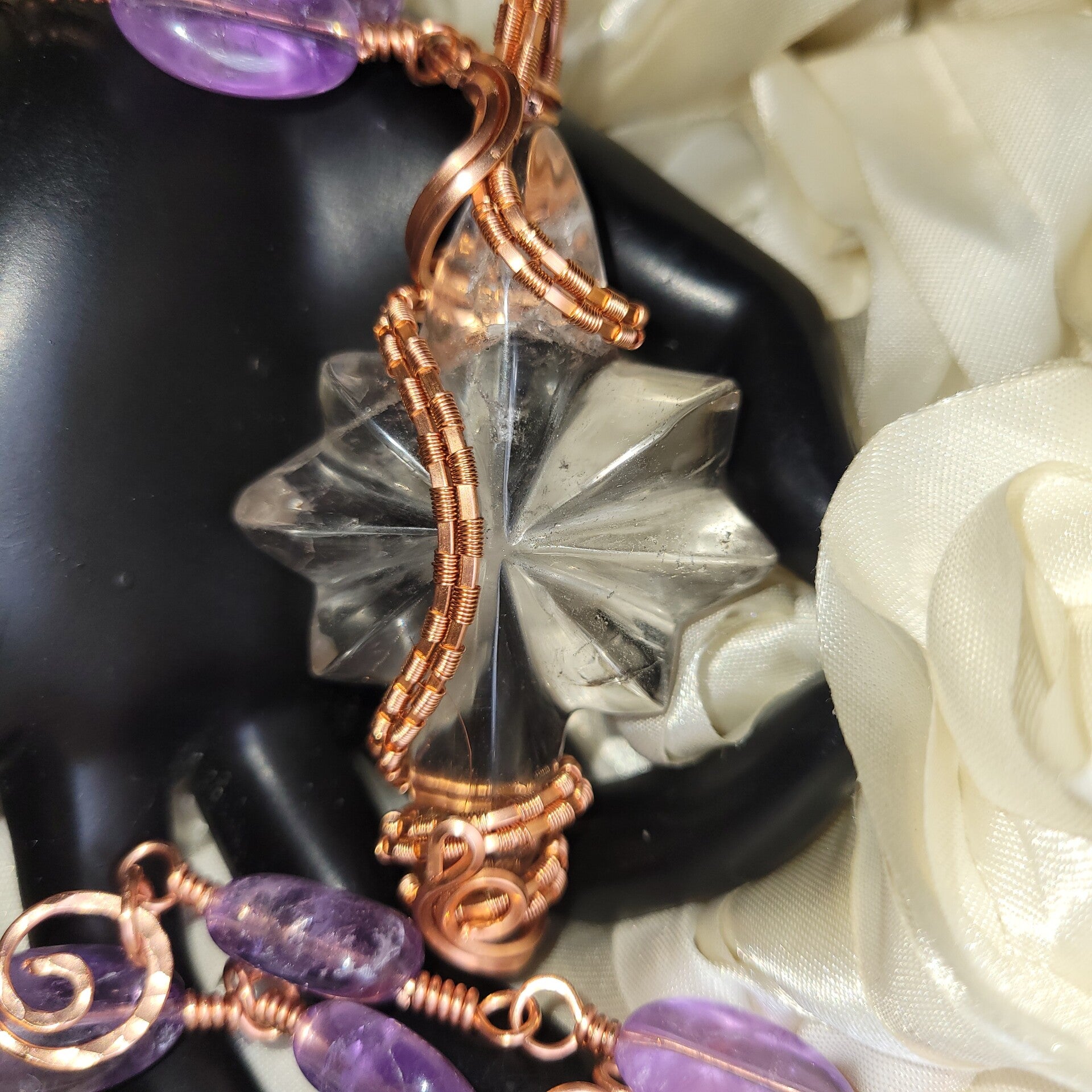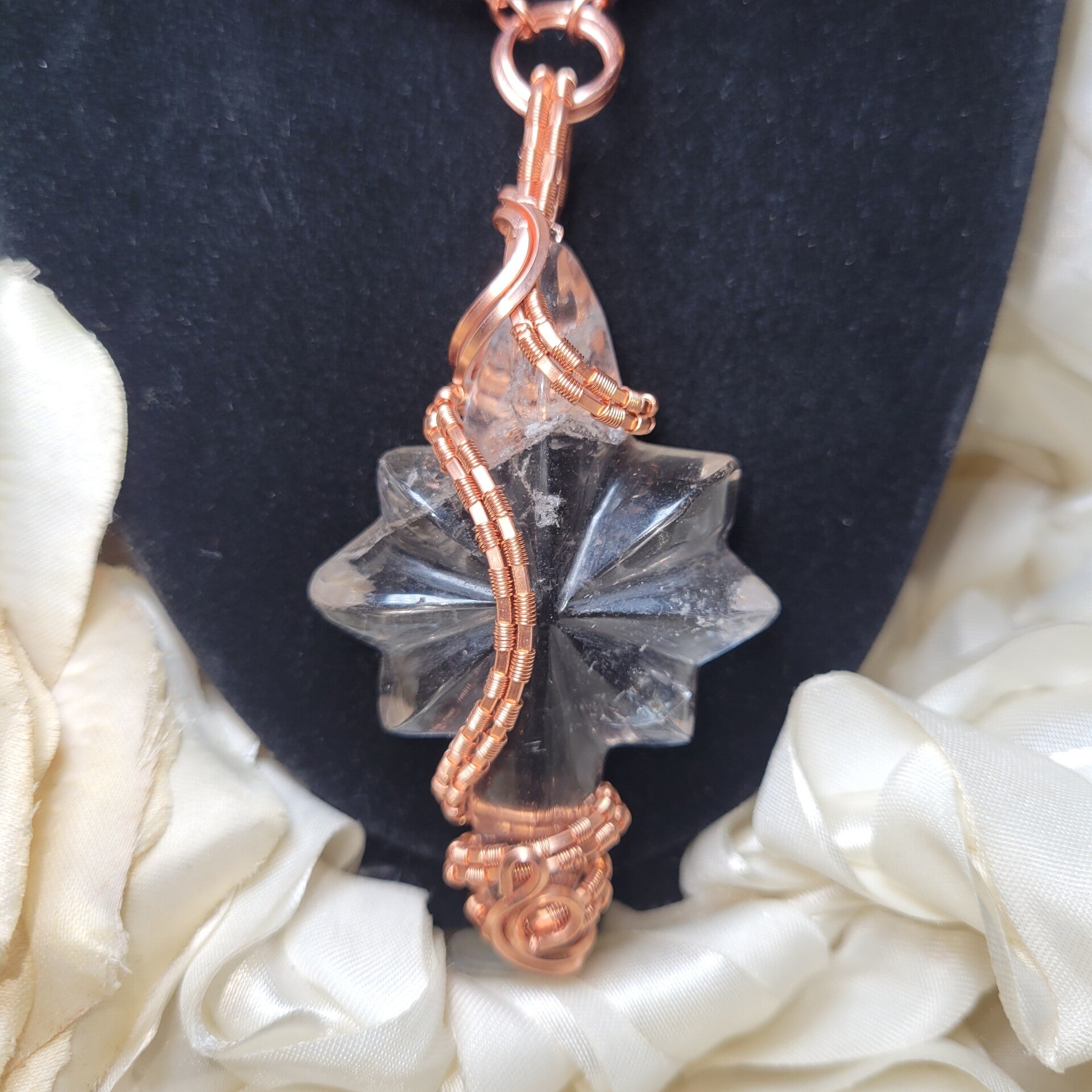 Carved from clear quartz, Stellara acts as a powerful amplifier of energy, intention, and clarity. Quartz is known as the master healer — a stone that clears stagnation, sharpens awareness, and magnifies the energy of all stones it is paired with. Wrapped in warm copper, her energy is grounded into the physical realm, allowing spiritual insight to flow seamlessly into action.