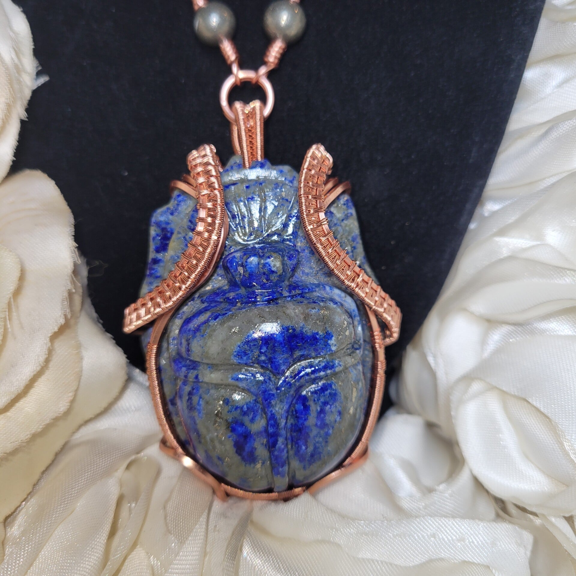 Khemyrié is a hand-wrapped Egyptian scarab talisman, carved from deep celestial lapis lazuli and crowned in warm copper, adorned with lapis and pyrite beads that echo the colors of night sky and sunlit gold. She carries the energy of rebirth, divine authority, and sacred protection — an artifact that feels discovered, not made.