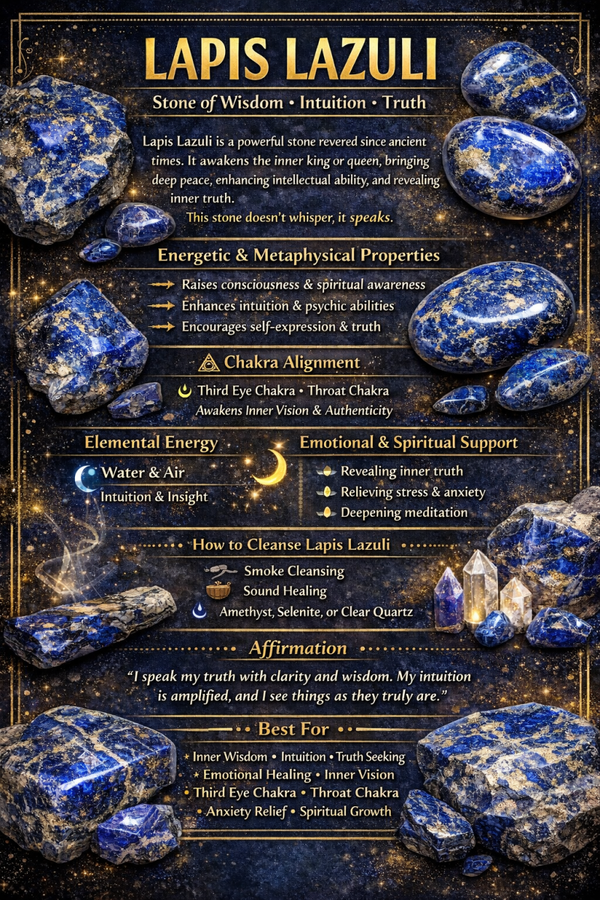 Lapis lazuli has long been revered as the stone of royalty, truth, and divine wisdom. Prized by Egyptian priests and queens, lapis was believed to open the gates of higher knowledge, strengthen intuition, and align the voice with truth. Its deep blue mirrors the heavens, while its natural gold flecks were once thought to be trapped starlight. Lapis activates the throat and third eye, empowering clear expression, spiritual authority, and inner knowing — making it a stone for leaders, speakers, and those walking a purposeful path.