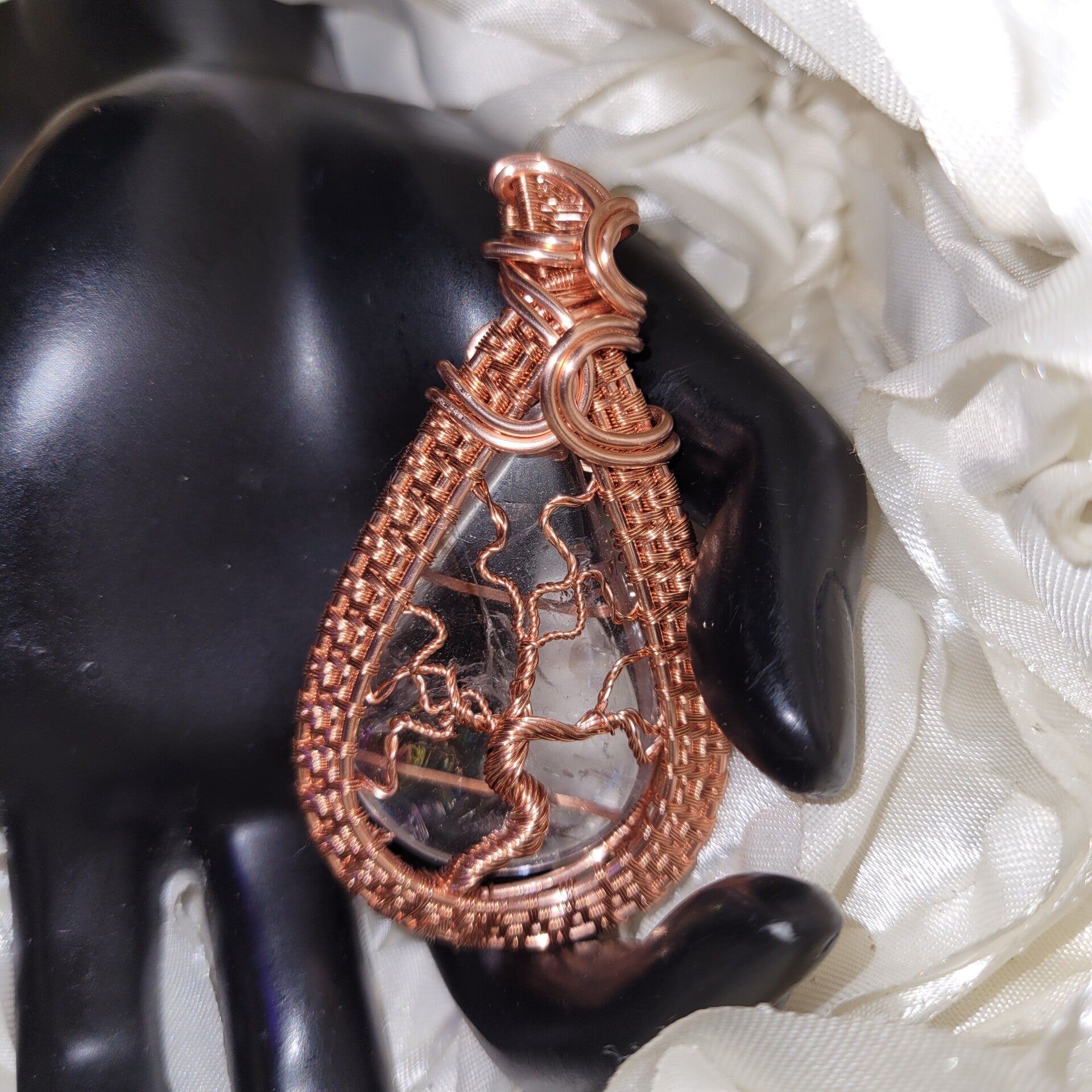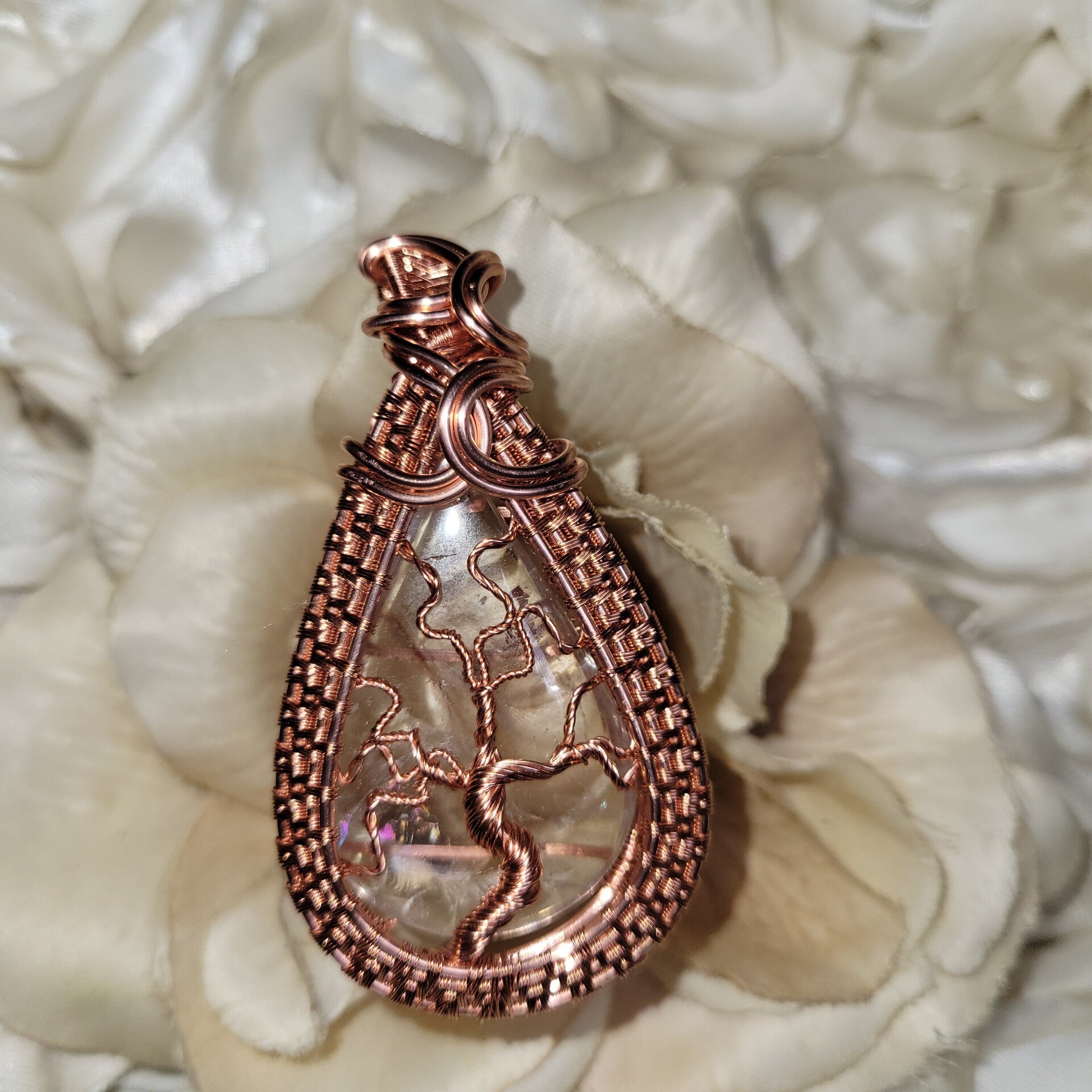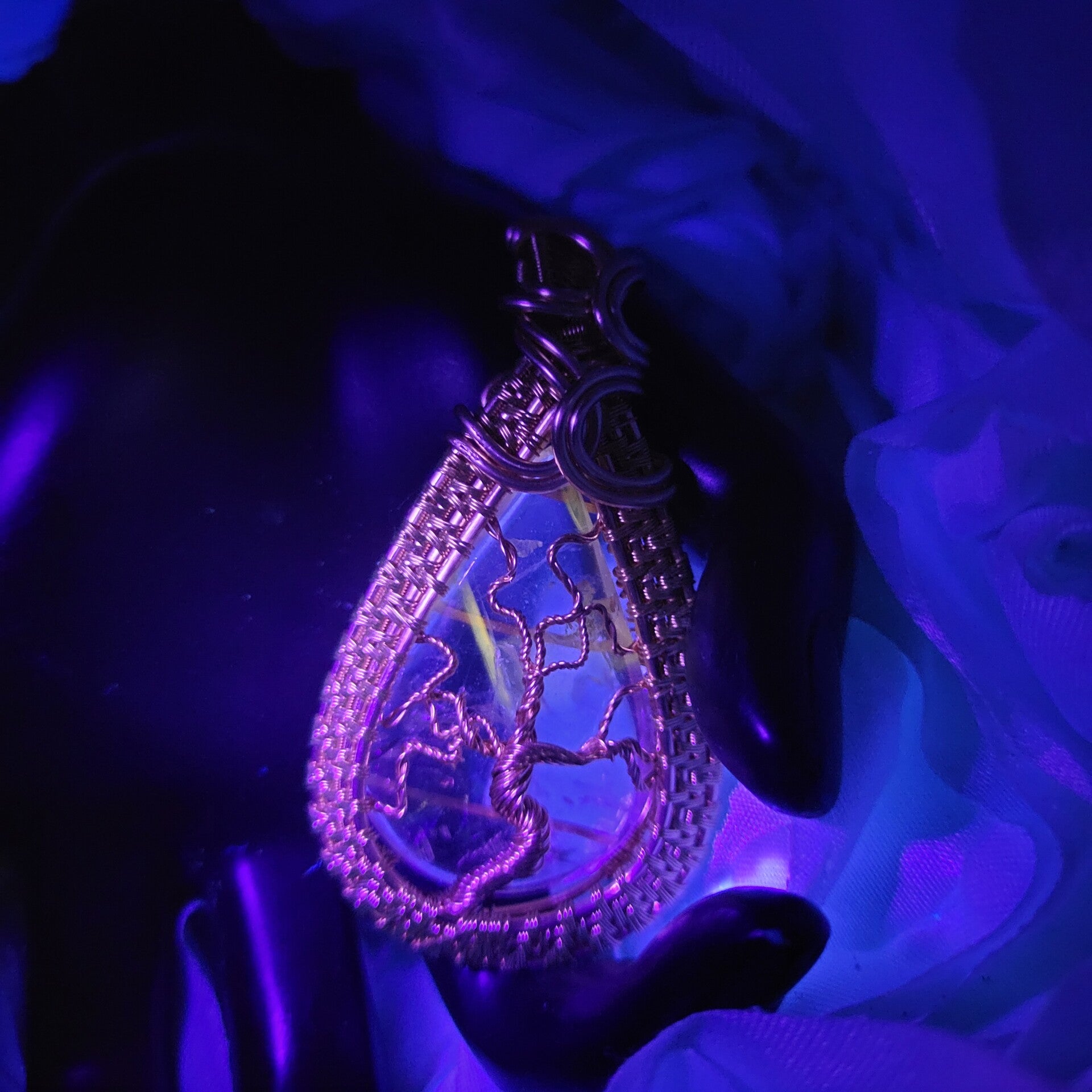 Ariýane is a teardrop-shaped Powellite talisman, copper-wrapped with a Tree of Life rising through her center like a living crown. She strikes gold lighten glow under UV light and carries a natural rainbow flash at her lower edge—an unmistakable mark of divine favor and alignment. Wrapped entirely in warm copper, Ariýane is a piece of lineage, sovereignty, and spiritual illumination.