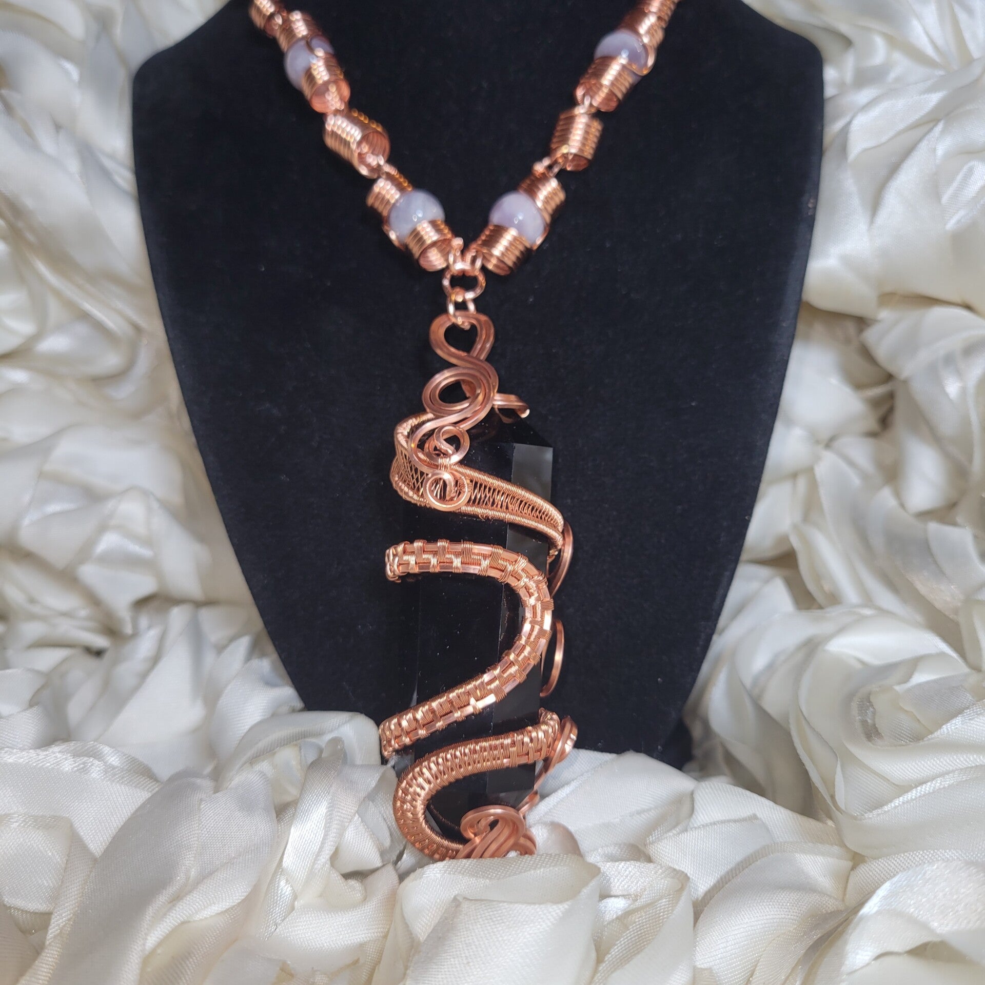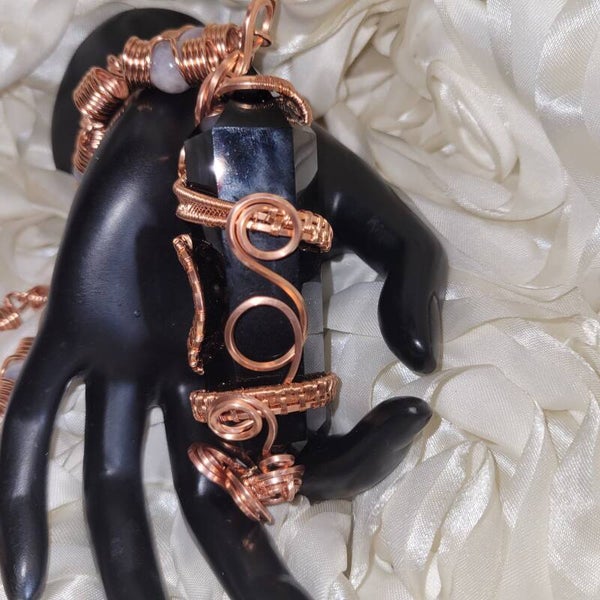 This piece features a striking 4½-inch Double Terminated Black Obsidian crystal, carefully secured in hand-woven copper that coils like sacred armor around her form. Each spiral reinforces both strength and intention, creating a powerful channel for energy flow from tip to tip. The 18-inch handcrafted copper chain, adorned with soft lavender aquamarine beads, balances her intensity with grace and clarity.