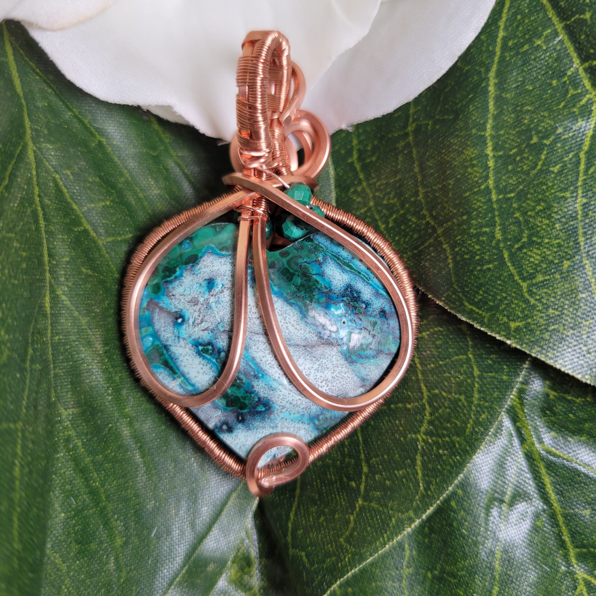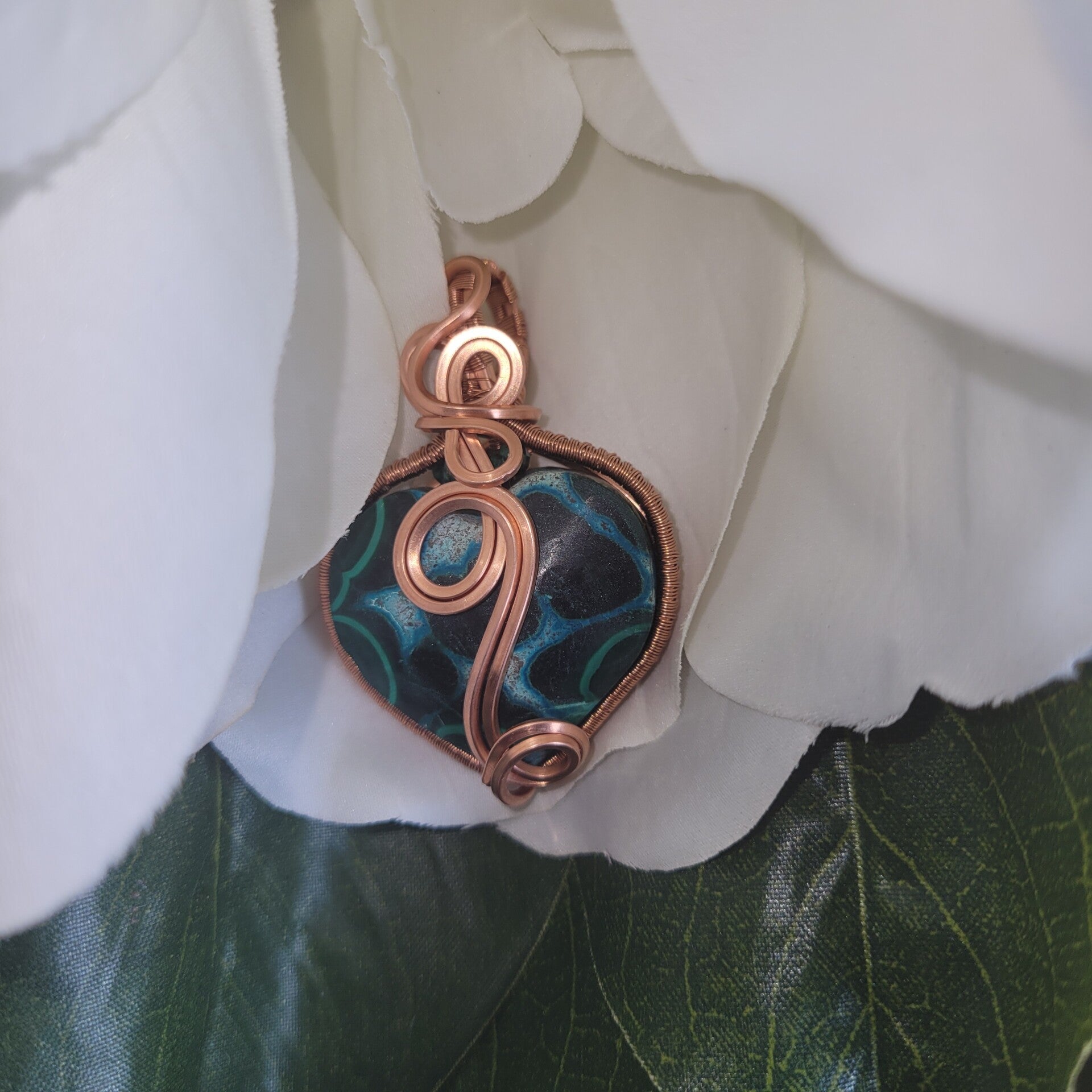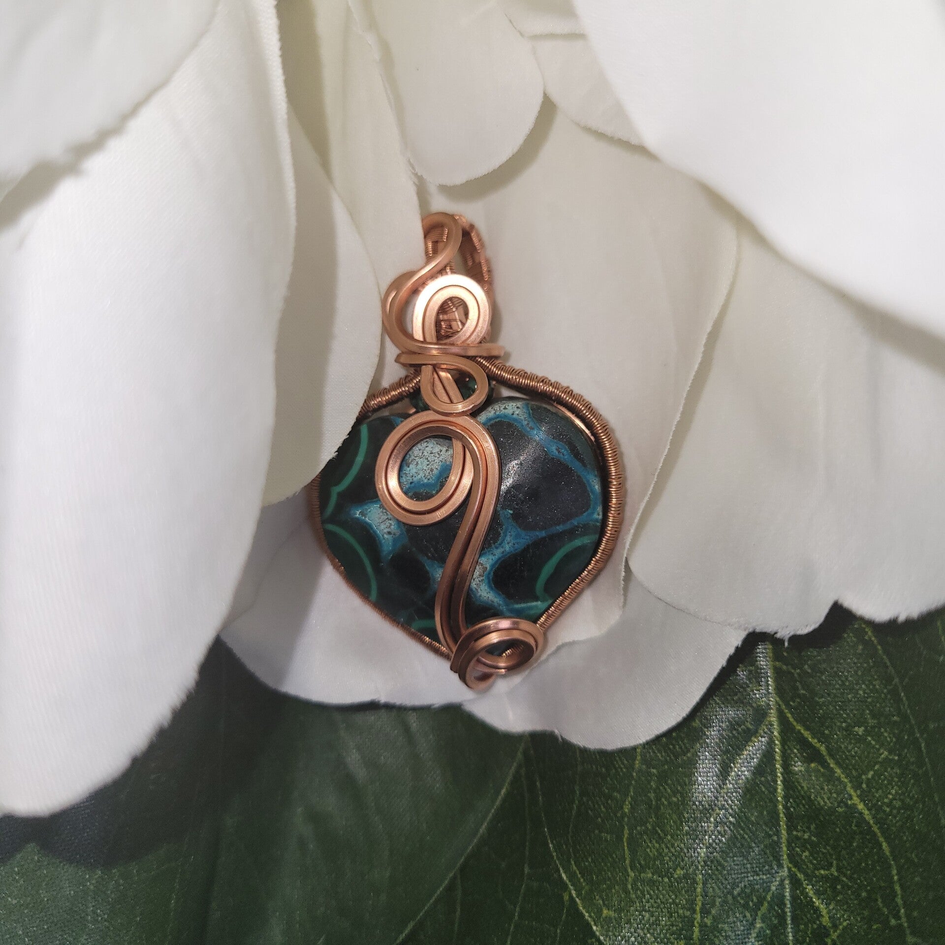 Hand-wrapped in pure copper, Myriellé carries an elegant spiral design flowing across the center of the heart — a sacred symbol of growth, healing, and the unfolding journey of the soul. Copper is known as a powerful energy conductor, amplifying the natural properties of the stones while encouraging the free movement of energy through the body.