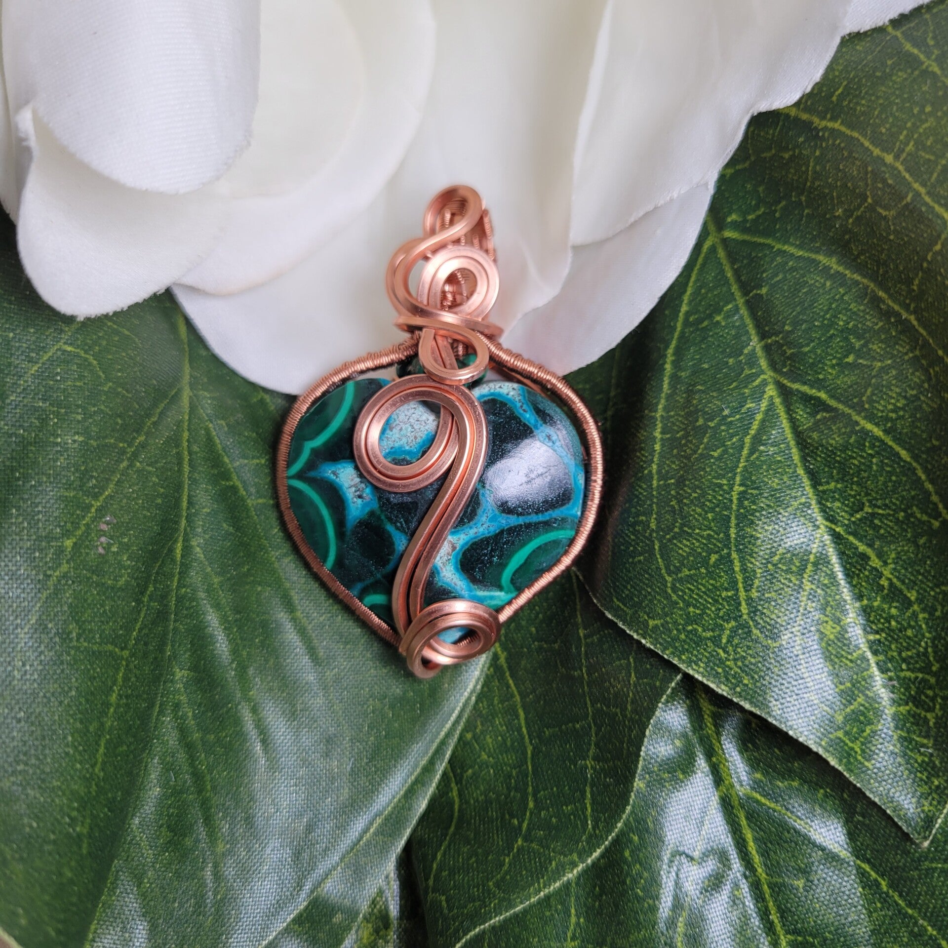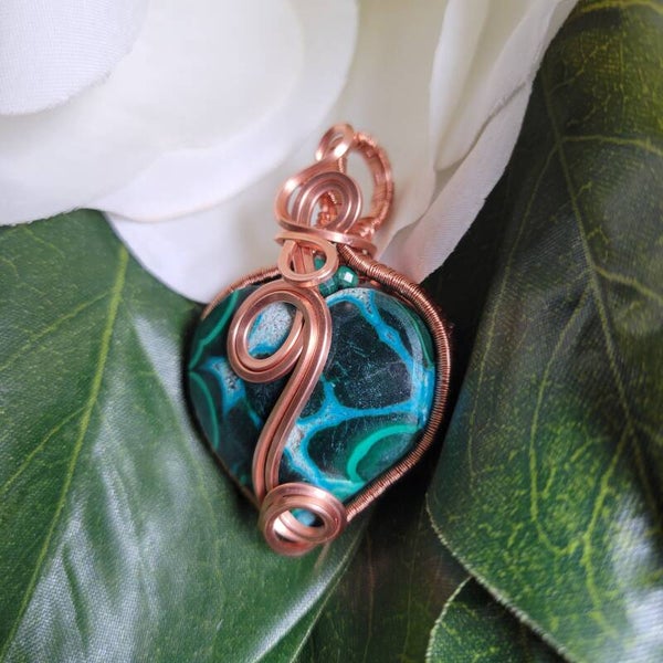 Myriellé is a striking heart talisman crafted from the natural union of Malachite and Chrysocolla, two stones long revered for their deep connection to emotional truth, wisdom, and transformation. Swirling shades of rich emerald green and oceanic turquoise move across the surface of the stone like waves meeting fertile earth, symbolizing the balance between courage and compassion.